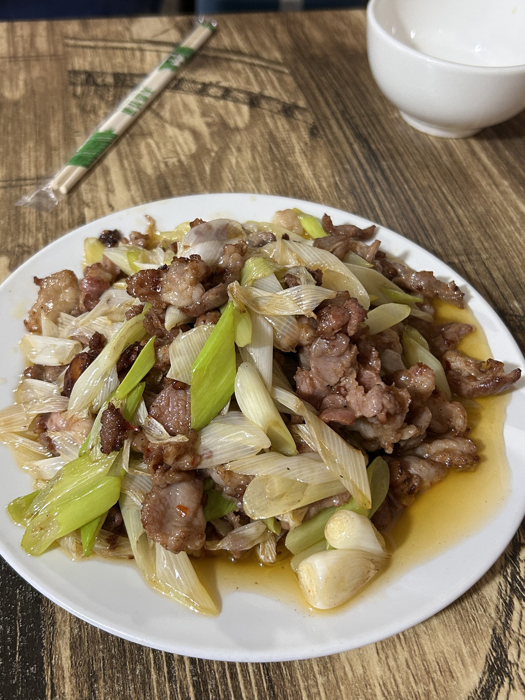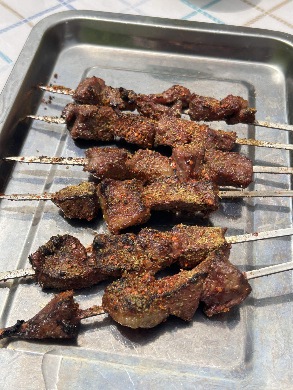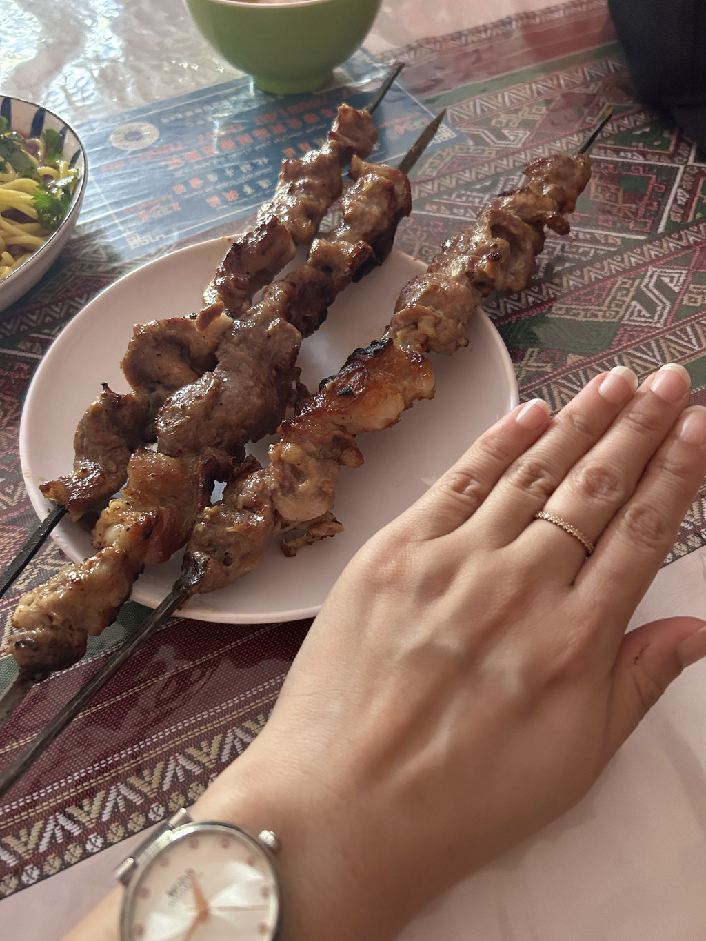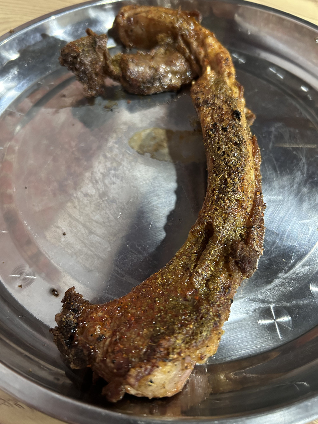 晚餐随意在民宿附近找了家餐厅-八号美食庭院,餐厅门面简单不起眼,此时店里还没有客人,一开始我们觉得是一家普通的餐厅,但在特克斯特色美食羊排揪片子上来后,喝上一口清甜的汤,吃上一口毫无膻味的鲜嫩羊排,着实惊艳,一大盆羊排揪片子我们吃了个精光,这应该是此次新疆行吃的最好吃的一道菜了;还有这家店铺的烧烤也很赞,尤其是油包肝,特别香,羊肝入口即化,一点都不腻;这家店很低调,来的客人不多,但是老板真的很用心,羊排用的是草原原生小羊羔肉,非常好吃,来特克斯一定要吃这家,强推。