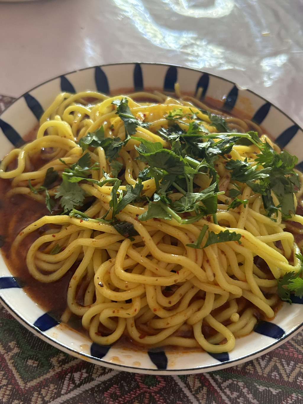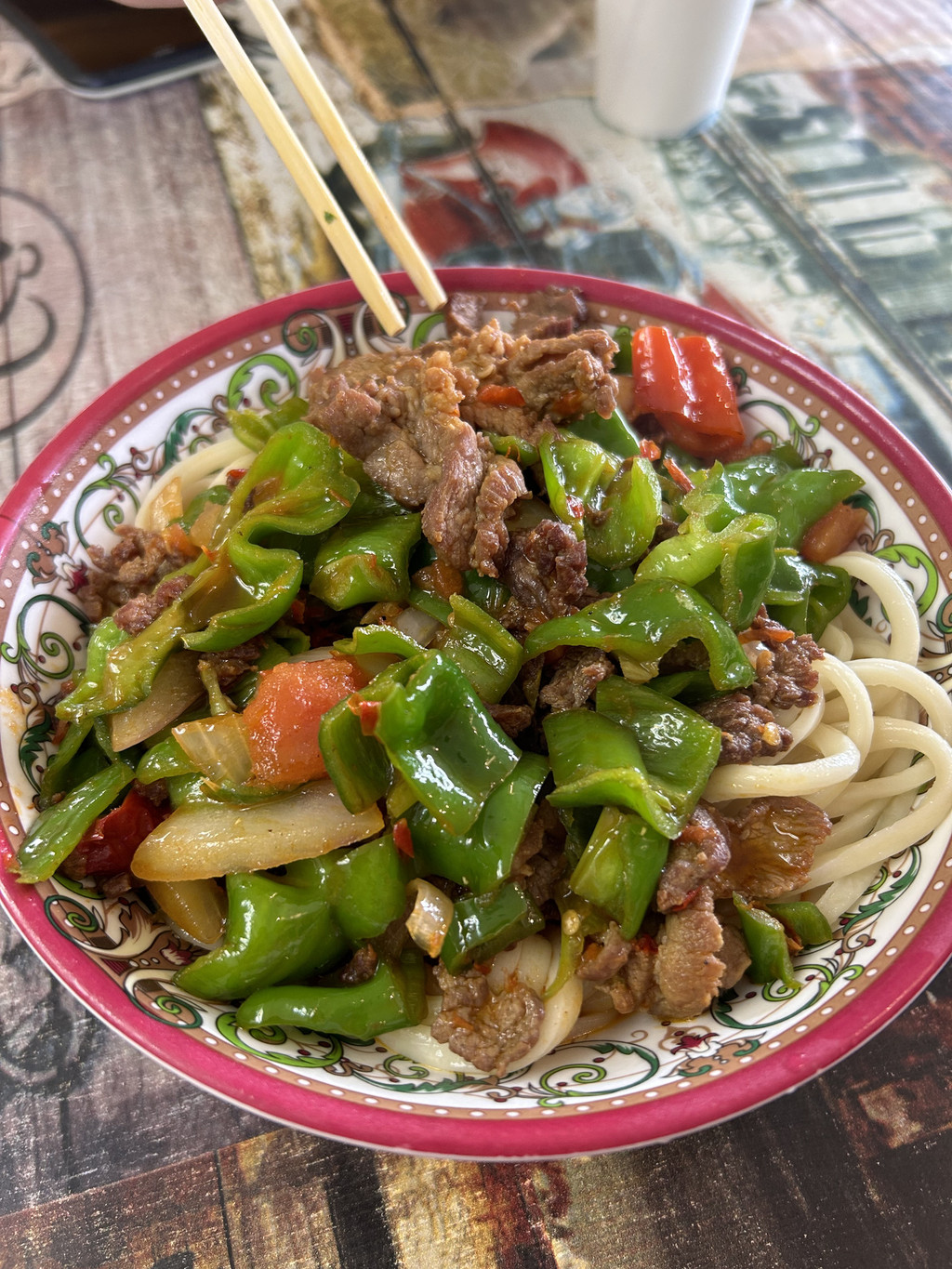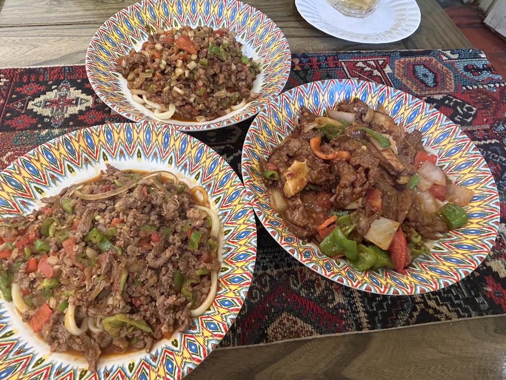 从和硕开始出发经吐和高速往吐鲁番,进入吐鲁番盆地,海拔逐渐降低,温度也越来越高,空气显得非常干燥,到达吐鲁番前,经过我国唯一零海拔城-托克逊,这里有号称新疆第一面的托克逊拌面,怎么也得停下来试一试,托克逊穆沙子餐厅是当地知名的拌面店,味道真是很不错,分量足,不愧为新疆第一面。