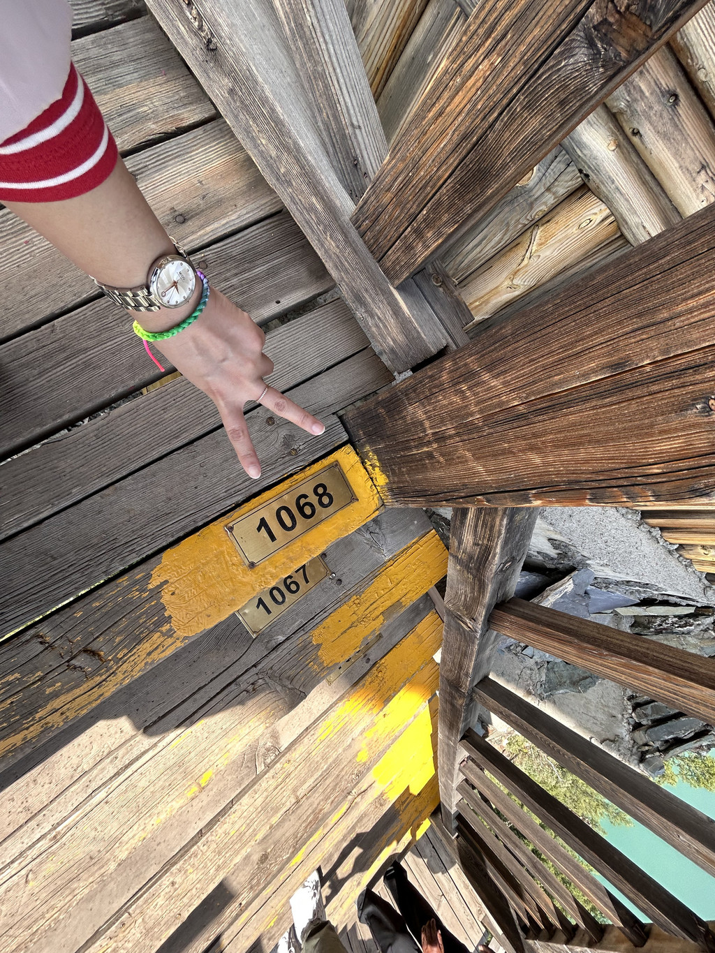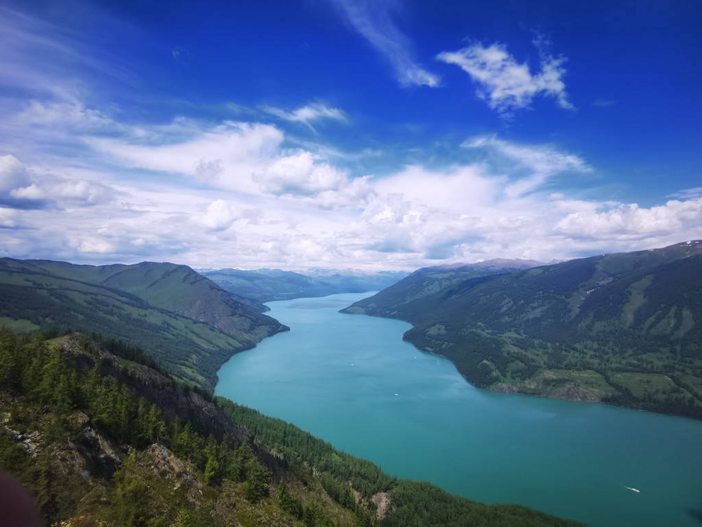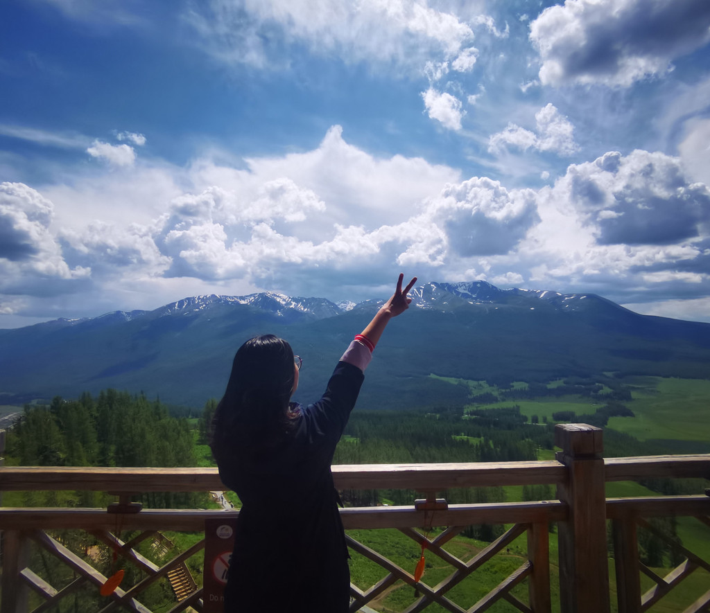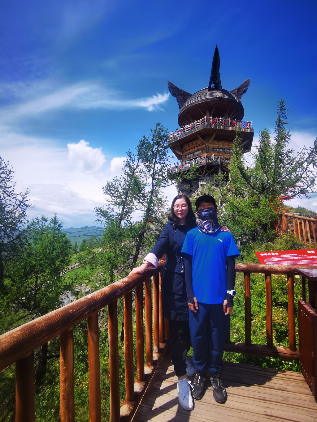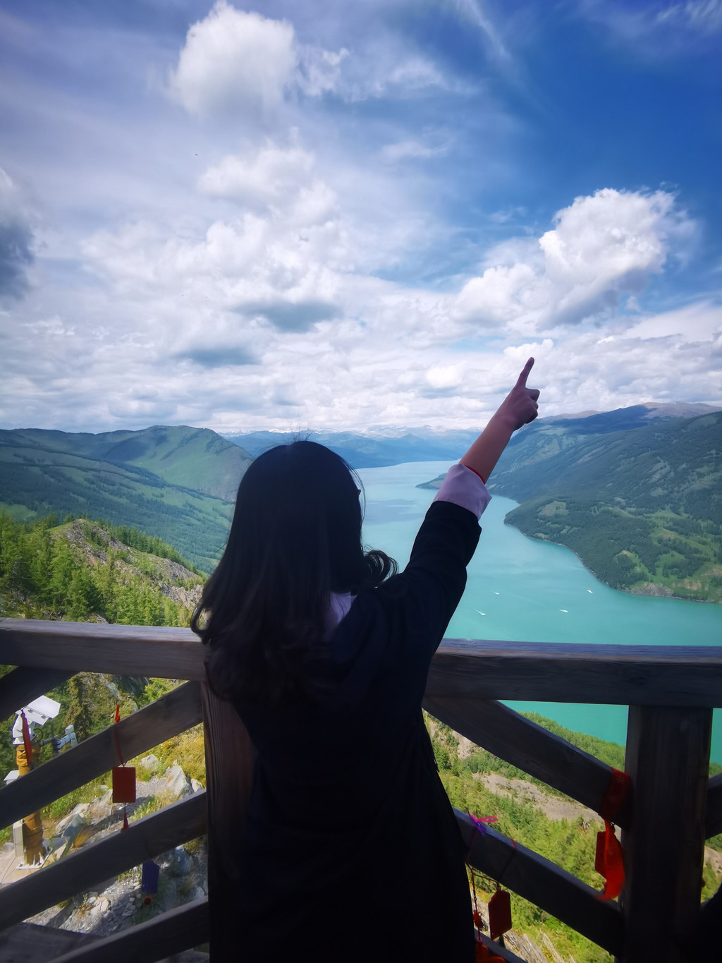 从观鱼台停车区往上要攀登1068级台阶才能到达观鱼台,祺妈很坚强,膝盖有伤不适也勇敢的登顶,棒棒哒;登上观鱼台所看到的风景,绝对值,眼前的美景照片远远无法表达,一定要说下,晴天请务必登观鱼台,爬不上去也可以骑马,晴天的观鱼台看到的喀纳斯湖全景以及周边的雪山美景,很赞;如果天气不佳,那效果差得很多,我们准备下山时已开始有乌云过来,喀纳斯的天气多变,风景好坏真看天(还好我听了祺妈的话今天就上来观鱼台,本计划明天来的,结果明天是一个阴雨天,景色差了非常多,听媳妇的准没错,哈哈)。