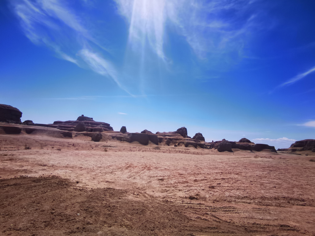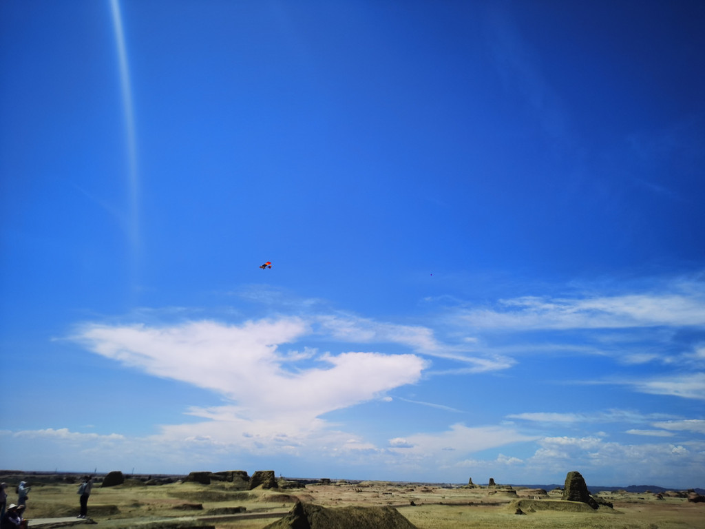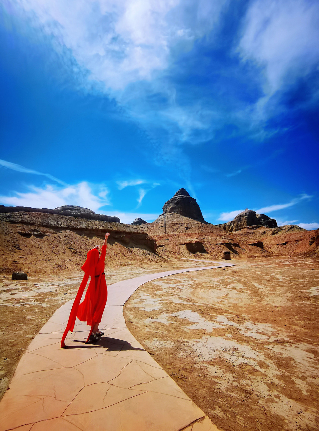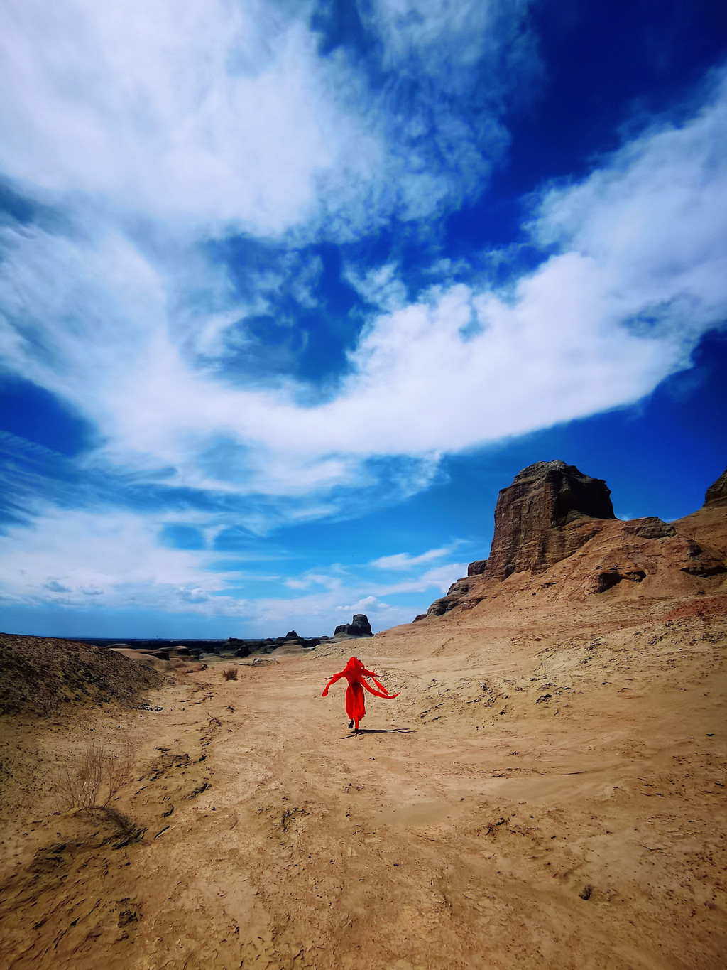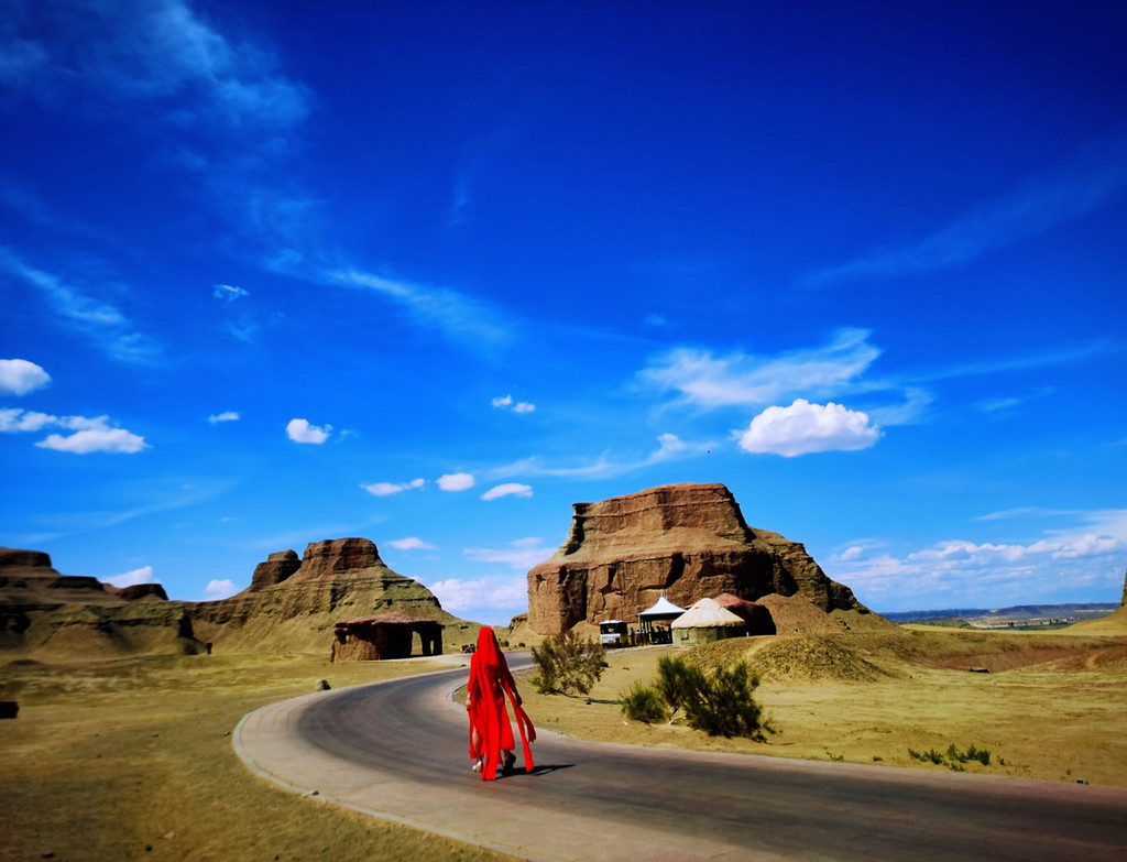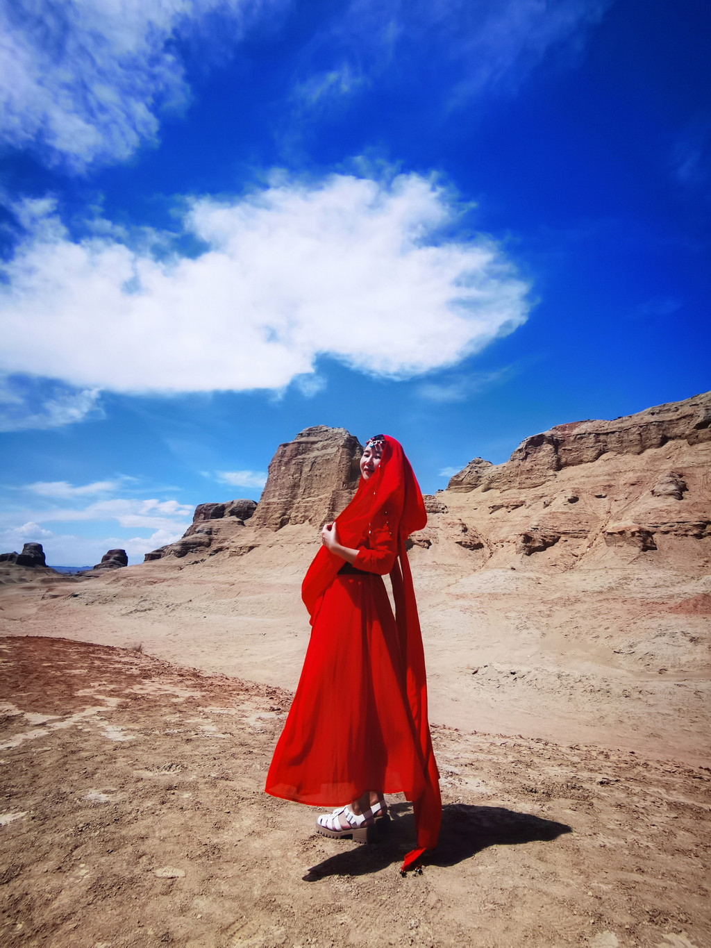 布尔津县城出发,驱车约3个小时到达乌尔禾魔鬼城,乌尔禾魔鬼城又称乌尔禾风城,是间歇洪流冲刷和强劲风力吹蚀共同作用形成的,位于克拉玛依市区东北110公里处的乌尔禾油区,方圆约10平方公里,这里是典型的雅丹地貌。名为魔鬼城实无魔鬼,皆因风蚀的声音以及各种风蚀地貌所营造的氛围,魔鬼城各种景象,真可谓千姿百态,绚丽多彩,形成了一个梦幻般的迷宫世界,“布达拉宫”、“吴哥窟”、“罗马斗兽场”、“富士山”、“路南石林”......古今中外的名山胜迹应有尽有;“石猴观海”、“黄牛耕耘”、“雄师横卧”、“小猴摆尾”、“大鹏展翅”......各种各样的造景地貌琳琅满目,惟妙惟肖,置身魔鬼城定能使你形象思维的特长得到最大限度的发挥。魔鬼城一定要晴天来才壮丽,如果能够选择落日时分来那别有一番风情,我们到的时间刚好是大中午,说实在天很晒,但是这时候的蓝天白云加上魔鬼城的雅丹地貌那真的非常适合拍照,强烈建议女生一定穿红色的服装,尤其是红裙超级出片。