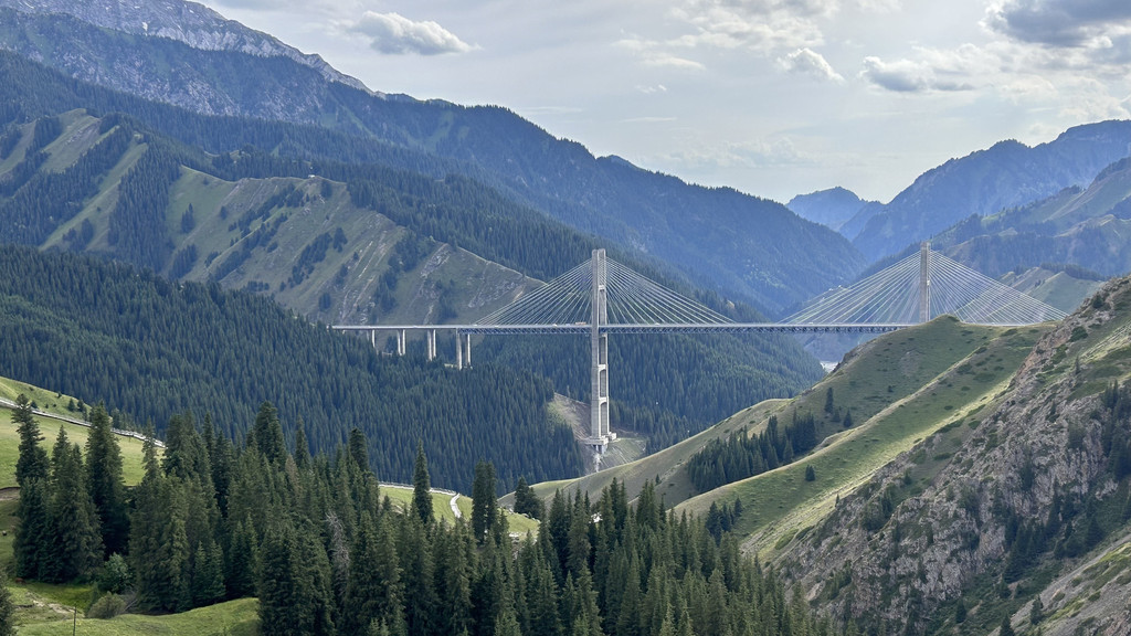 赛里木湖南门出去,右转不要上高速的方向,右转果子沟方向,很快就开到“伊犁第一景果子沟”的大门,从这个大门开进去,将会至少经过四个观景台,精华在第三和第四个观景台,基本上能够较好的拍到果子沟大桥。