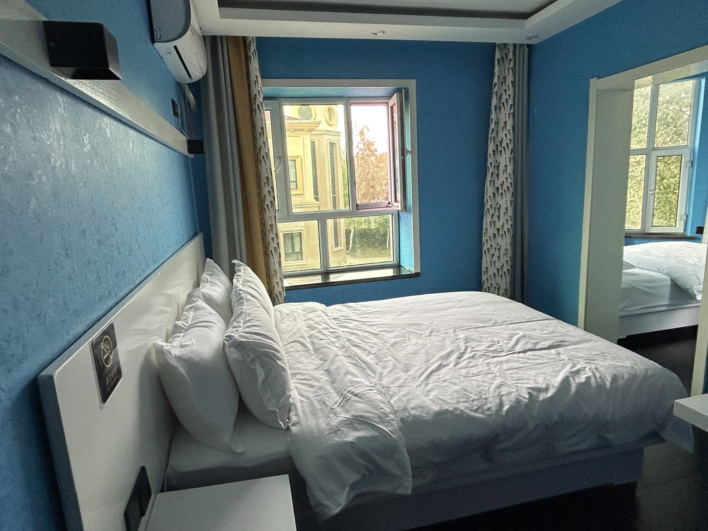 为一栋三层别墅改造的民宿,以蓝色为主调,很好看,我们在前往喀纳斯前和返回布尔津都住了一晚,都定了亲子房,差别在一次为半地下室,一次为二楼,亲子房都分成两个房间,很不错;半地下室,有一个透气天窗,采光和通风没问题,二楼亲子房空间更大,其中一间房还是一个大圆窗,光线很好;老板很热情,虽然没有电梯,但会帮忙搬行李;民宿院子可以停车,实在不行民宿外的也可以停车,都不收费;民宿里俄罗斯风情街和老码头夜市很近;这是一家很值得推荐的民宿。