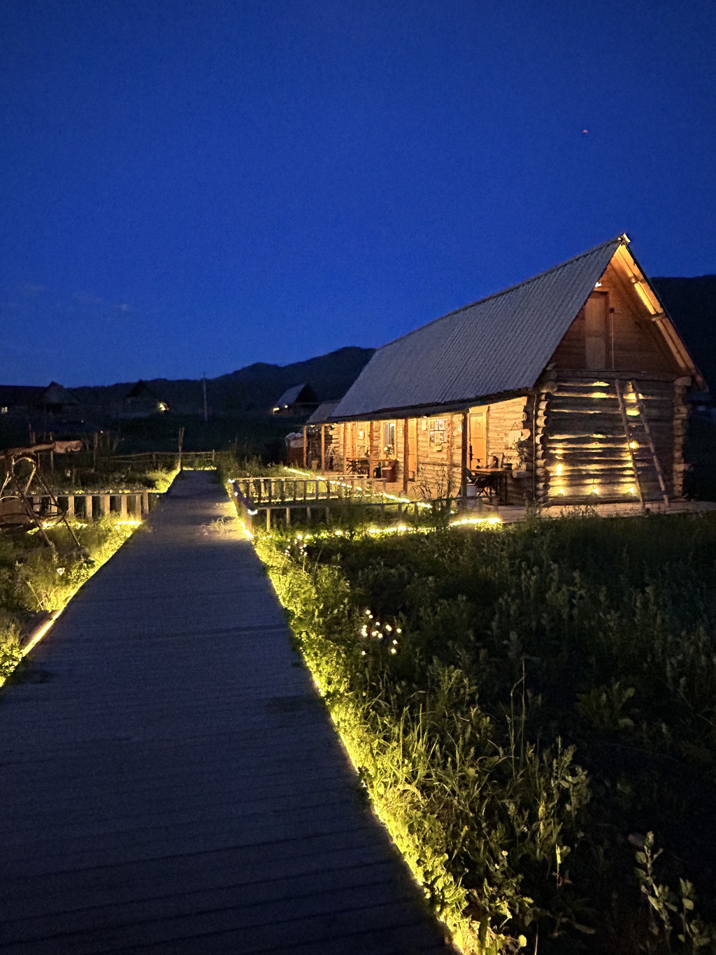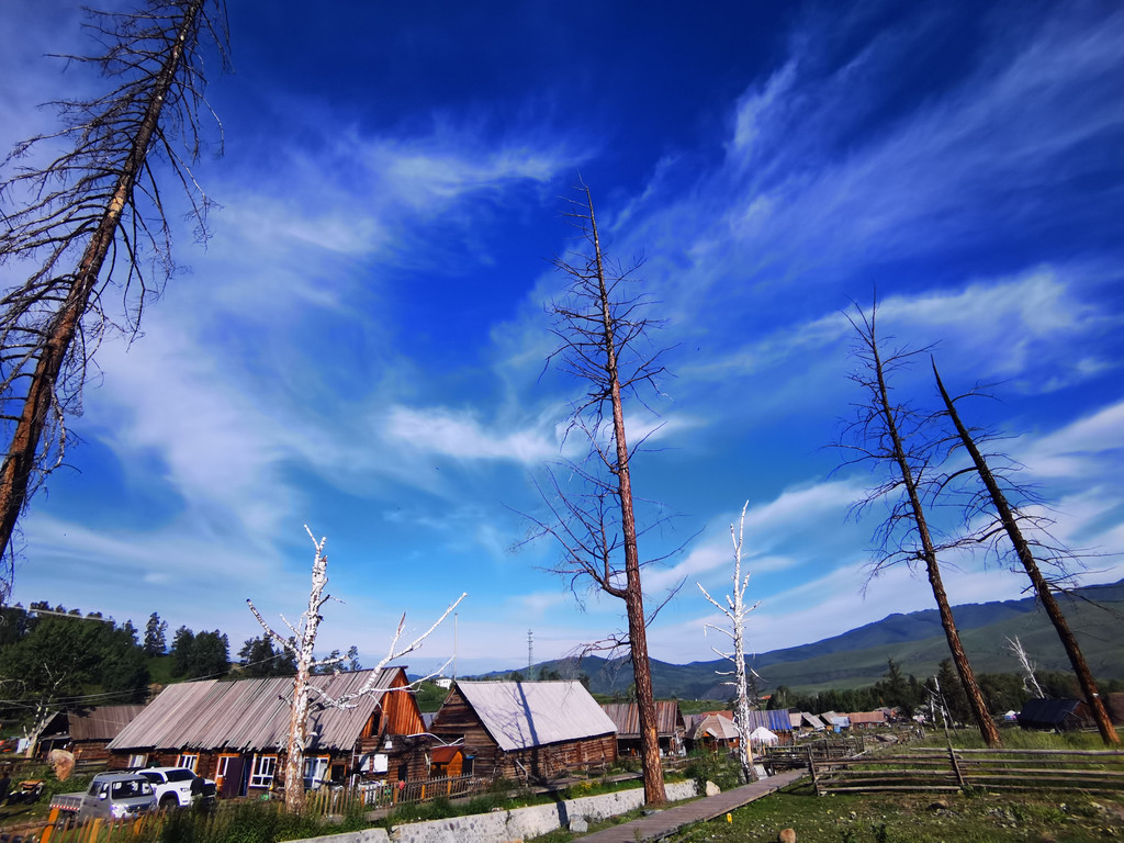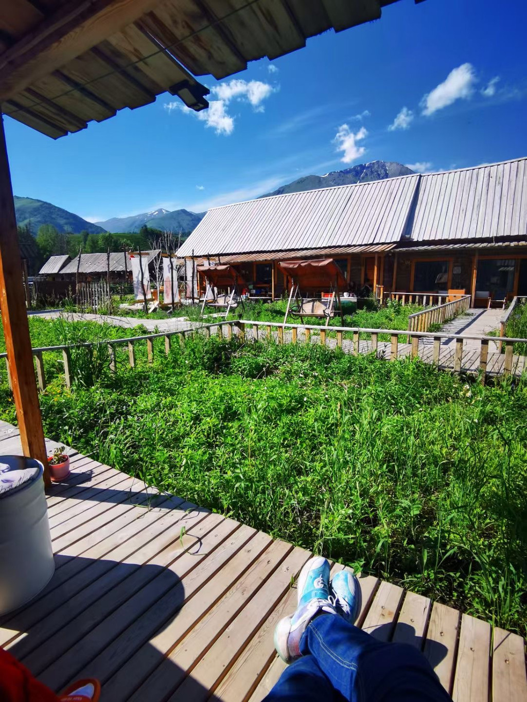 印象中的禾木村是个静怡的小村庄,不过今年暑期新疆游大热,禾木也是大家的一个必达的目的地之一,故进入村庄后发现游客还是挺多的,据说以前的禾木多为散客,现在团客也占了很多,不过还好的是禾木一般留宿的多为散客,傍晚和清晨人相对少很多。我们选的民宿位于禾木桥往东方向,相对远离禾木村主干道和餐饮区,没有人来人往的吵闹,人烟稀少,能体验一番小村的静美,午后在民宿小木屋前安静的看看书,喝喝茶,很是不错。