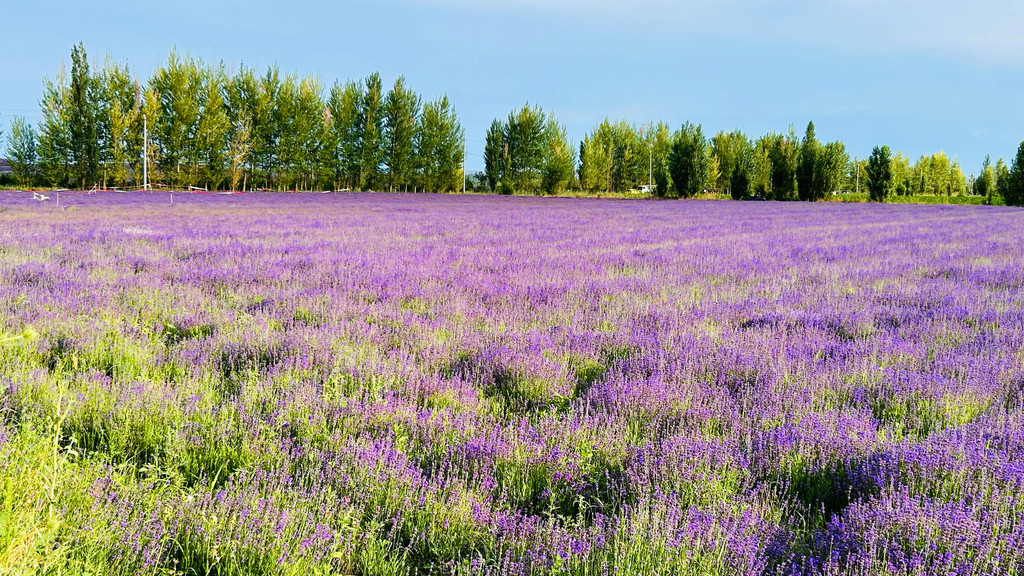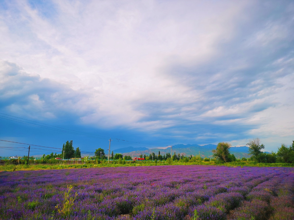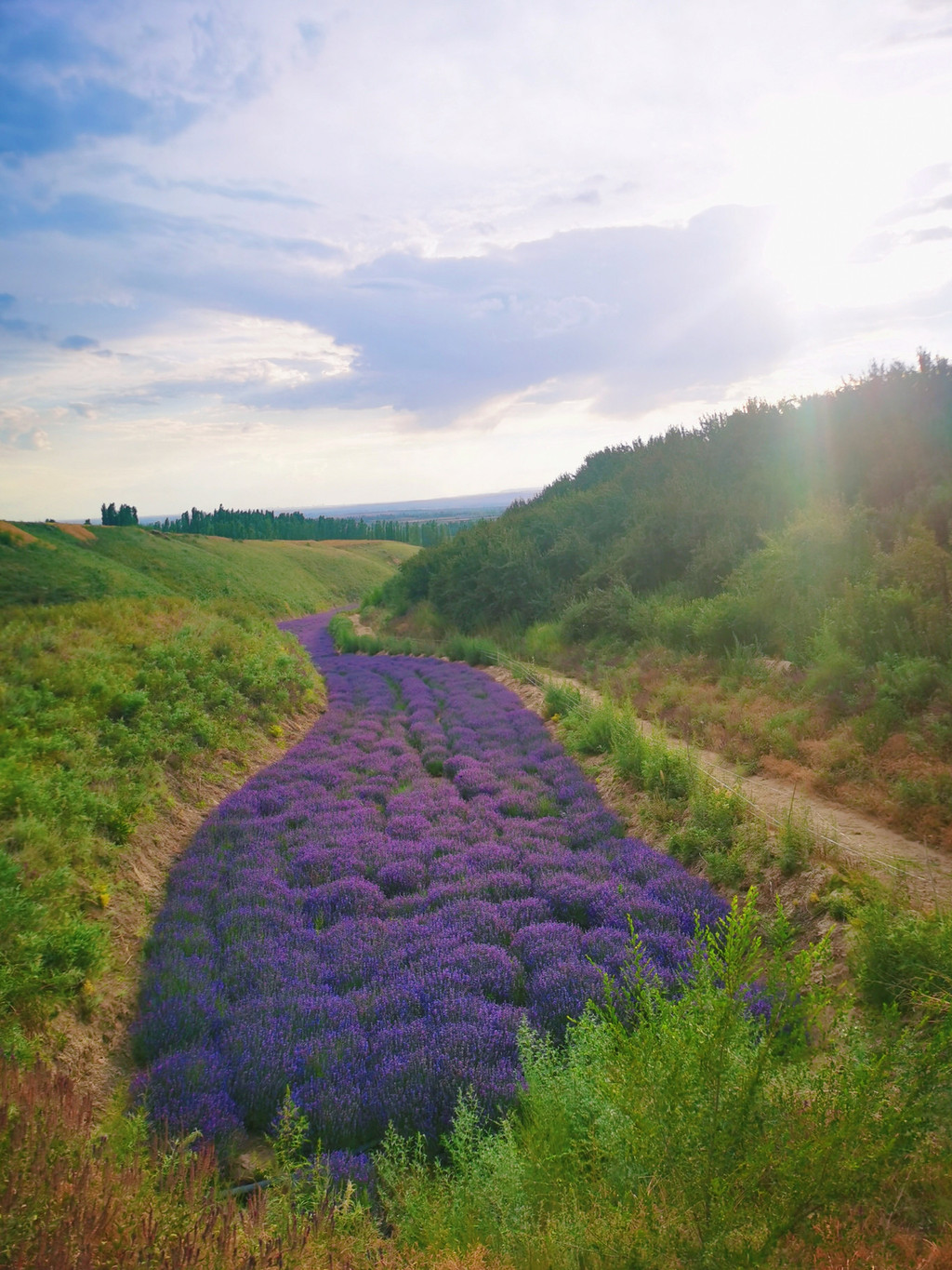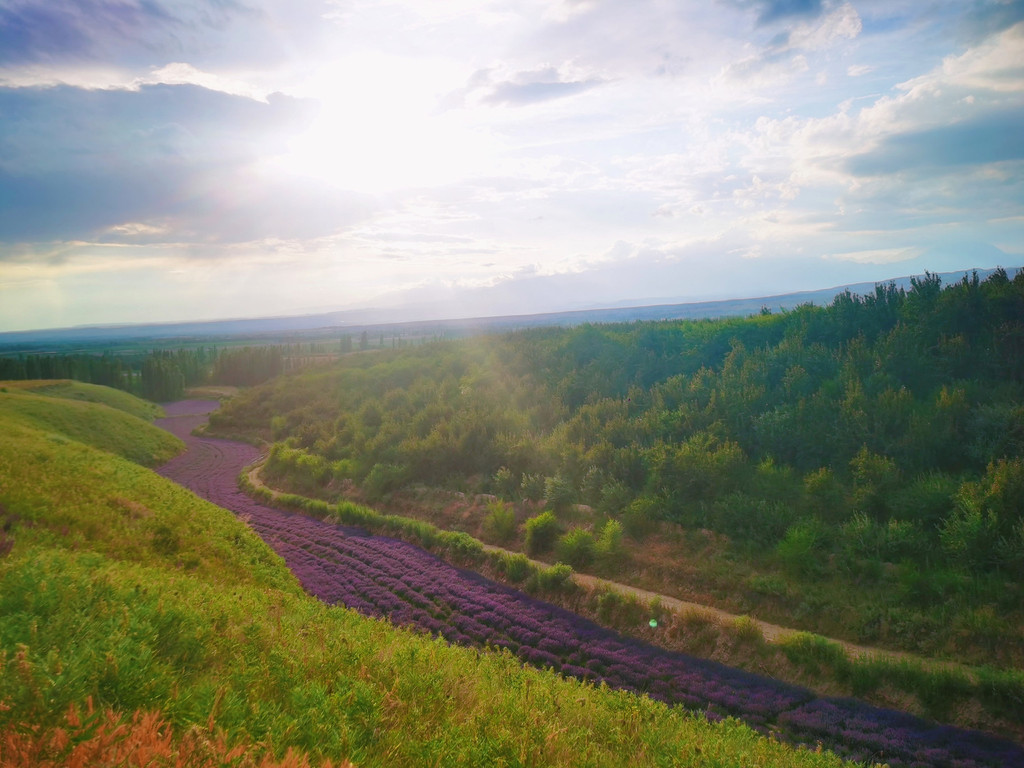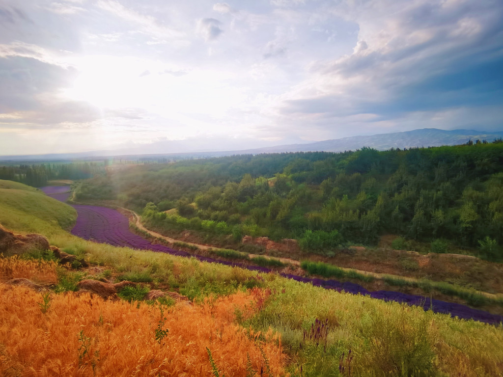 继续驱车往伊宁市方向,大约2小时车程到达霍城晃晃村,进入村口,村道两旁便是一片片的薰衣草田,有已绽放的还有含苞待放的,紫色的花海很是漂亮,一路都可以闻到薰衣草花香。我们没有去如解忧公主等有名的薰衣草田,这次来晃晃村寻找后山野山谷的薰衣草河谷,这是一个极小众的薰衣草景点,算是私人薰衣草园,从晃晃村村道进入,导航老葛薰衣草,经过一段土路,不算难走,大概10来分钟左右到达。薰衣草河谷从上便可以拍到,今天天空一般,不过薰衣草河谷还是很特别和漂亮的,如果要近距离和角度好点,需要购票进入,我们没有进入,觉得差别不大,忘记门票多少了。河谷上方的山坡上还有一大片麦田,夕阳下,金黄的麦田,也是很美。
