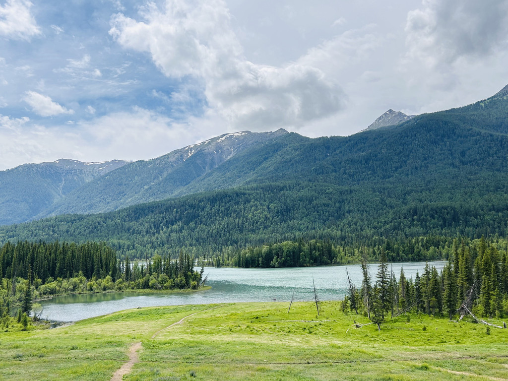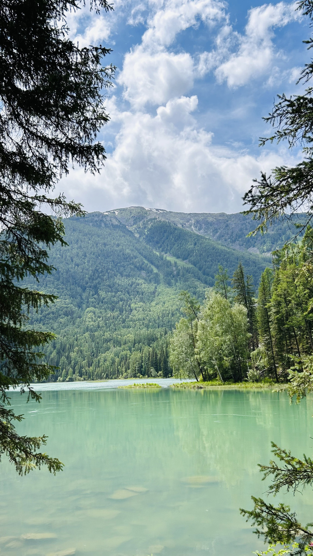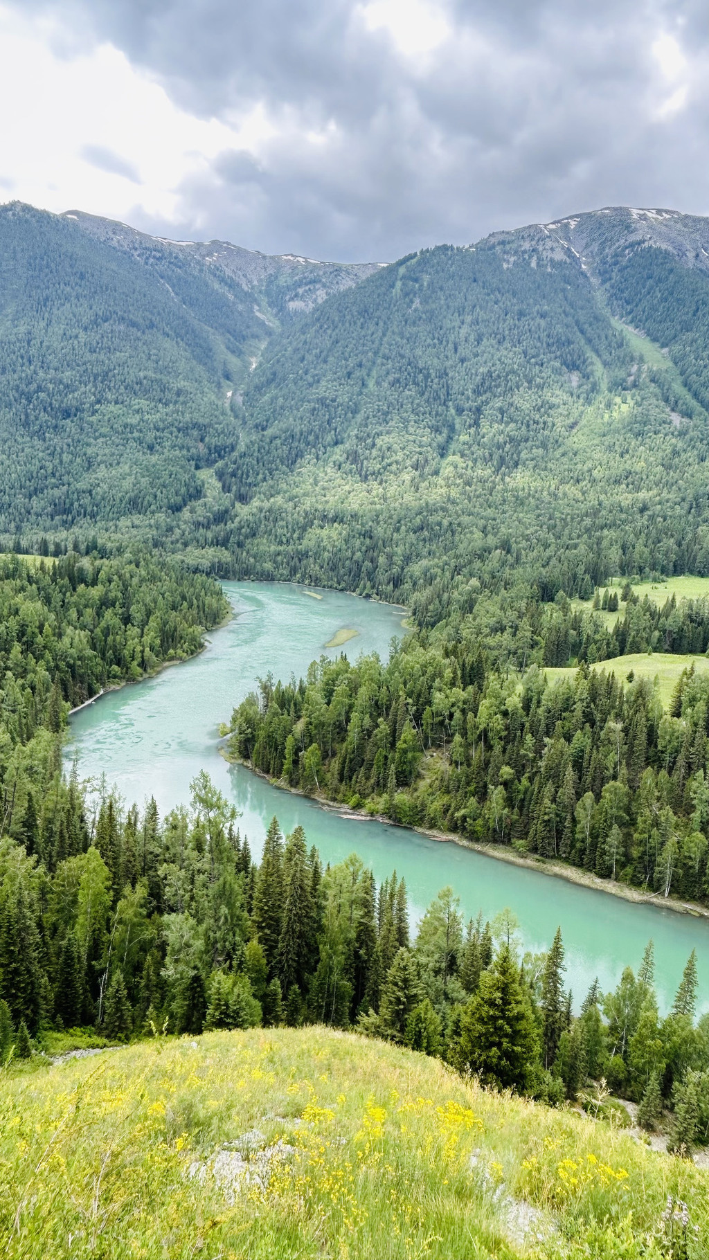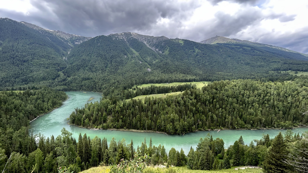 喀纳斯湖区间车途径喀纳斯老村下车,午餐在老村解决,下午天气仍是以阴天为主,时有小段蓝天出现,看来今天的喀纳斯三湾无法看到最佳状态了。从喀纳斯换乘中回贾登峪门票站,将分别经过喀纳斯三湾,首先经过神仙湾,这是一个晨雾观景点,非晨雾时间景色并不出彩,可以稍微停留打卡即可。接下来到达喀纳斯三湾最美的月亮湾,也是喀纳斯景区的宣传片最多入镜景点,虽然天色不佳,不过月亮湾的美还是掩盖不了的;从月亮湾至卧龙湾的河畔步行路线是喀纳斯三湾的精华,边走边拍边欣赏,需要1个小时多,需要木栈道上下,需要点体力,从我们这次的经验来说,如果不是晴天,不建议徒步,景色相对不出彩,建议还是区间车到点下车附近观景台欣赏拍照即可,省时省力。
