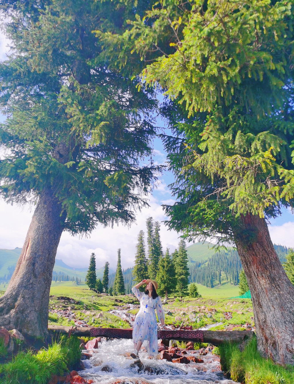 那拉提空中草原路线门票95元,区间车40元,往返45公里,路线:游客中心-天界台-天牧台-游牧人家,建议如果司机可以,中途站点不下车,直接坐到终点站游牧人家,这里的也能看到前几站的风景,还有独有的网红桥、雪山、溪流等,且早上第一批区间车进入那拉提,直奔游牧人家的话,网红桥打卡拍照的游客较少,基本只有住在景区内的人会比你早到,我们今天早上算是第一批进入的游客,虽然中途因该区间车需要在天界台返场接入口处游客,我们只能在天界台下车,后续我们搭上后一辆区间车,直奔游牧人家,下车整个站点没人,空荡荡的,步行10分钟直达网红桥位置,人真的不多,大约几组游人在拍照,等待大约15-20分钟就排上了,而且人不多,大家也不催促,可以相对自由和宽松的拍照,这里有个温馨建议,由于担当摄影师的人最佳的角度需要站在溪流上,为避免弄死鞋子,建议穿防水性较好的鞋或者干脆如我直接穿上洞洞鞋不怕水,就是水很冰凉,站久了很冻,网红桥顺利完成,便一路沿着溪流往上走,也有好几处适合拍照的区域,这个时间没有什么人,可以自由发挥。