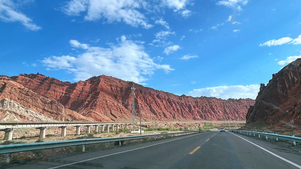 出那拉提景区,驱车前往独库公路,那拉提草原至独库公路中段入口的道理正在修路,车辆排队情况较长,但有交警指挥疏导,很快也就通过拥堵的施工路段,进入独库公路,我们从独库公路中段,往南直奔南段终点库车。独库公路,宛如一条巨龙盘卧天山。这条全长561公里、北起独山子,南至库车,穿越天山山脉,连接南北疆的公路,横亘崇山峻岭、穿越深山峡谷,连接了众多少数民族聚居区。它的贯通,使得南北疆路程由原来的1000多公里缩短了近一半,堪称是中国公路建设史上的一座丰碑。独库公路每年仅6-10月份开发,仅允许7座以下车辆通行,这也就限制了大旅行团的到来,沿途风景极佳,可欣赏火红干燥的克孜利亚山地景色,神秘险峻的峡谷风景,连绵的天山雪山山脉,天山腹地茂密的植被和游牧风情及浩瀚的草原景色等,穿越一条公路可以依次领略四季不同的风景,被称为此生必驾的公路之一。
