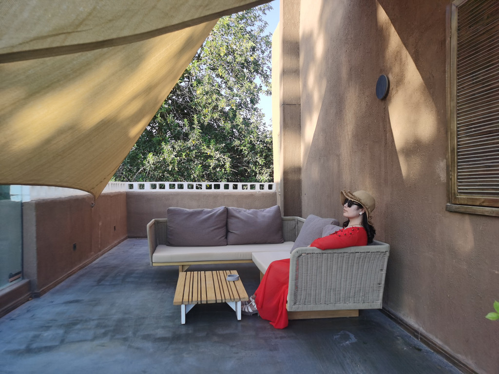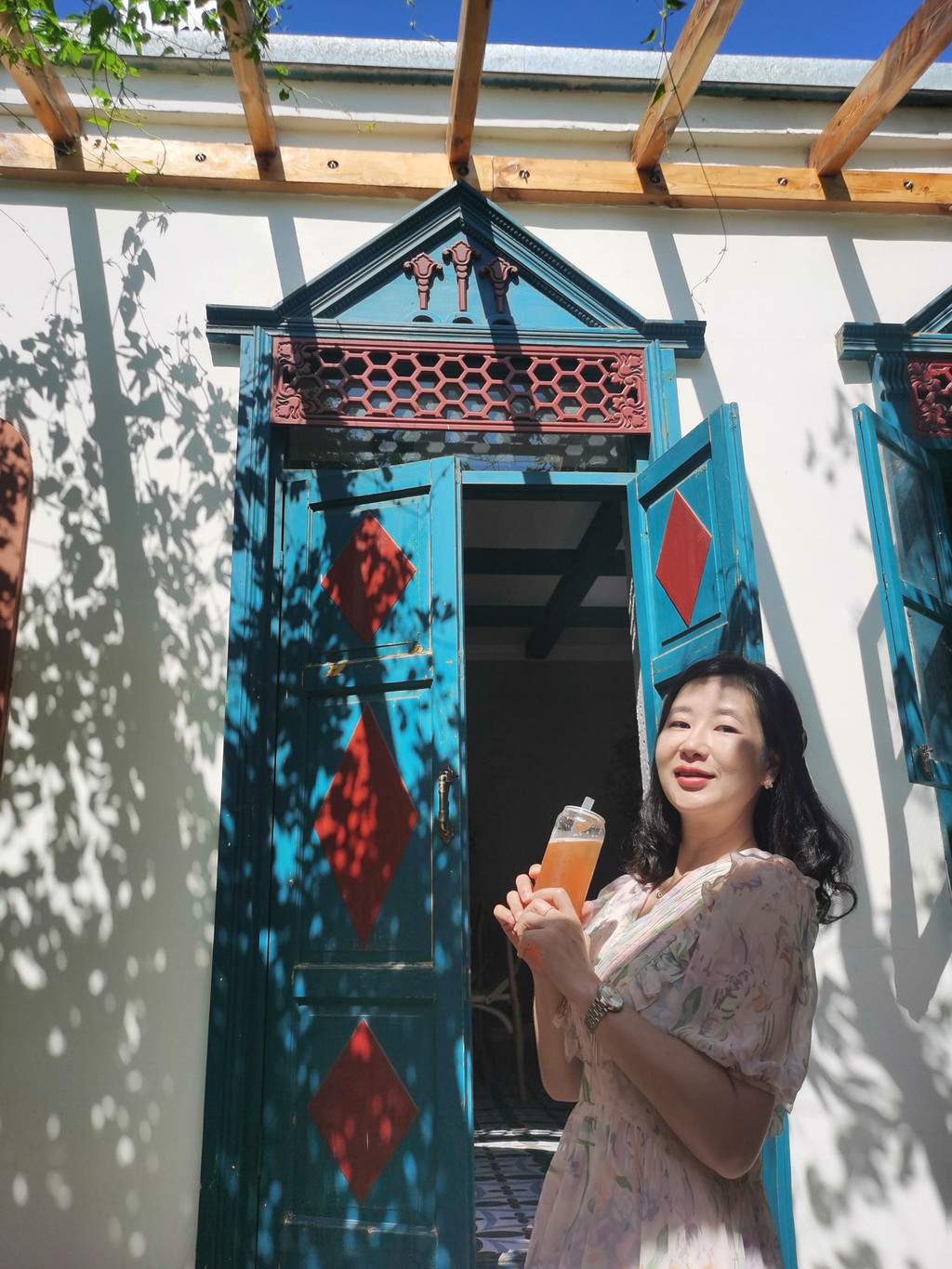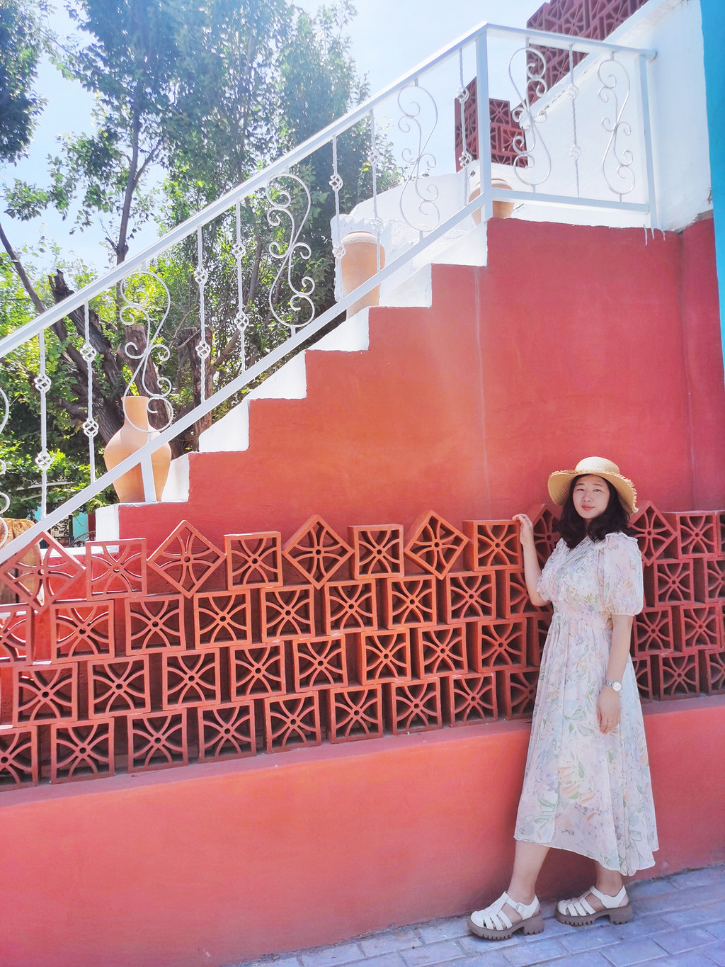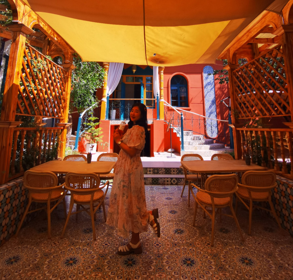 从三个桥村驱车1个半小时回到吐鲁番,现在火州已开始发威,室外已经40度左右,决定前往葡萄沟躲高温,可以导航八风谷不走葡萄沟景区大门,从侧门向保安说明要去八风谷喝咖啡,保安会要求出现订单或者打店铺电话,我们准备打电话时,保安未再进行检查便放我们自驾进入了,这样就可以不用购买门票进入葡萄沟的青蛙巷了。八风谷是葡萄沟景区内的一家很美丽的民宿,设计非常好看,很好拍照,民宿旁是他们家的咖啡店,门口有免费停车场,这个炎热的午后,我们就在这悠闲的度过,喝喝咖啡、看看书。