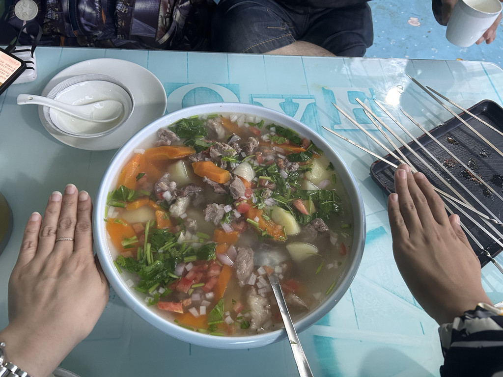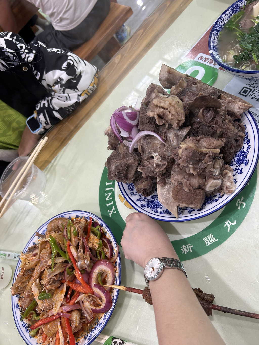 大约19时前抵达北屯北国春城酒店,因为计划去乌伦古湖,且由于已经乘坐较长时间的飞机,故第一天开车,没有直接再往前开2小时左右到布尔津,选择在北屯市休息下,新疆的第一顿正餐选择了北屯市新疆丸子汤店,第一次点新疆菜,不大估得清分量大小,点了中份的牛骨头、小份的椒麻鸡、大份的丸子汤,一上菜,尤其是牛骨头,那分量,我们就知道今晚会吃撑了,牛骨头一定要趁热好吃,凉了显油腻,椒麻鸡味道赞,丸子汤祺哥给喝了精光,美餐一顿,超市采购点食品和水,以便后续自驾之用,回酒店好好休息下。