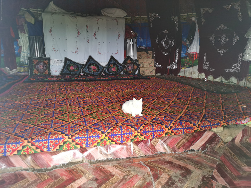 走着走着天气变化很快,乌云盖了过来,早晨的艳阳也躲了起来,感觉要下雨了,我们从溪流走上木栈道,准备回程,不料走到一半,雨就哗啦啦的下了起来,还好附近一处哈萨克人家好心让我们在她们家的毡房躲雨。等了大约30分钟,雨渐小,但是天阴沉沉的,已不复早上过来的草原美景了,这时的游客也多了,网红桥处已经排得非常长,我们走到游牧人家站点时,和来时空荡荡完全不同,已经站满了游客,真庆幸我们早出发直奔这里。
