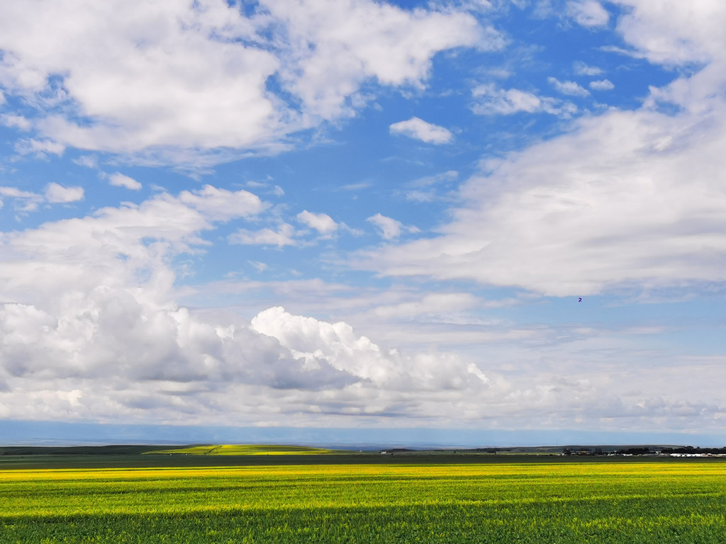 今天有点阴雨,穿行在伊昭公路上,周边雾气蒙蒙,宛如穿行在云雾之中,虽没有蓝天白云的靓丽,但也有烟雨朦胧的秀美,沿途可以看到美丽的雪山,辽阔的大草原,壮丽的峡谷,连绵的树林,成群的牛羊,险峻的道路也不算啥了;拐道八卦城方向,意料之外的经过一大片油菜花田,路两旁都是油菜花,恰好此时太阳从云中出来,蓝天和白云,映照着下面黄橙橙的油菜花海,真的极美,感恩路上可以遇到如此美景,弥补伊昭公路未看到蓝天花海的遗憾。