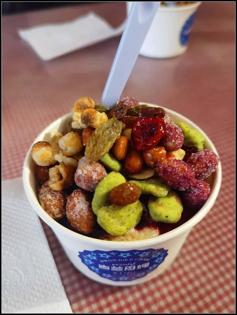 这家店生产的冰激凌味道好,买一杯冰激凌9.9元,可以免费搭配二三十种各类干果和果酱,性价比很高。