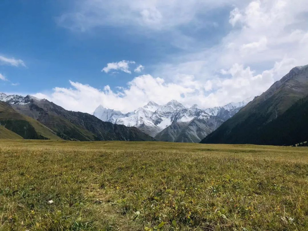 一条宽阔的河流哗啦啦流过,目之所及都是被流水刷得圆圆的石头。河水来自冰川雪水,自高处来,自是势不可挡,在巍峨的山峰之间硬生生冲刷出一片开阔谷地。