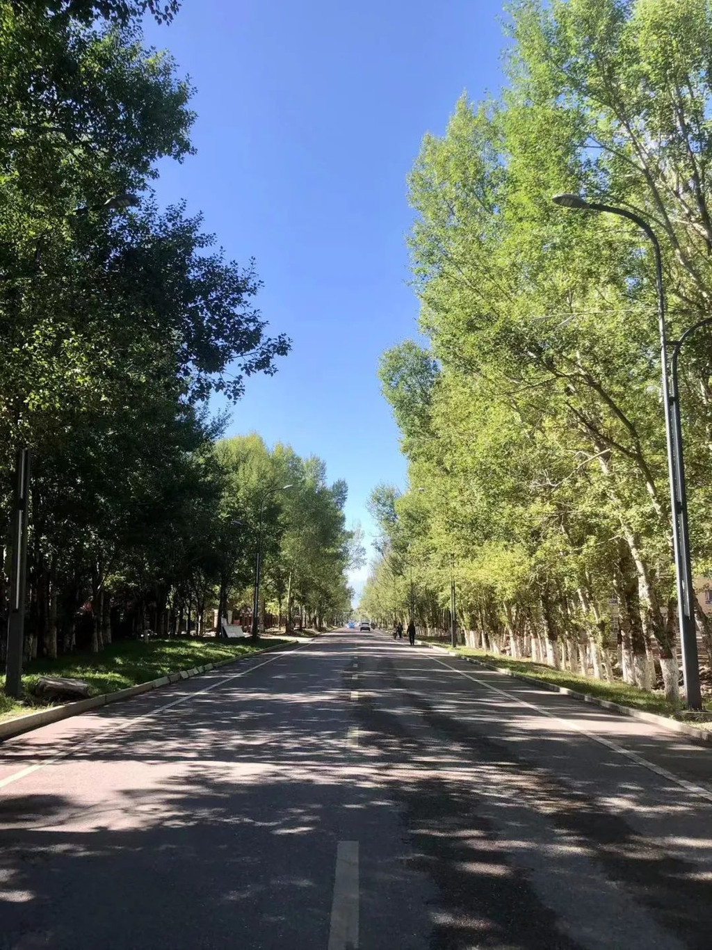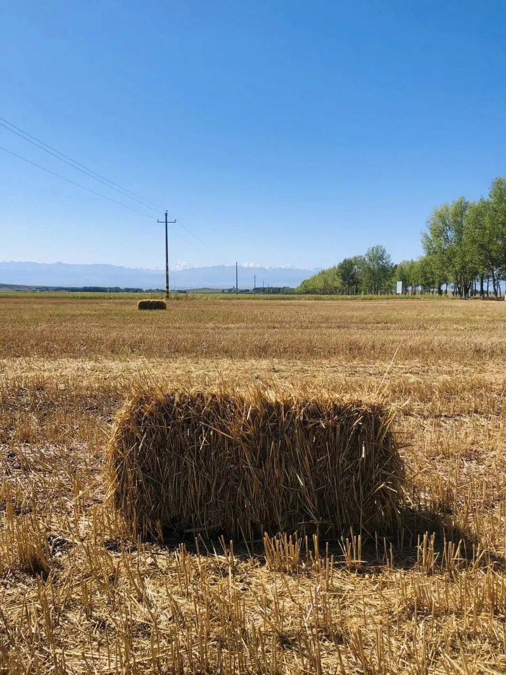 返回昭苏城后,天气豁然开朗。昭苏县城不大,走一走就能到城郊,笔直的马路似乎通往雪山,道旁就是金色的麦田,堆着麦垛。蓝蓝的天,空旷的路,骑上共享单车,非常适合在田边发疯。