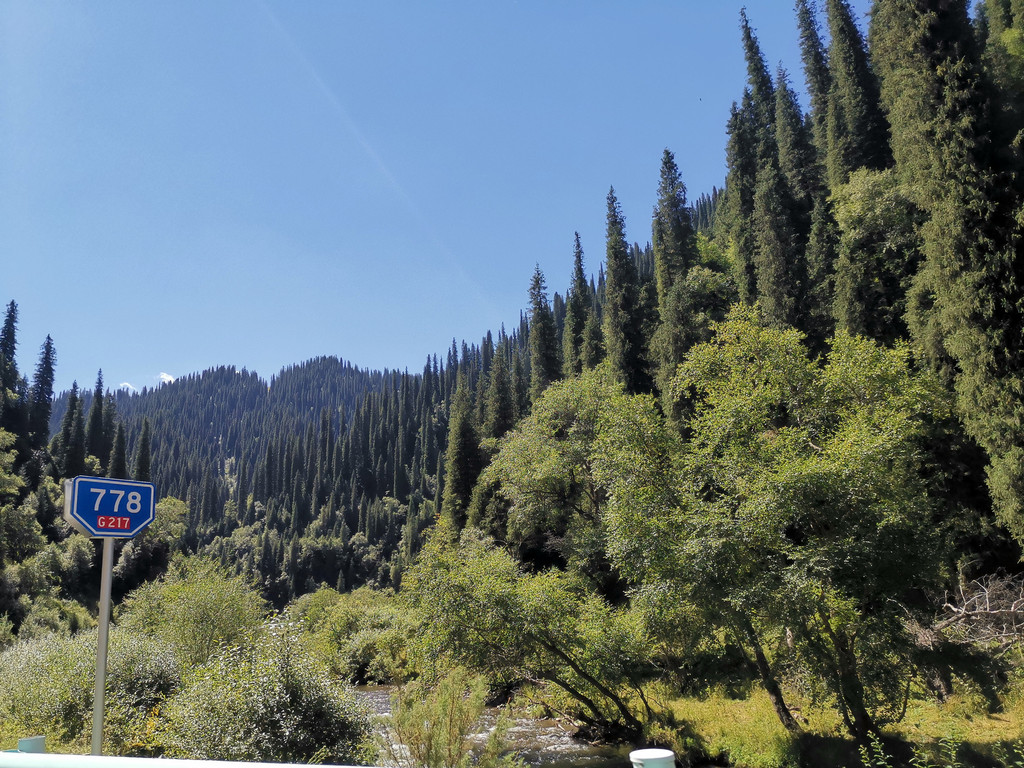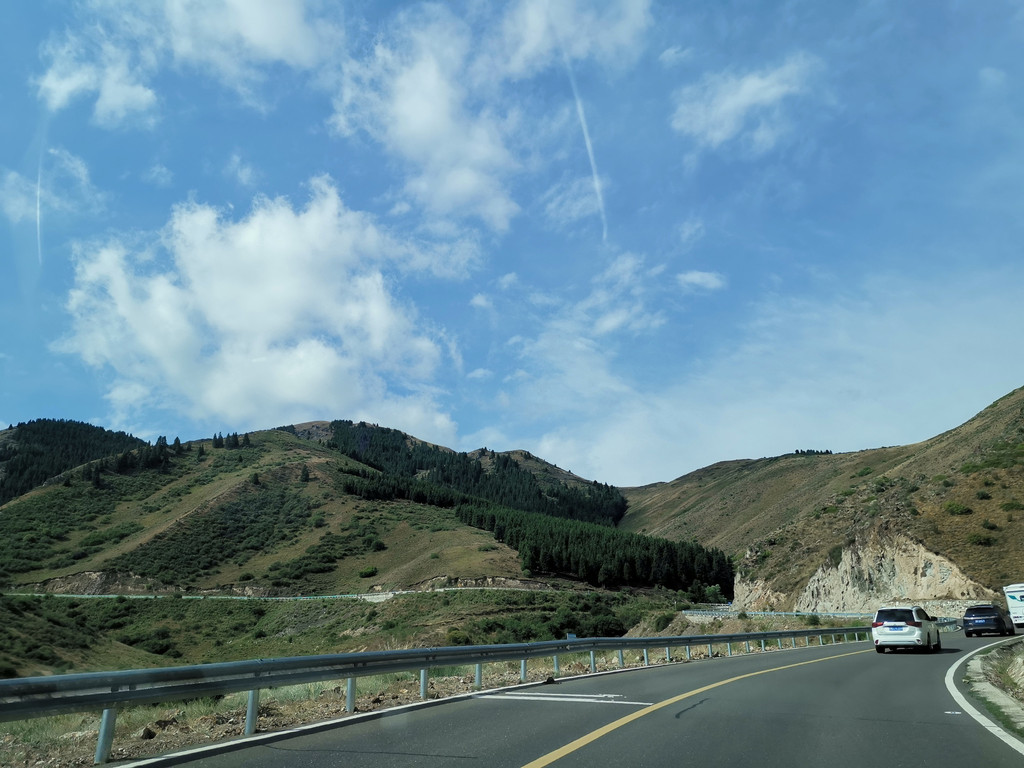 过了那拉提镇,有一段在修路,然后就沿着山沟里的公路蜿蜒前行,突然导航里传出“沿独库公路继续前行”的话语,才知道原来我们已经走上了独库公路。