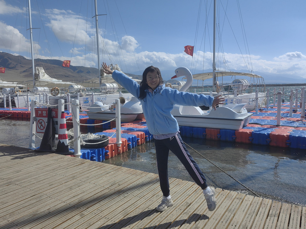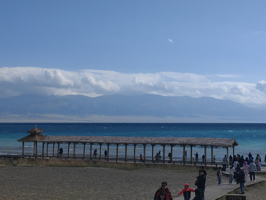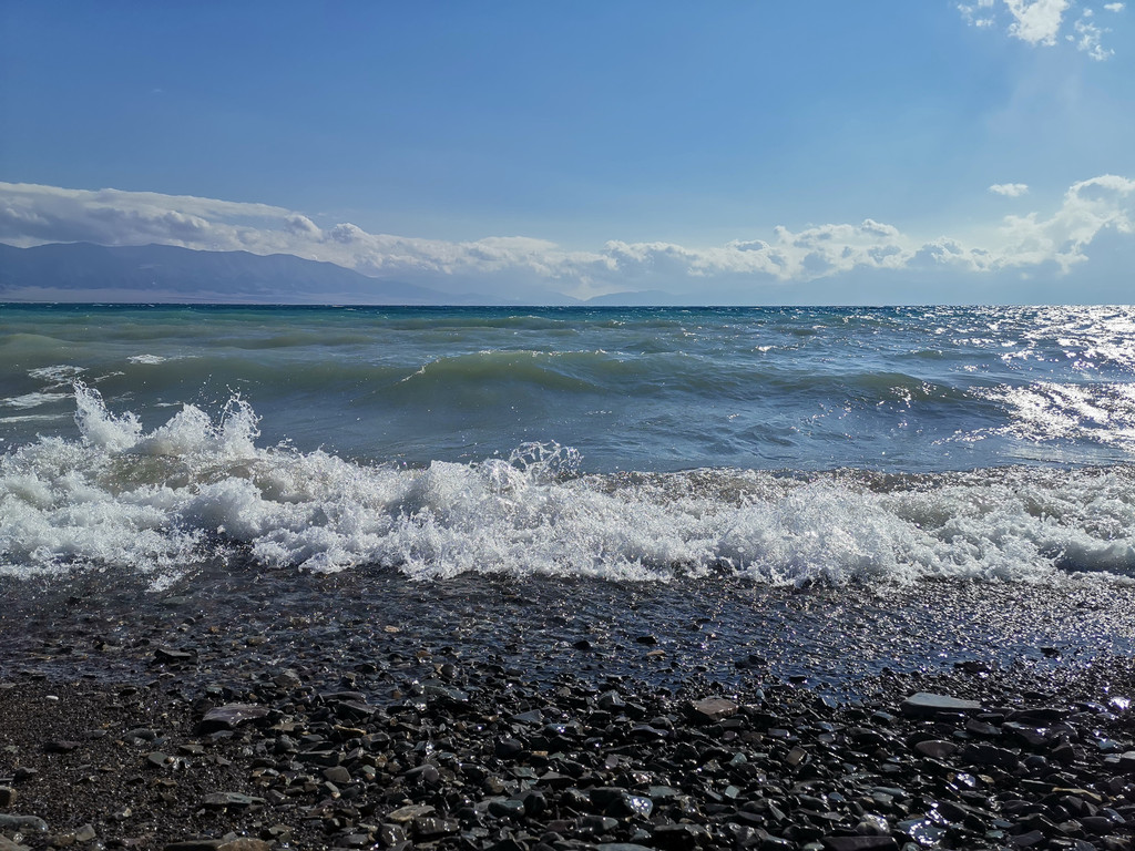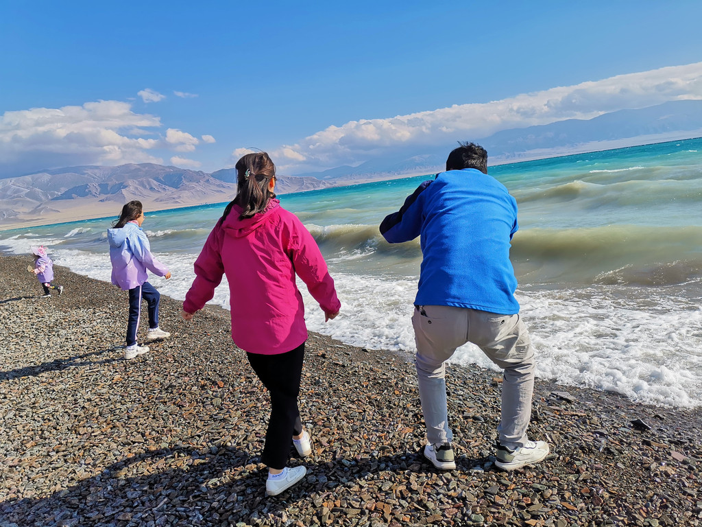 继续往前走,选了一个湖面比较开阔,有木栈道的地方把车停下,到湖边去看浪花,扔石头。湖水由远及近颜色变化层次明显,又是风又是浪的,很有种到了海边的感觉。如果不是风太大,体感冷,应该会沿着木栈道多走多玩的。
