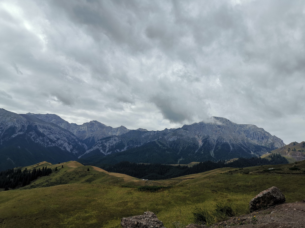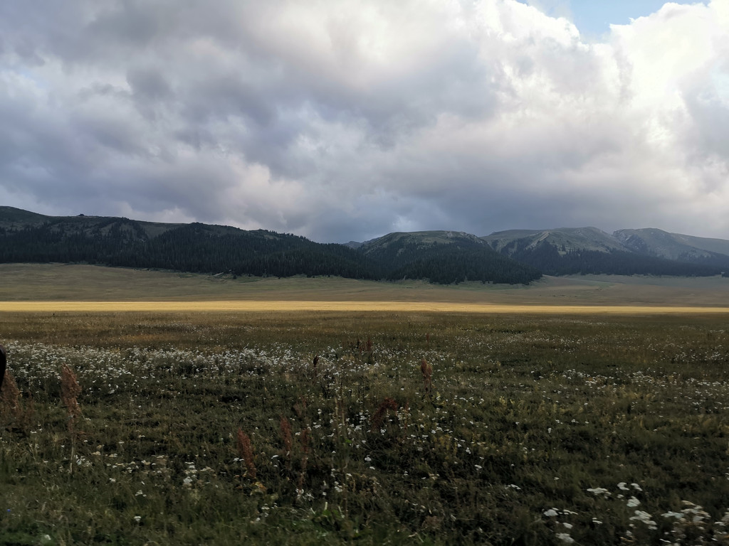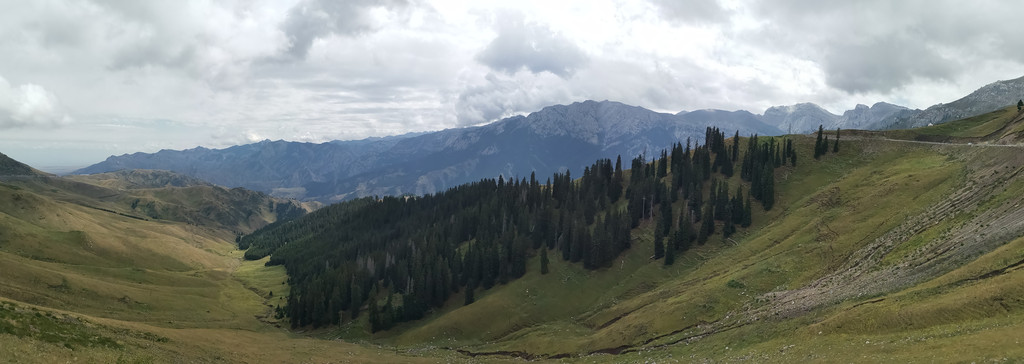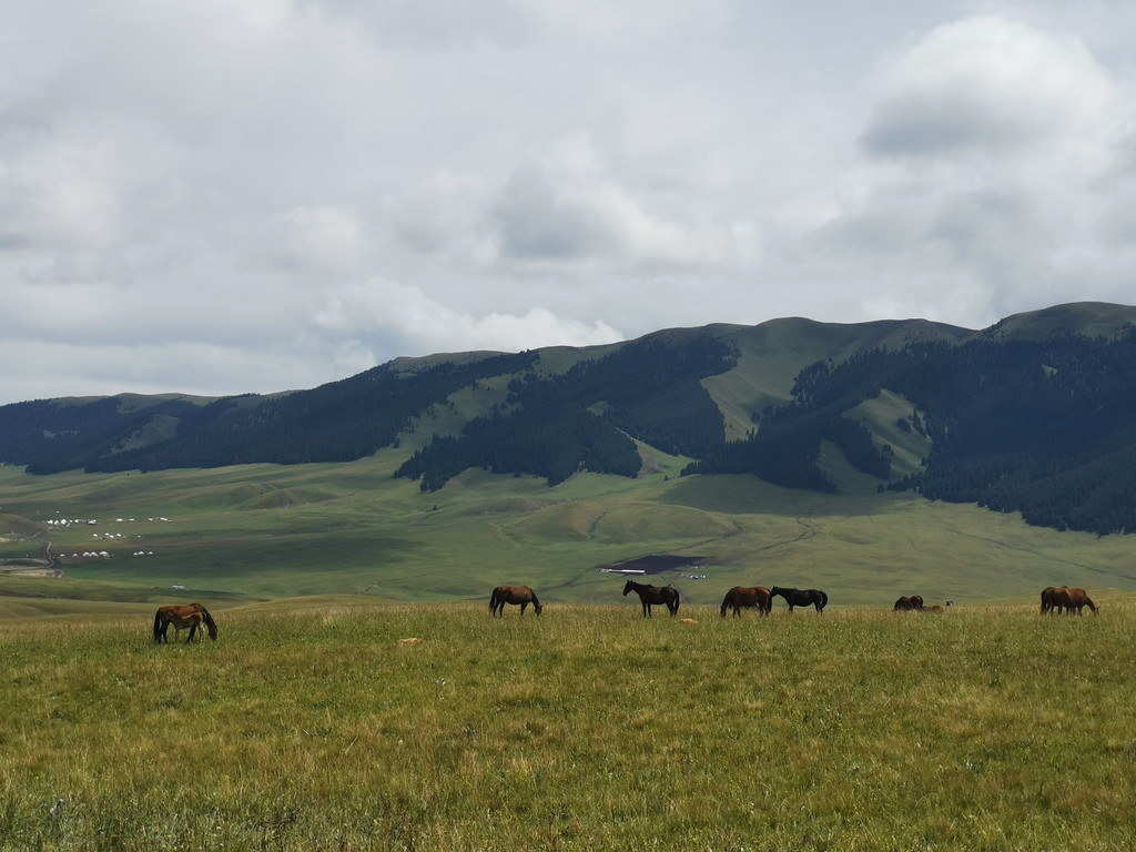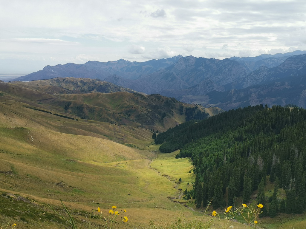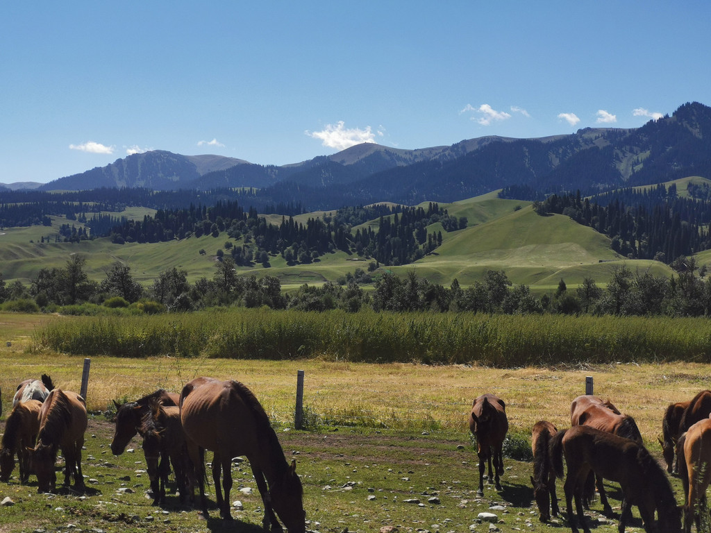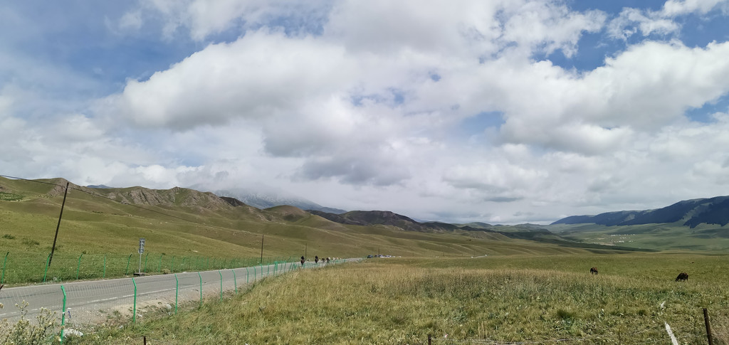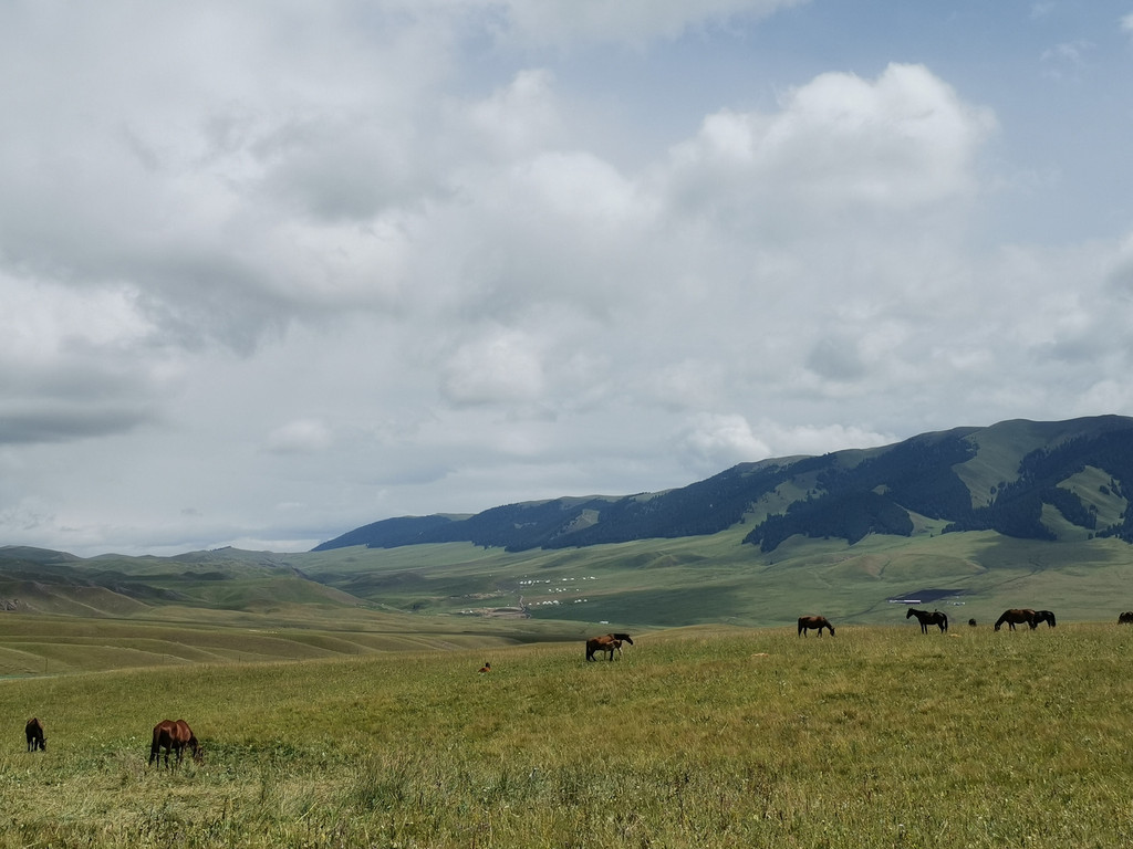 穿过山峰一路往下,到了一个叫野狼谷的地方,草原比较开阔,山坡平缓起伏不大,有了想象中草原的样子,尤其是草原上还有一些马在悠闲吃草,这种画面太有美感,也让人的内心变得宁静。野狼谷休息后大约两点四十,继续出发昭苏,计划看四点半的“天马浴河”,算算时间和路程,应该是来得及的。