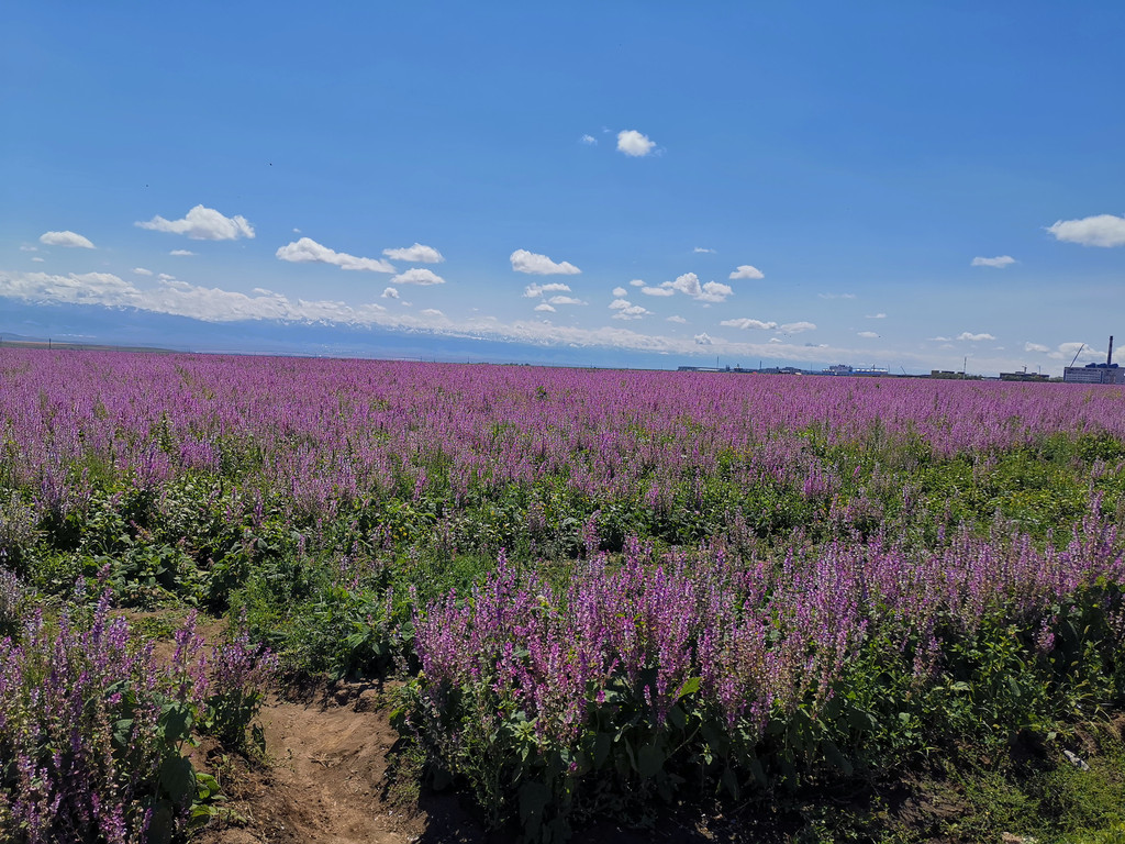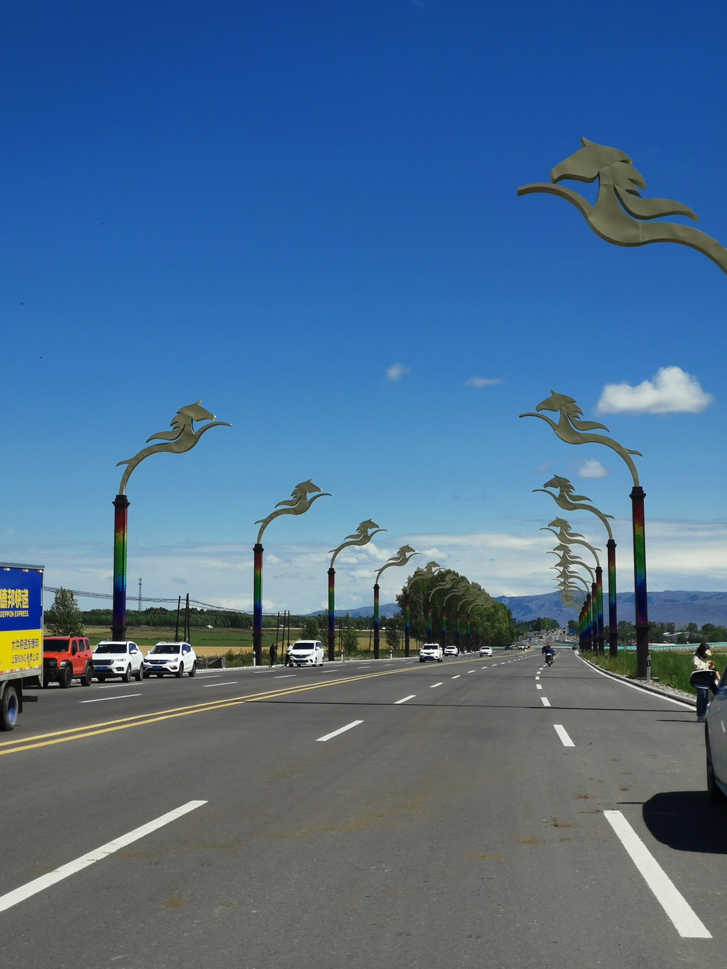 到达昭苏,首先看到了一条景观大道,路灯用的是奔马造型,果然是天马故乡,很有特色。在路边有一大片紫色的花海,不确定是不是薰衣草,因为平常看到的都是薰衣草香包,没见过绽放的,也跟想象中的有点不一样,但旁边有人告诉我,就是薰衣草。也算是意料之外的收获了。