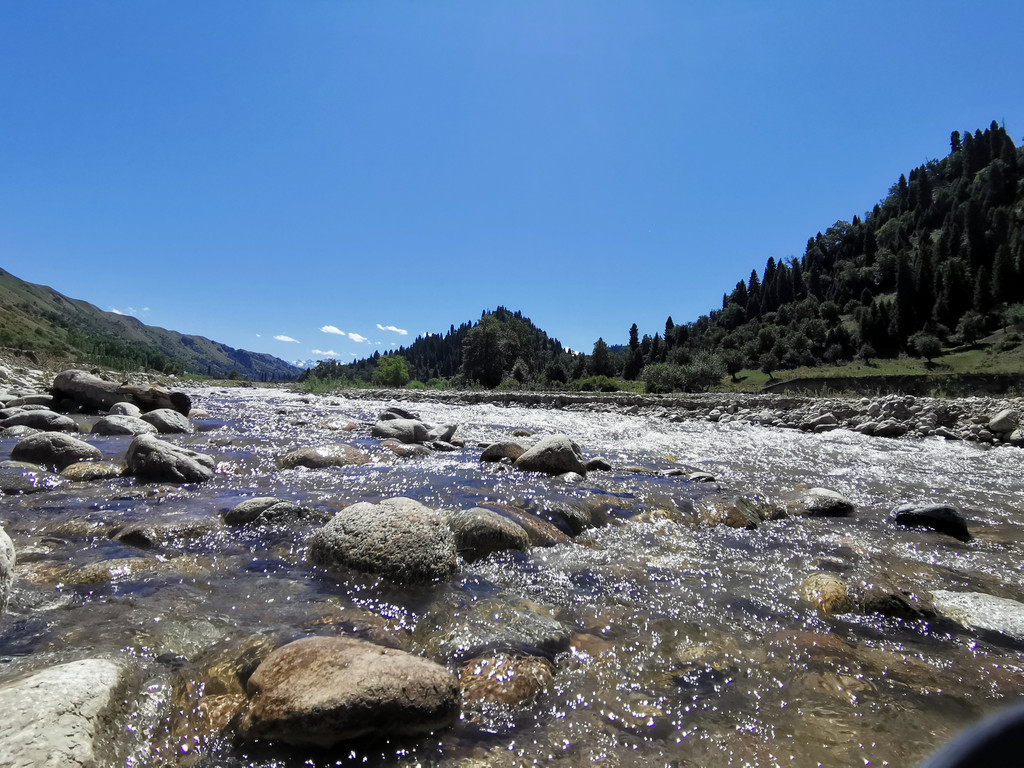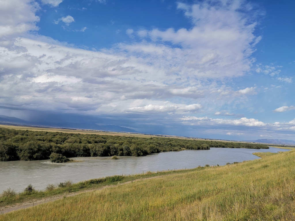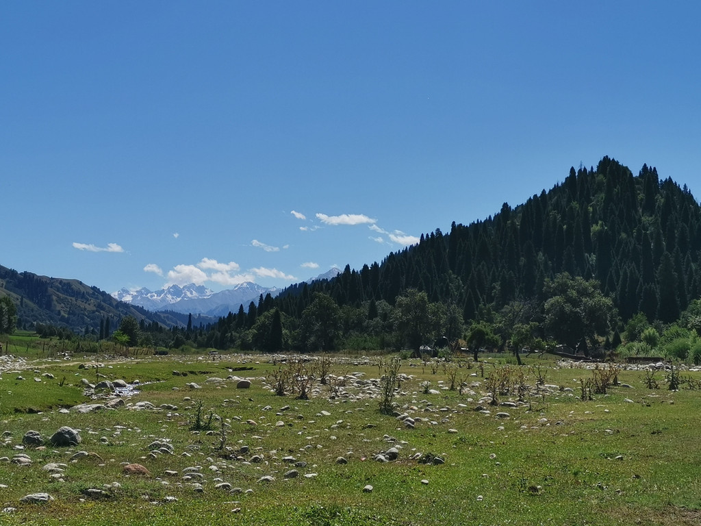 在那拉提、喀拉峻、恰西草原和库尔德宁之间综合比较了下,根据我们的人数、时间、车况,最终确定了库尔德宁。库尔德宁属于近两年才有点名气的比较小众的景点。从八卦城出发,车程一个多小时。一路沿着特克斯河,从这边的山绕到那边的山。