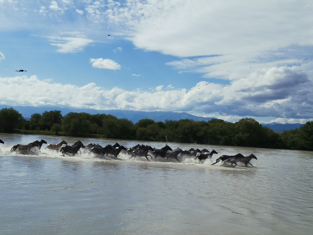 牧马人把一群马赶到特克斯河,随着音乐响起,一群马儿踏浪而来,水花四溅,总共表演两个来回,也就四趟,时间大约5分钟,场面还是比较壮观的,就是时间太短。一群马大约有二十匹,和预期有一点点差距,不过整体来说,还是值得观赏的。