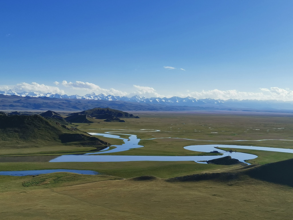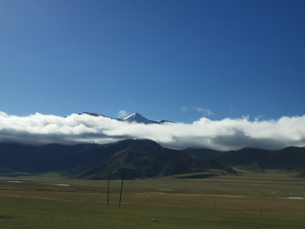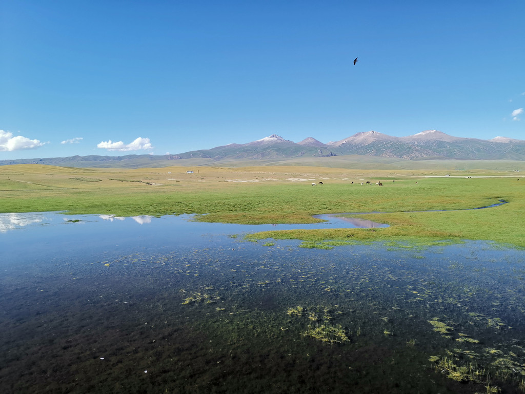 走了一小段独库公路,然后上了S321省道,一路比较平坦,车少,两边是草原,羊群、牛群星星点点,开都河弯弯曲曲一路相伴,白云在山间缠绕,白雪覆盖山尖,分不清是云还是雪,完全是一种原生态的美。