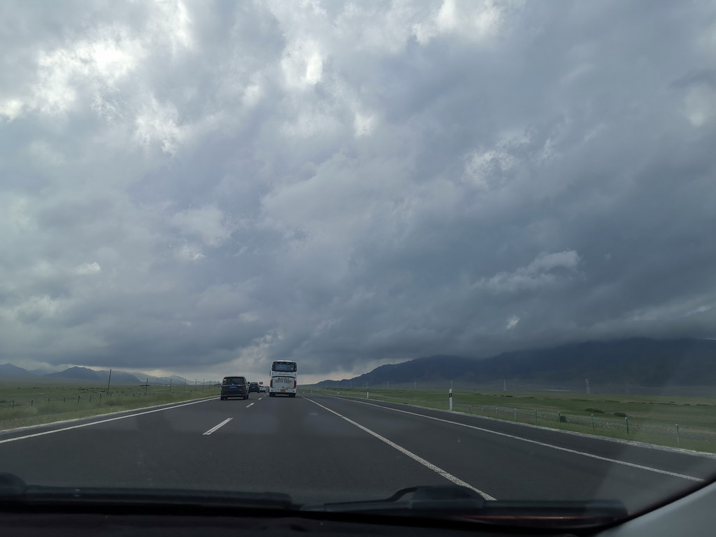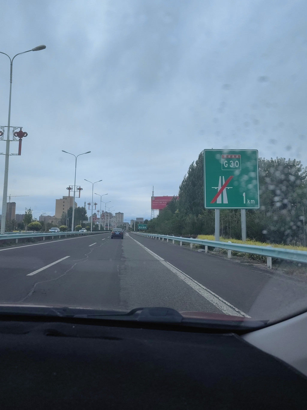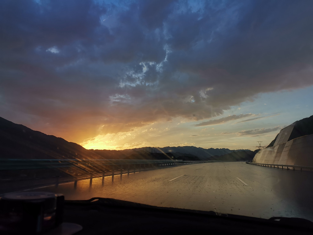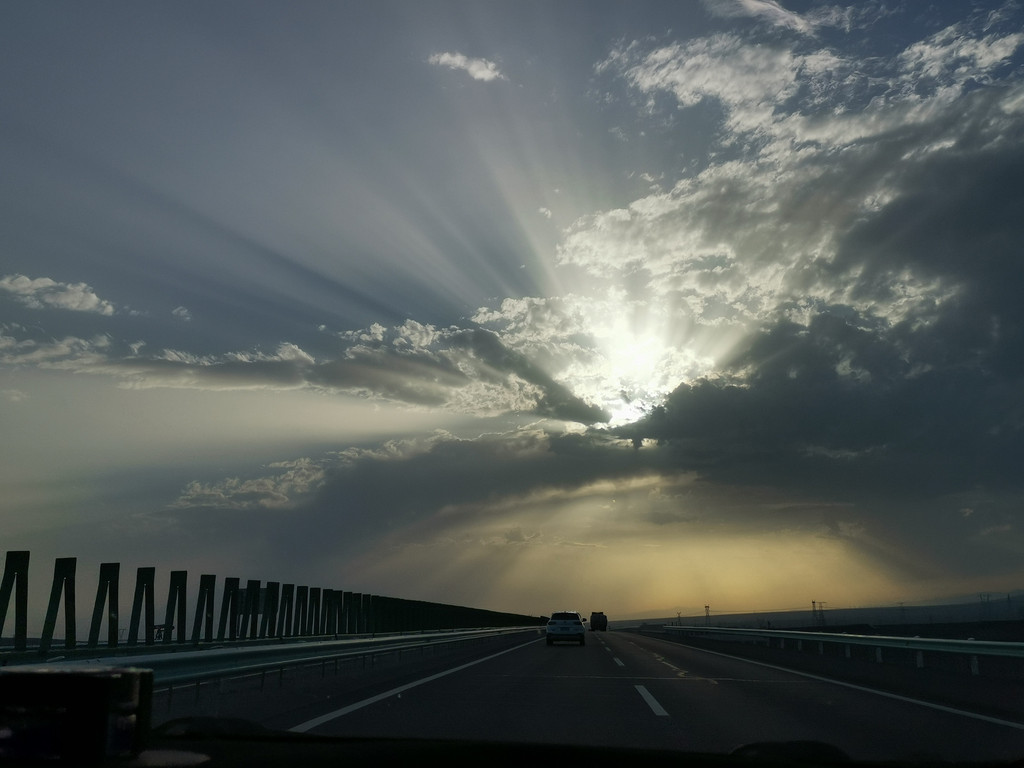 一路上开阔平坦的马路,阳光透过云层射出万丈光芒。进入乌鲁木齐境内又下起了瓢泼大雨,快到的时候又欣赏了一场落日余晖的美景。晚上十点多到达乌鲁木齐,1100多公里,近12小时车程。