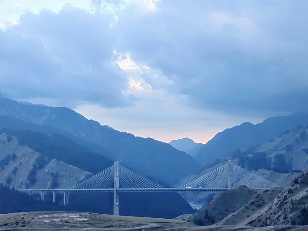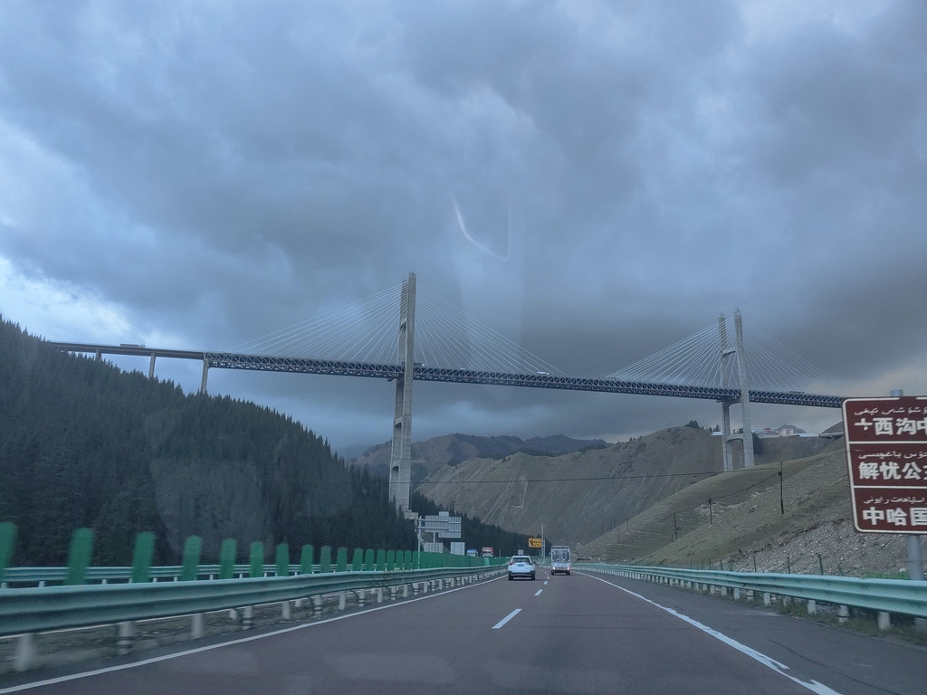 从南门出去不远就是果子沟大桥。由于导航没选高速,所以驾车在这最奢侈的桥上跑一跑没有实现。直接上了沪霍线,有几个观景台可以看大桥,我们在车上看了下,没看到全貌,然后从桥下就过去了,到清水河镇住宿。