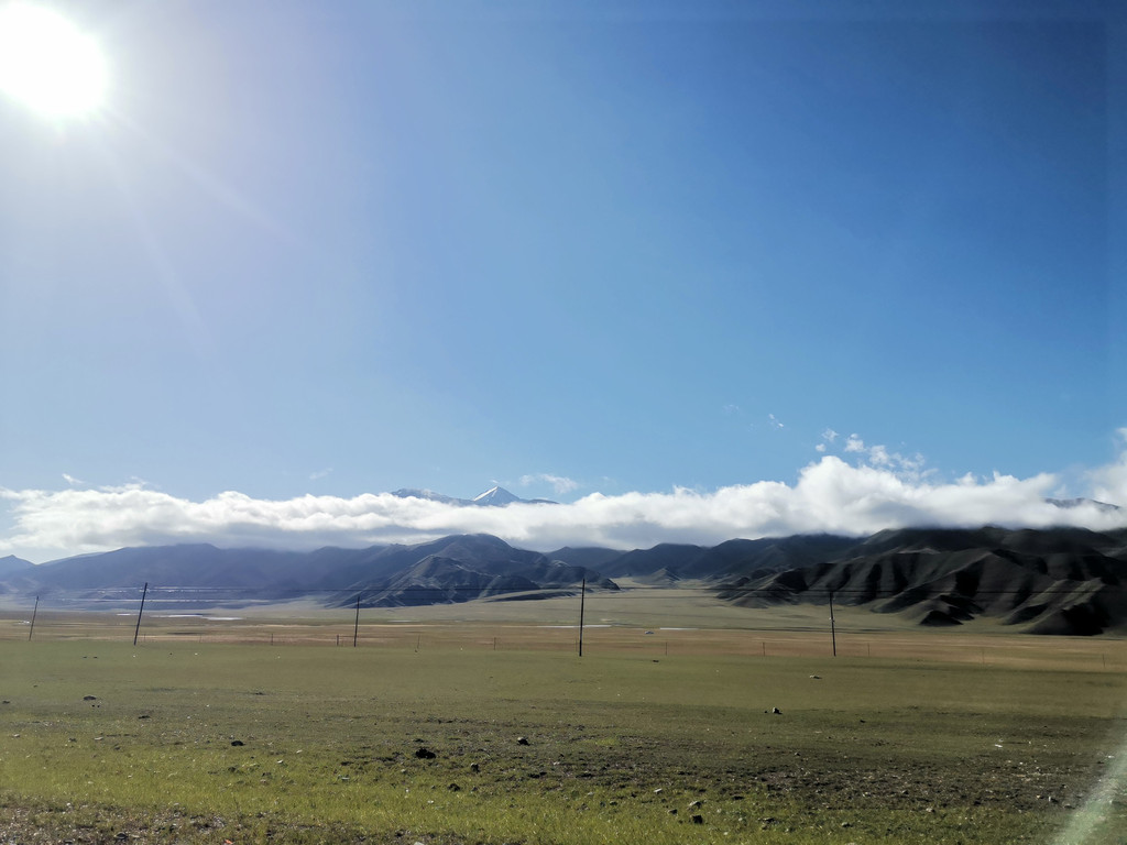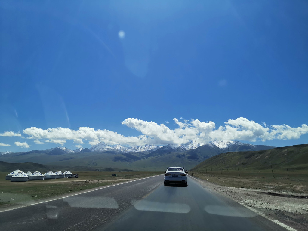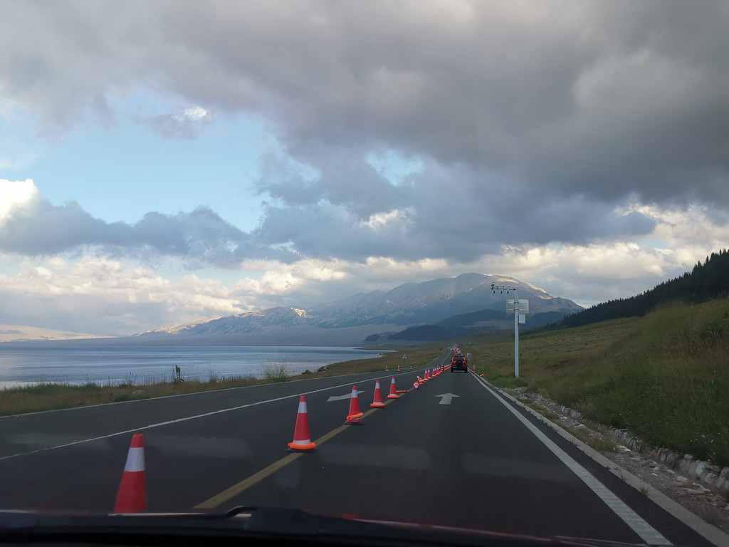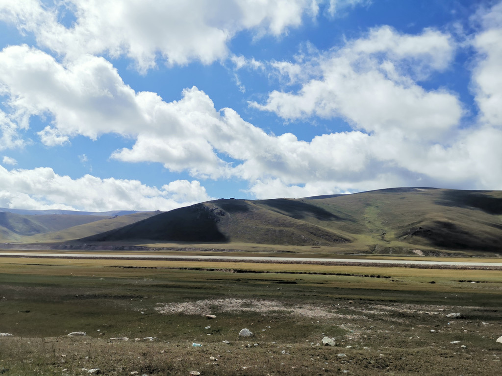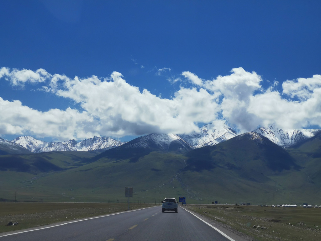 大约有一个多小时这样的美景,路上的车辆变得多起来,尤其是大货车,应该是为旁边正在修建的那巴高速供应材料的。风景也没那么漂亮了,虽然也有草有雪山,但明显不那么丰美,有砂砾出现。有的路段坑坑洼洼,对我们小车来说不太友好,感觉比伊昭公路和独库公路还难。