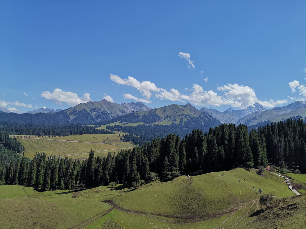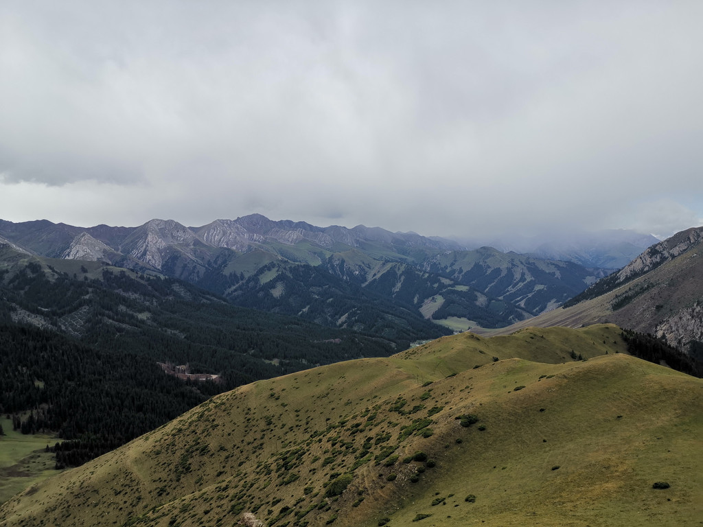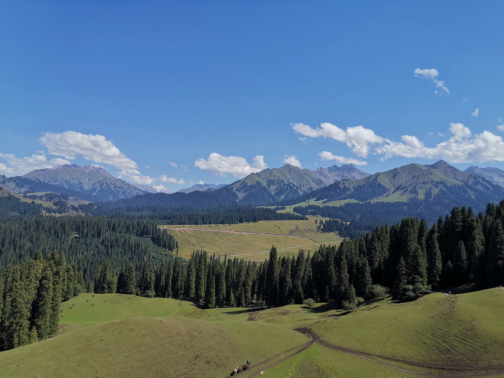 大概四十分钟,骑马到了山顶,一览无余。风景确实挺美,最远处是山,然后森林,森林中间差着一团团草原,草原上白色的毡房似星星点缀。