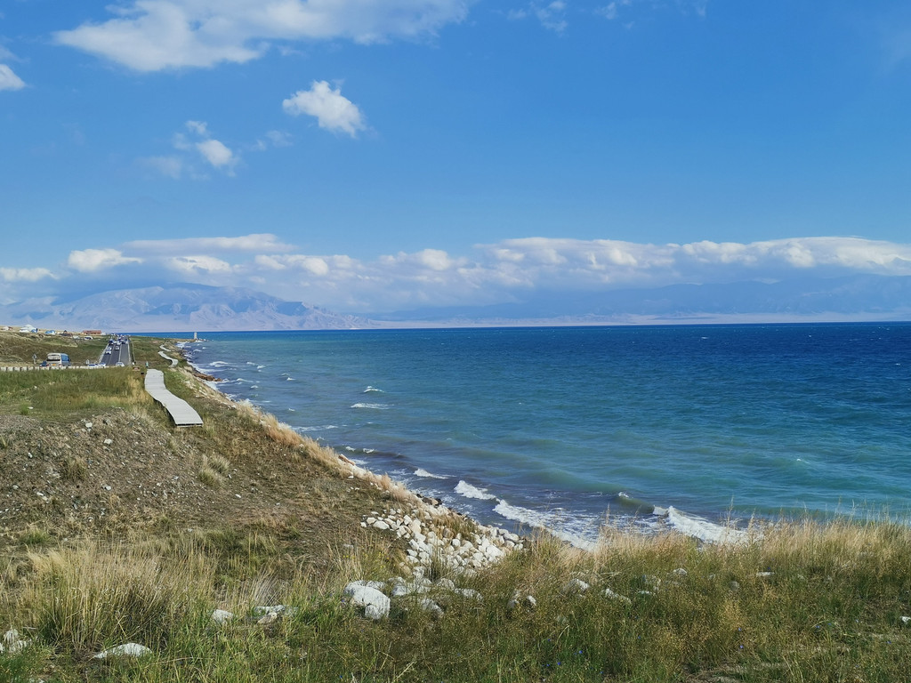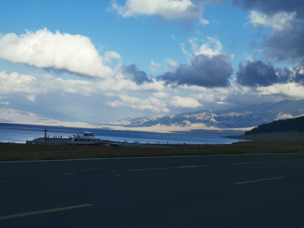 买好门票,开车进入景区,走的路线是东门进,逆时针,南口出,到果子沟大桥。刚进入几百米,就有一个停车场,湖边有游艇,不确定这里是不是月亮湾,有块木牌上有全国各地到赛里木湖的距离,可以打卡。