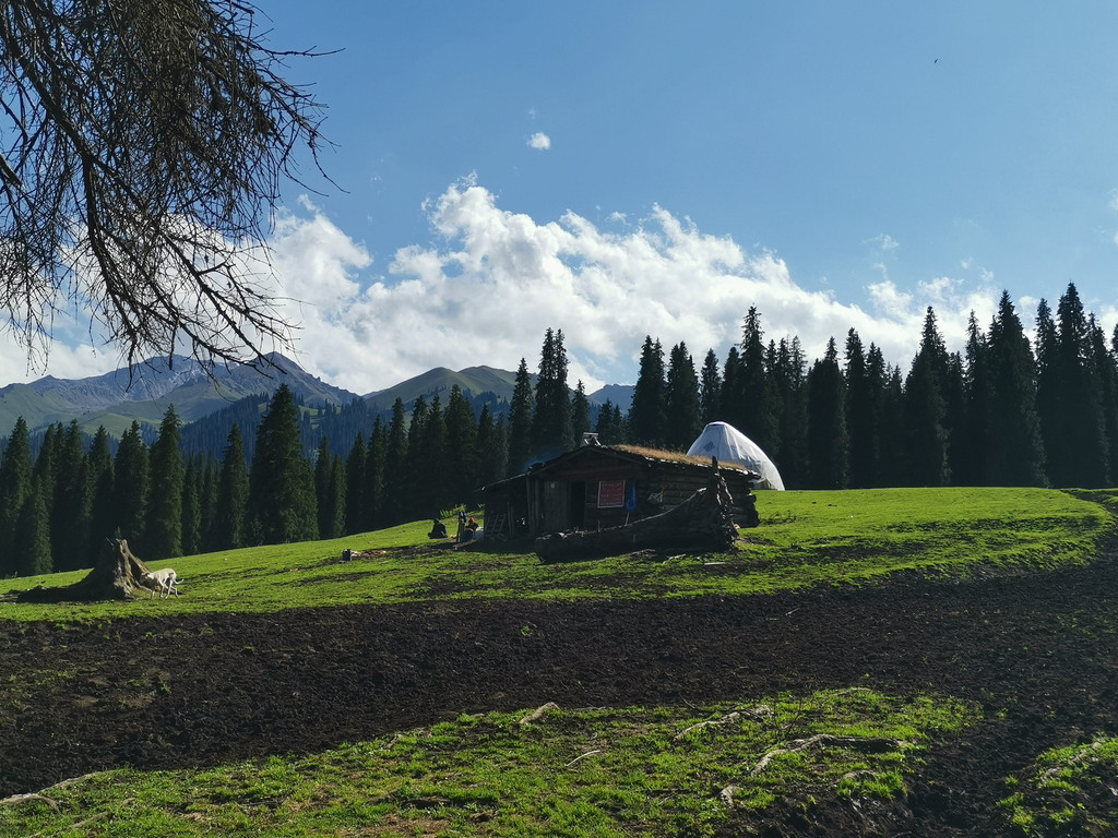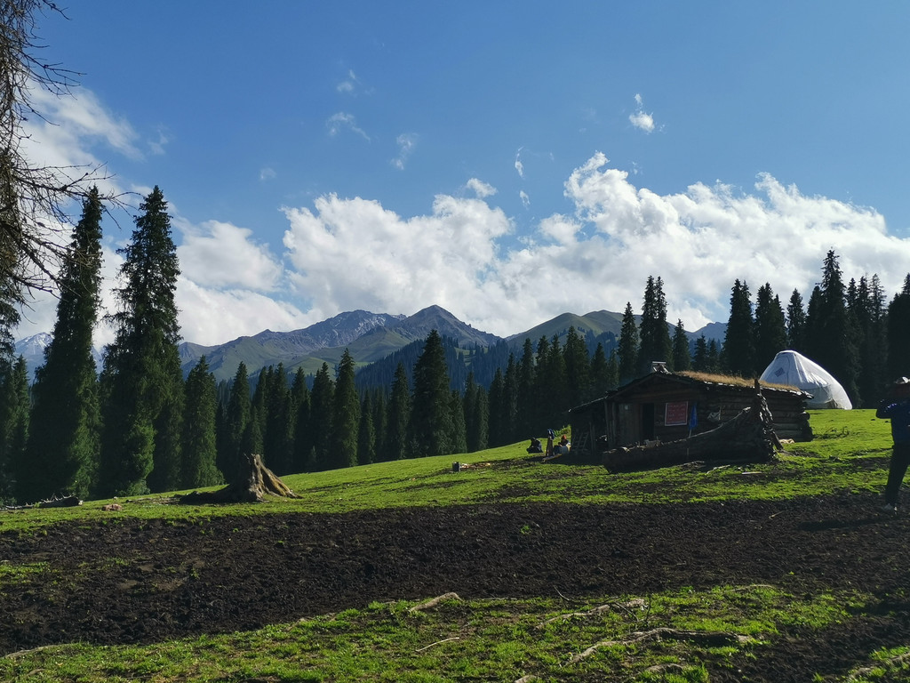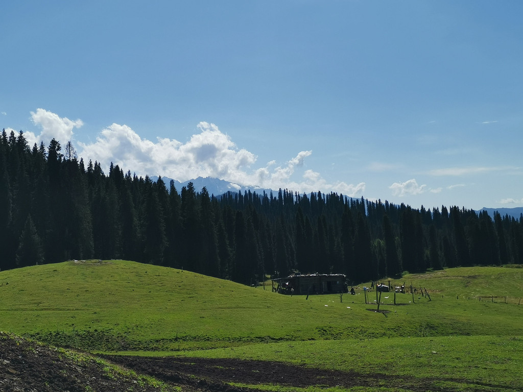 下山的时候,我们都步行,感觉比在山顶看到的风景更让人欣喜,因为融入到整个画卷了。高耸的云杉,碧绿的草坪,阳光透过树林撒下的斑驳,跑马的牧民,悠闲吃草的马儿羊儿,还有孤独的小木屋,和山峰相连的蓝天白云,共同组成一幅宁静悠然美好的画卷,这不就是向往的生活嘛。