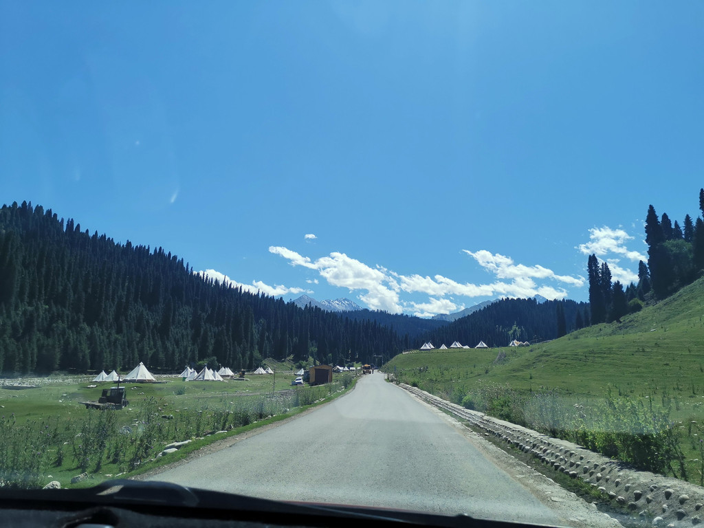 据说在齐孟德观景台视野开阔,风景最美,是不可错过的景点,所以我们也不会放弃,开到齐孟德。从喀峰大本营到齐孟德路上车就比较多了,路边的小溪边草坪上树林里有野餐的,烧烤的,搭着帐篷露营的,显得那么的和谐。