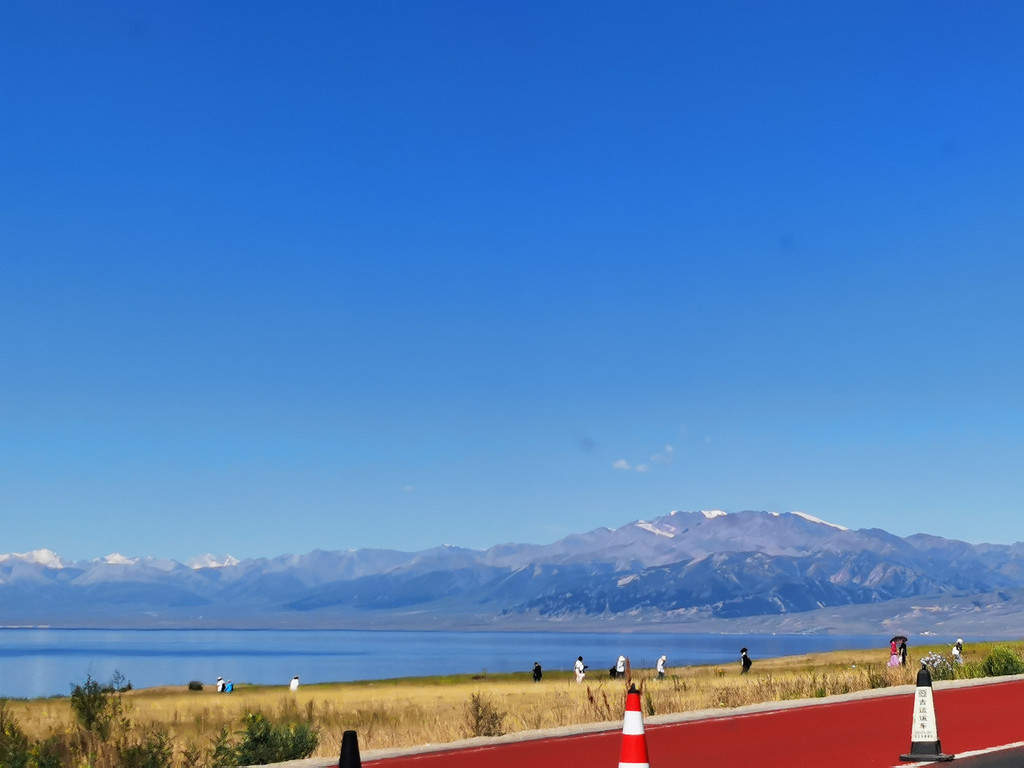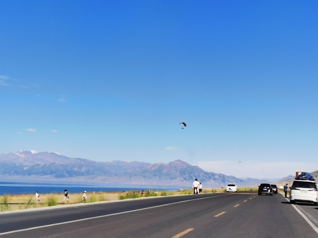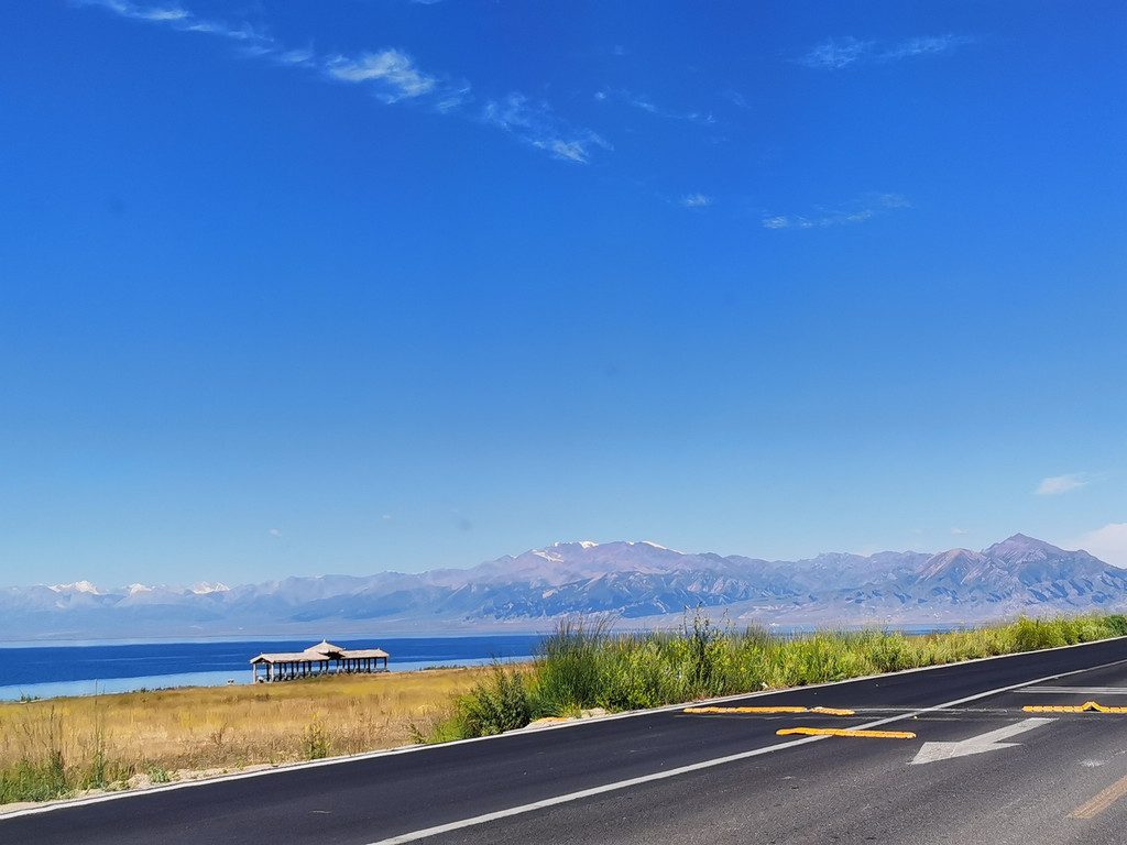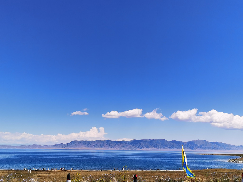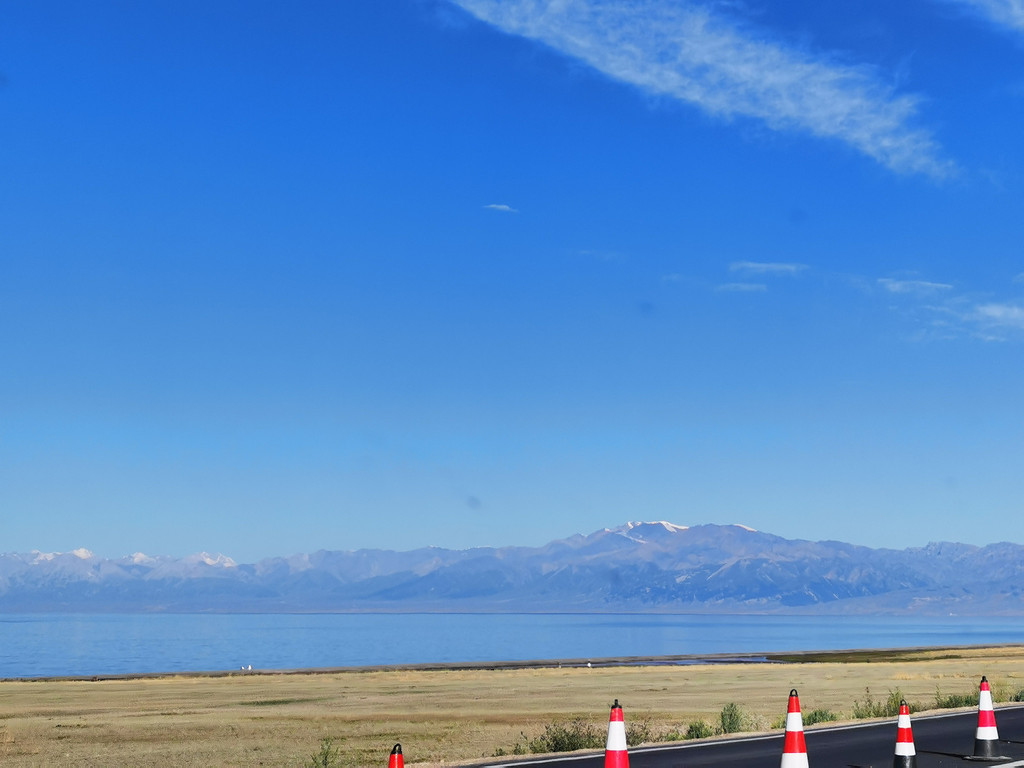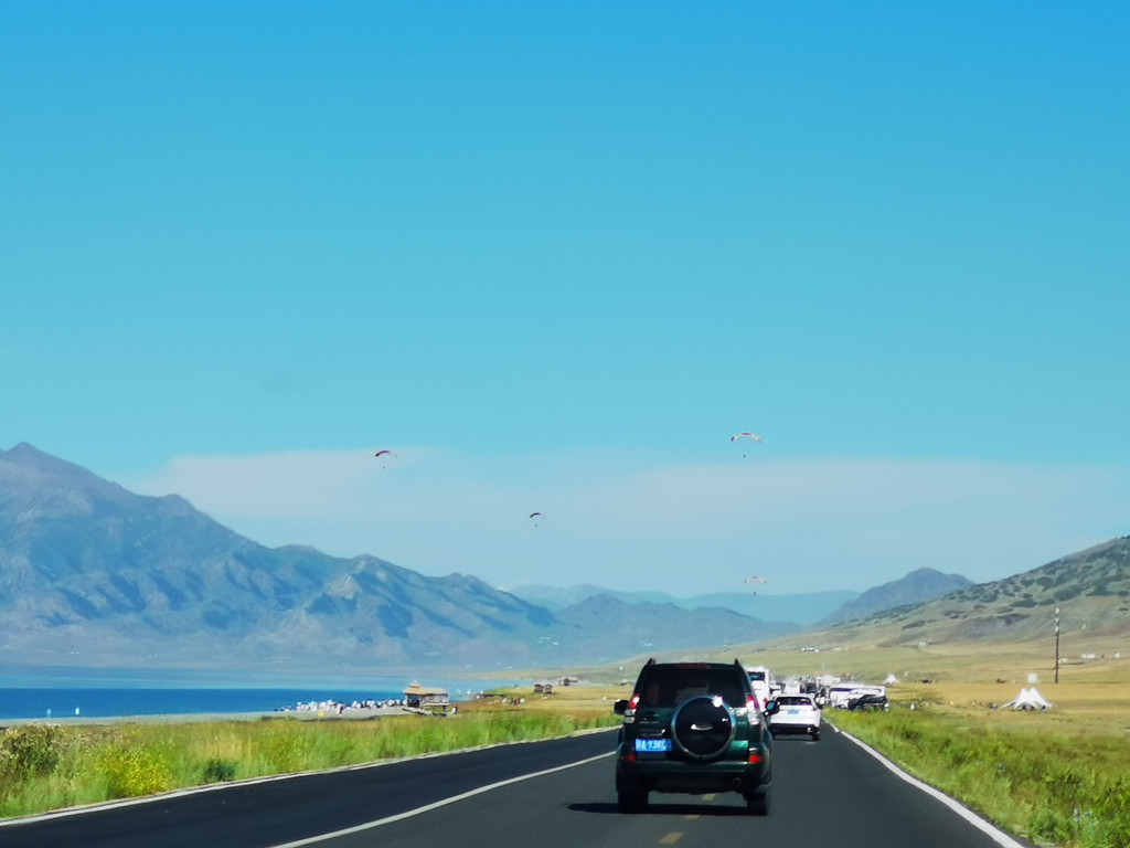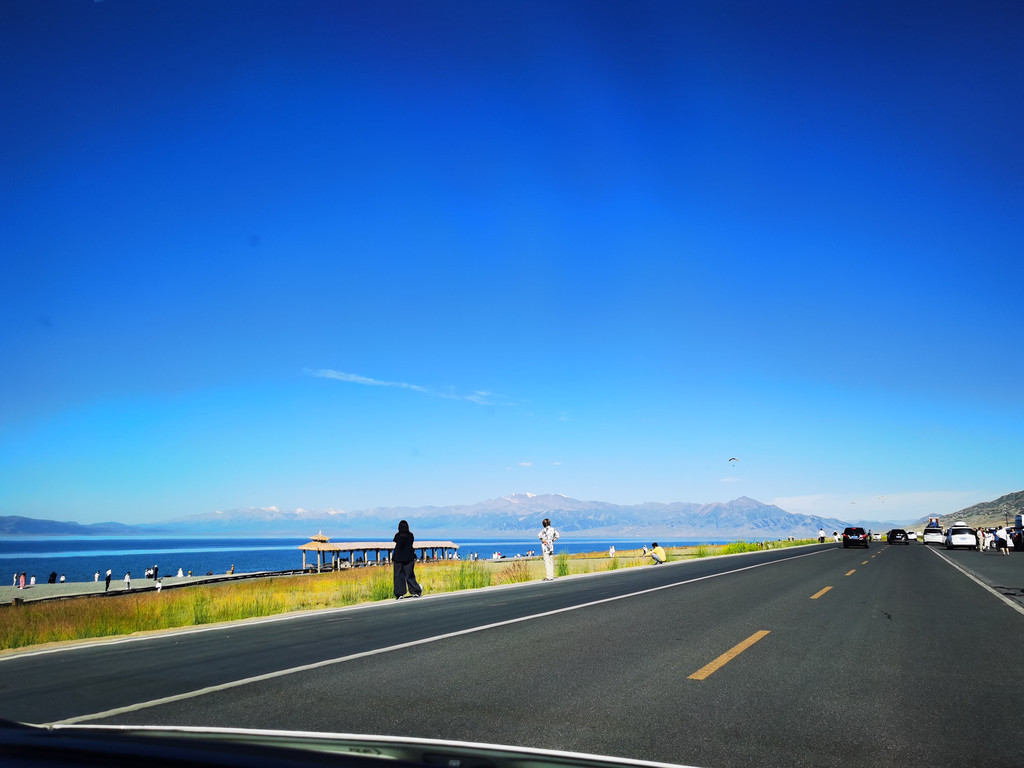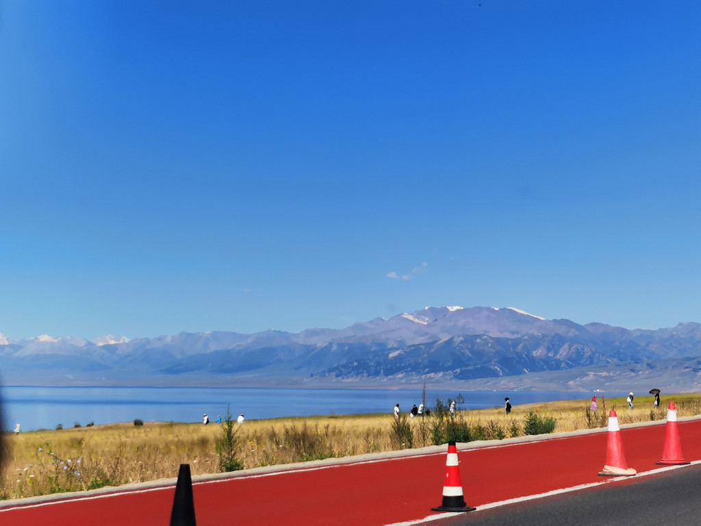 湛蓝的天空下一汪清水波光粼粼,映衬的草更绿了,花更艳了,沿湖绕行每一处景色都美的令人心悸,大片的薰衣草、油菜花,使人总想驻足拍照。路过音乐节的场地更是人山人海,热闹非常。环湖接近尾声之时我们还看到了一队超级拉风的摩托车队,太漂亮了,堪比一道风景。