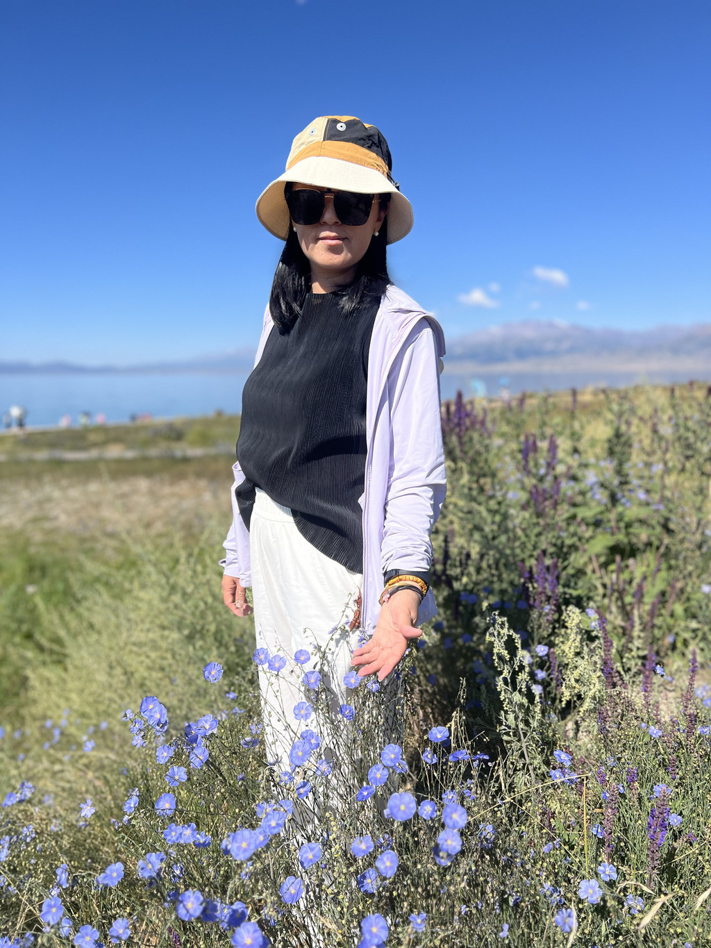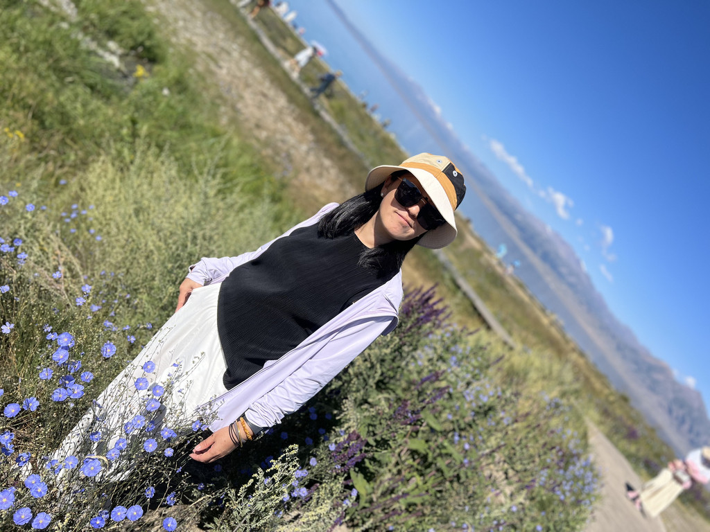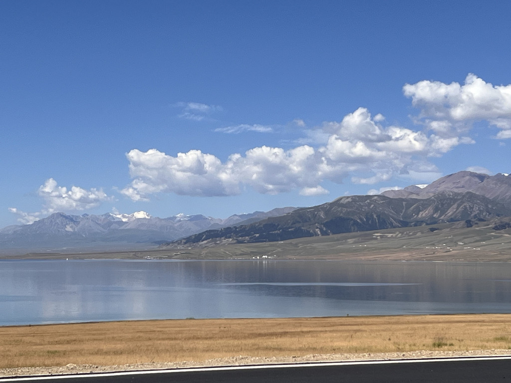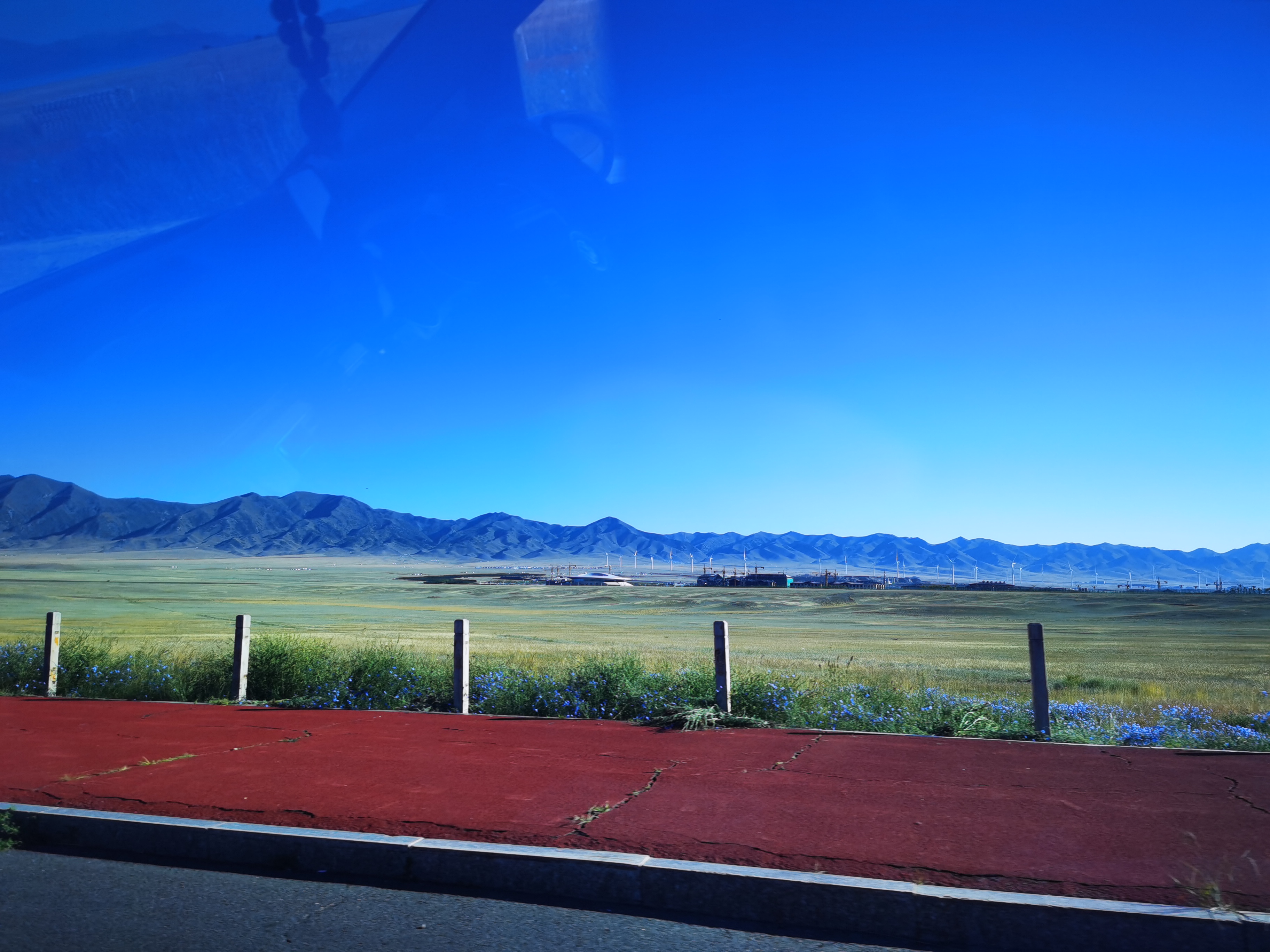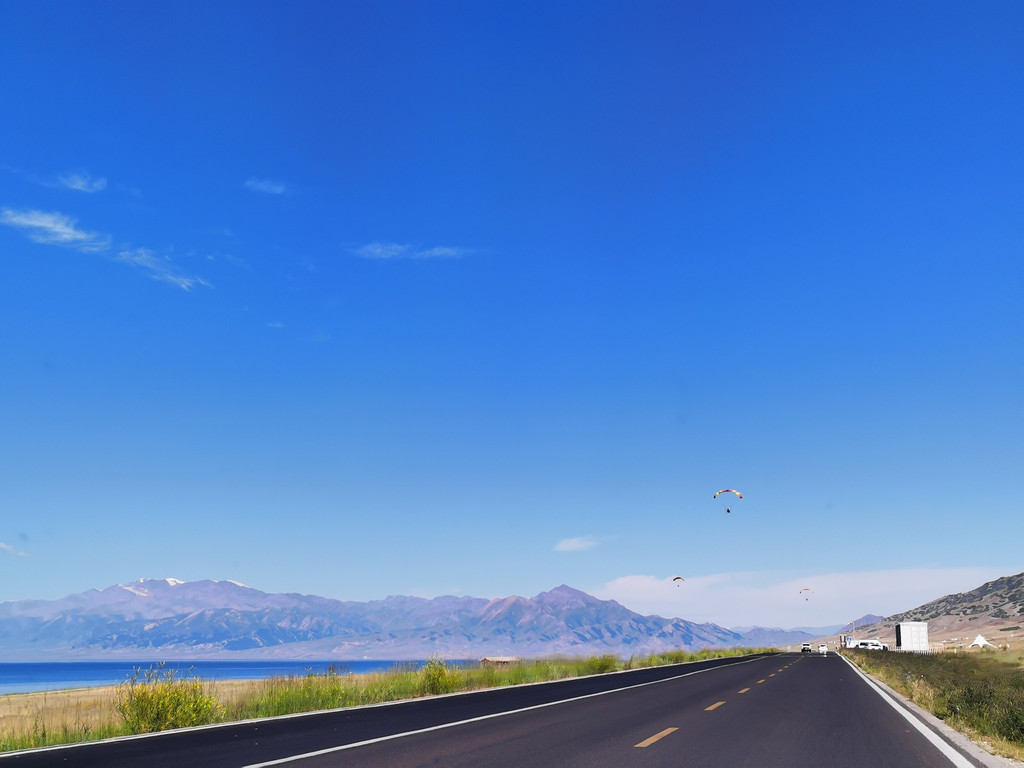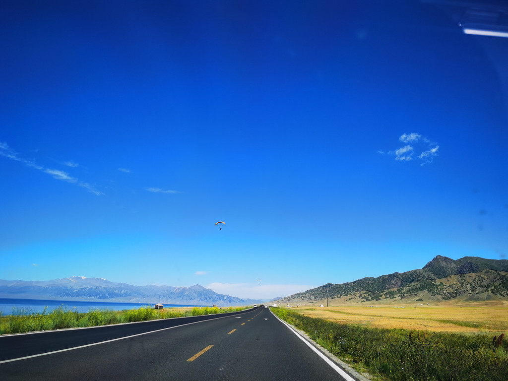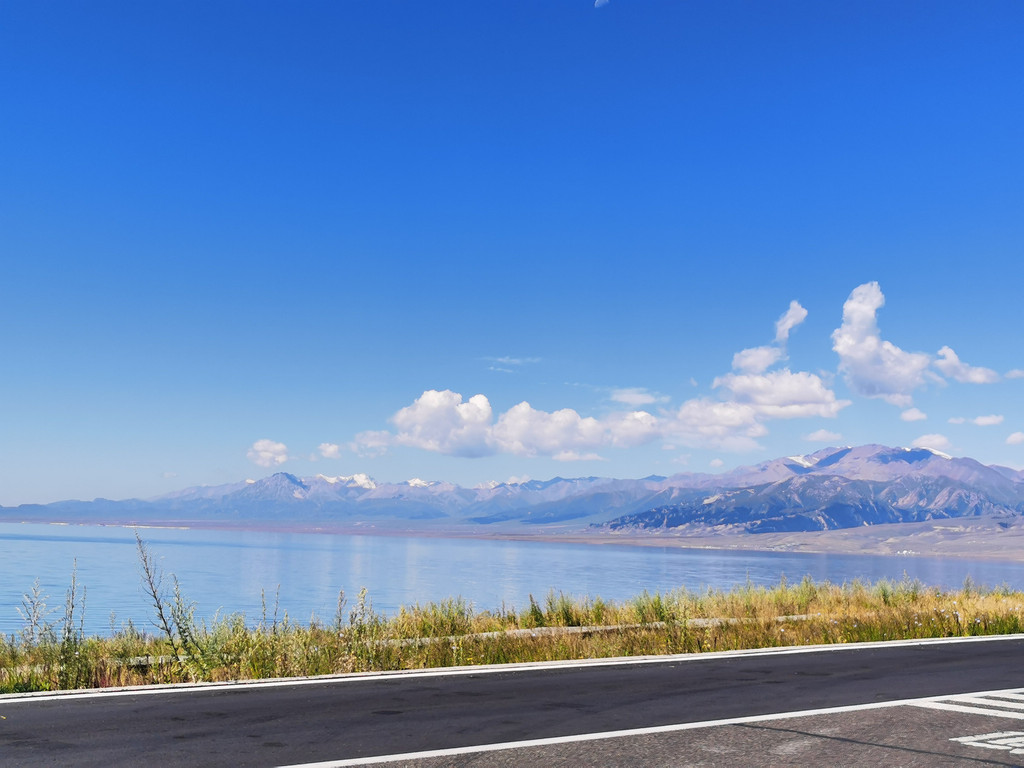 湛蓝的天空下一汪清水波光粼粼,映衬的草更绿了,花更艳了,沿湖绕行每一处景色都美的令人心悸,大片的薰衣草、油菜花,使人总想驻足拍照。路过音乐节的场地更是人山人海,热闹非常。环湖接近尾声之时我们还看到了一队超级拉风的摩托车队,太漂亮了,堪比一道风景。