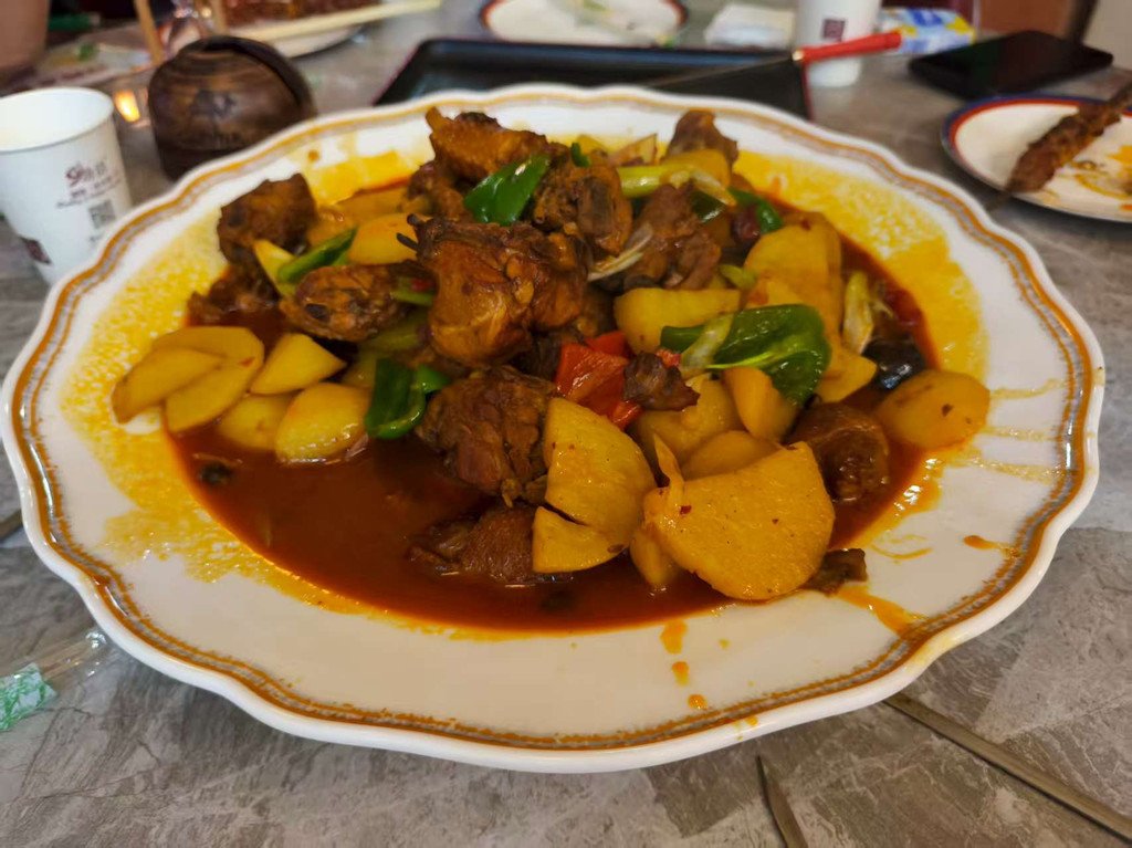 找的第一家是家三层民族风小楼,不过烤肉机坏了,由于大家都非常想试一下当地的新疆羊肉串,所以果断换了另外一家,点了大盘鸡和牛羊肉串,吃后测评大盘鸡不如烤串,应该全点烤串才对。