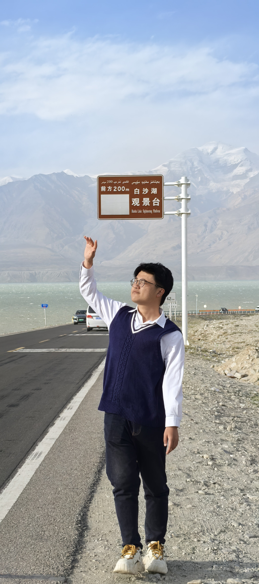 经过白沙湖观景台,补打卡了小红书网红机位(搜白沙湖观景台,往前走有个休息区,休息区再往前走回头看就是了),不过风大到人都站不稳,太阳下午正好晃得眼镜都睁不开。