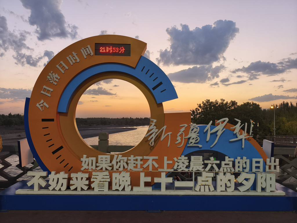 吃到一半,跑到伊宁河大桥上去追落日,可惜差了几分钟,大桥上都是人,还有抓拍的,技术还可以。