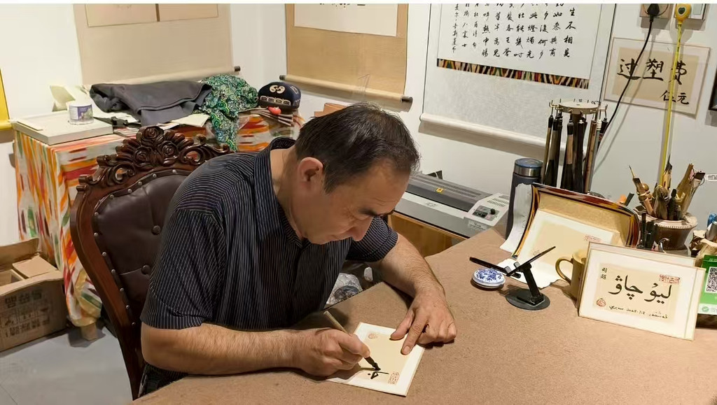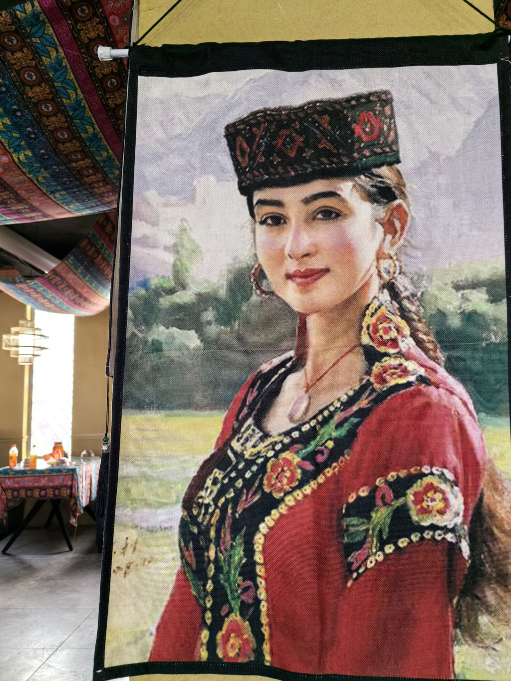 还有些宝藏小店值得一去,不过我们去得比较早,很多店还没开门,正常是11点左右开始营业。其中有家油画展厅,里面的老师可以代写维文的名字,30元一幅。老师还跟我们讲说维文一共三十来个字母,用标点标在不同的位置来表示不同的字,又学到了新知识。