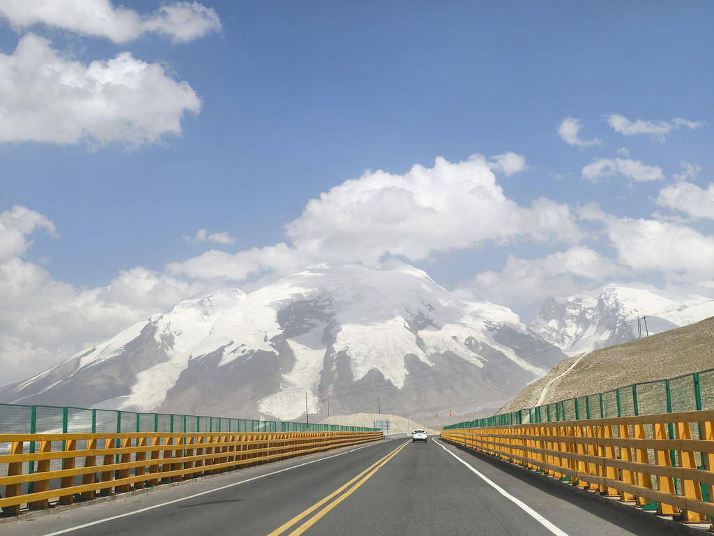 慕士塔格峰闭园时间六点钟,时间来不及只能不去了,反正也要绕着那座山走,就在车上看看了。