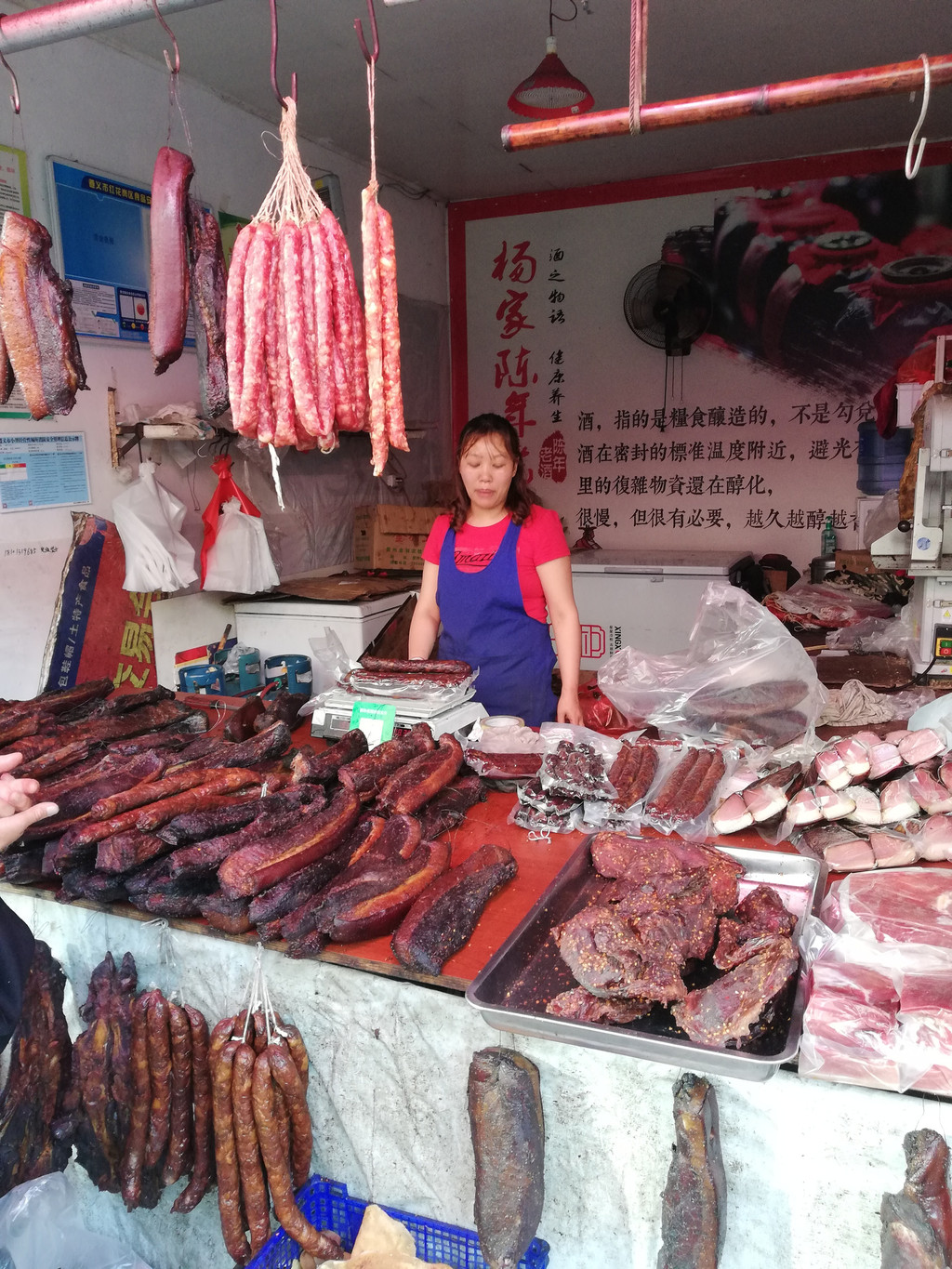 在客运站附近翡翠路松桃百年老街有一菜市场,可以看到当地人的饮食生活习惯。基本蔬菜跟北方也无差异,多了些竹笋、折耳根、咸菜之类,还有买当地山茶的,我买了一点毛峰,一路喝过来口感还不错。羊肉主要以山羊肉为主,牛肉分带皮和不带皮的,他们是直接把牛毛褪掉,牛皮与牛肉一起煮食。熏肉类较多,熏猪脚、猪腿、香肠皆有可买。