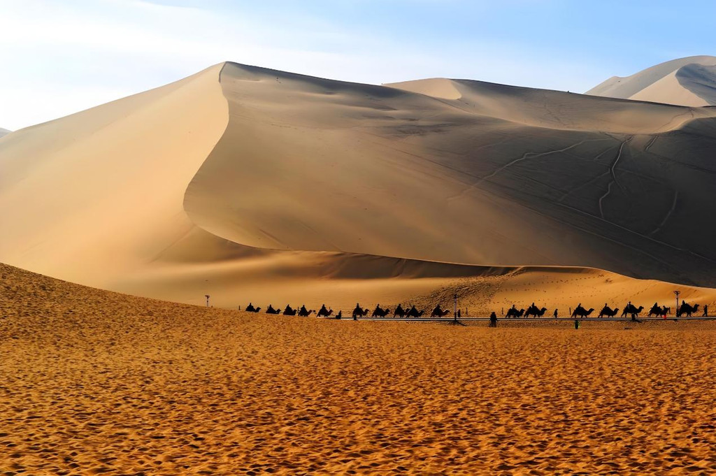 然后,我们来到了敦煌鸣沙山·月牙泉景区,这是一处自然景观的奇迹。站在鸣沙山巅,俯瞰着金色的沙漠和清澈的月牙泉,或是漫步在沙漠中,听风吹过沙丘,仿佛能看到古丝绸之路的足迹显现于黄沙之上,悠悠驼铃声又缓缓响起。