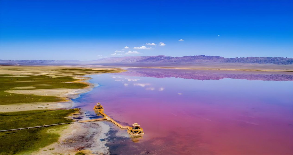 幻彩湖也是盐池,湖水的颜色会随着天气的变化而变化,晴朗的日子,湖面像大海一样碧蓝,日落时分,晚霞映照,绿里透红;当要起风时,湖面呈粉红色,要下雨时,湖面呈紫色,十分壮美,能看到什么颜色的湖水,都是因缘际遇。