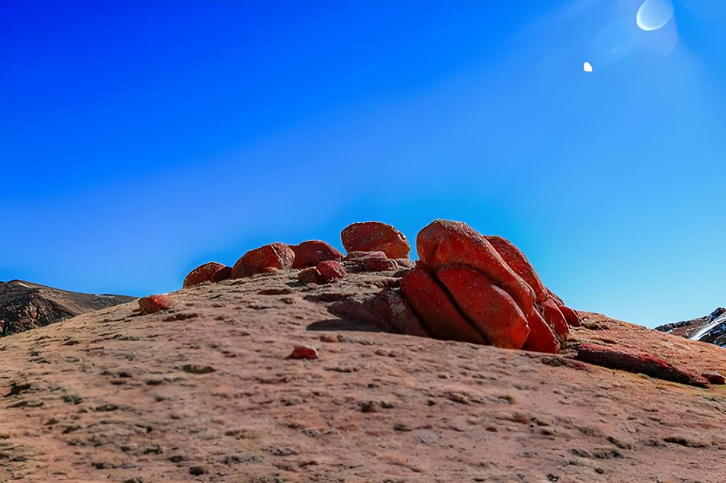 红石峪位于伊吾县前山乡西北角约17公里处的群山中,红石林立,南北、东西分别长约20公里。走进山谷,两边是一座座高山,连绵不断。远处,一片巨大的淡红色山体,高低起伏,错落有致,各种形状的红石头,非常壮观,有一种原始之美。脚下,零星细弱的绿草好像一层毛绒绒的薄地毯,衬映着远处的原始红石群落,使之更显妩媚、漂亮。