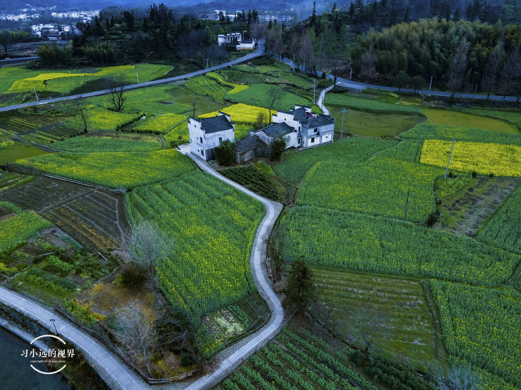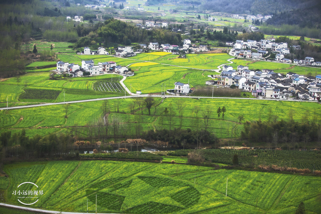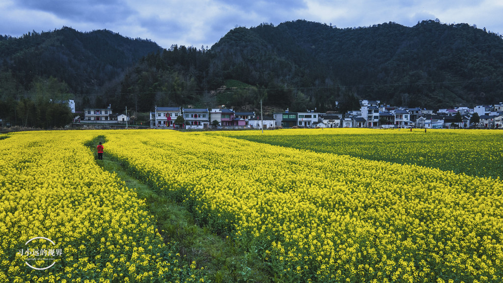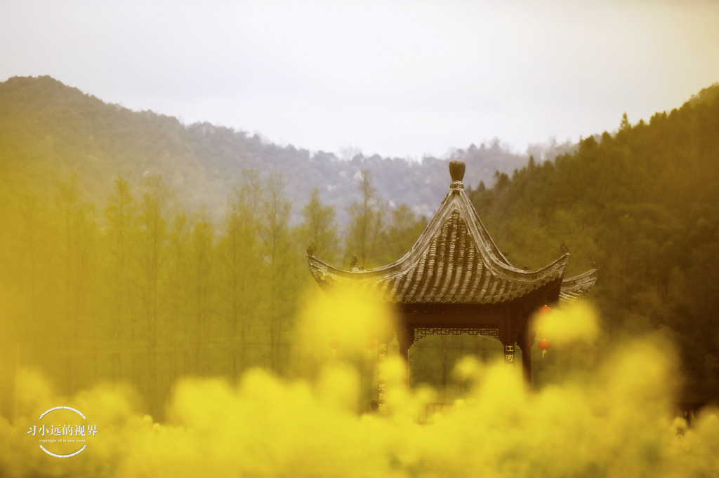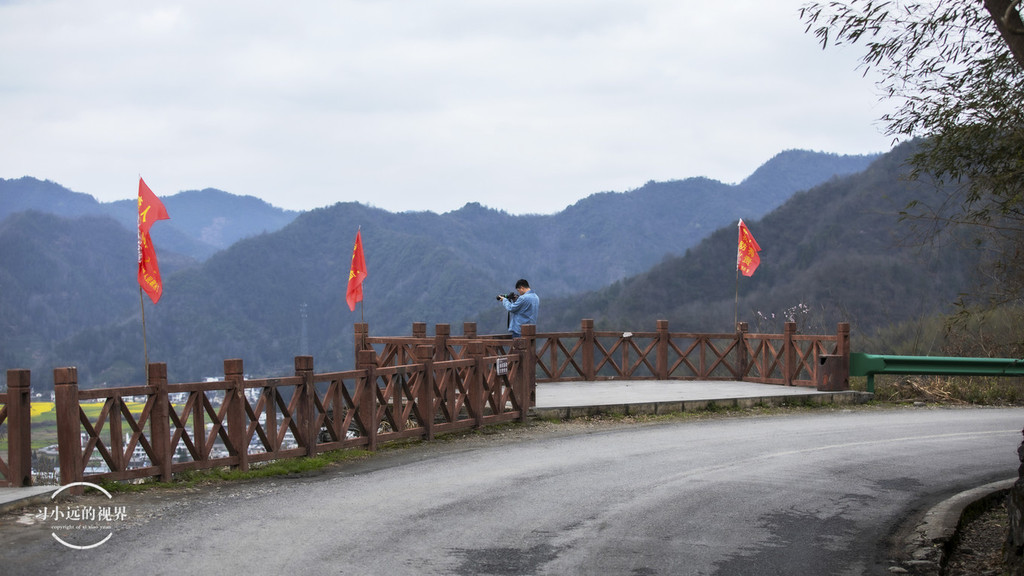 这是观景台上拍摄的场景,白色的徽派建筑在花田里,如果时间充裕,不妨拍拍造成的有云雾时候的照片。