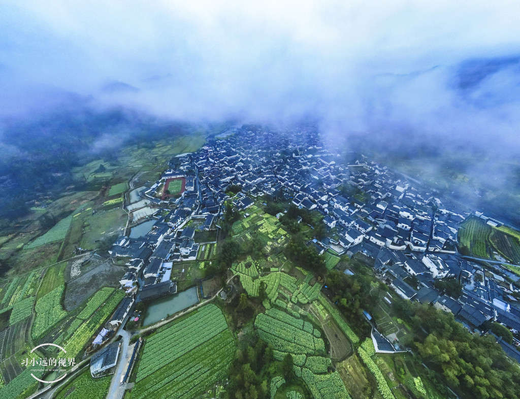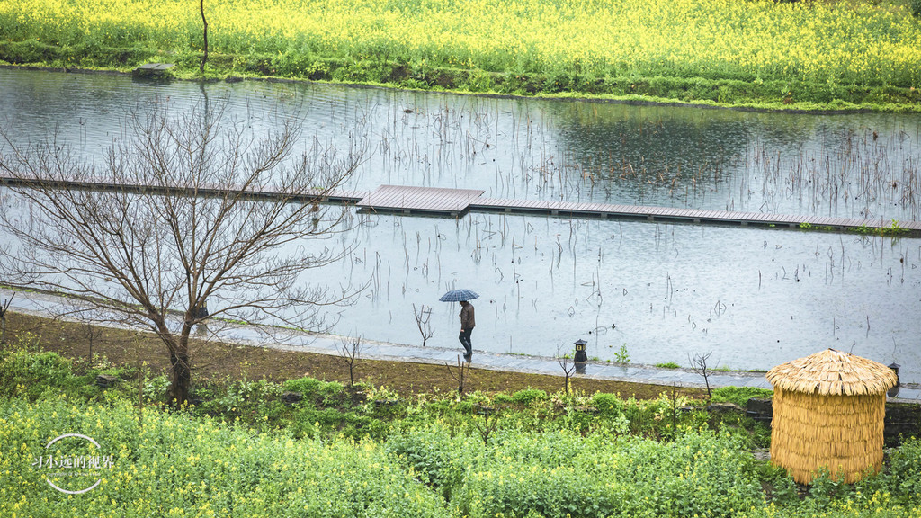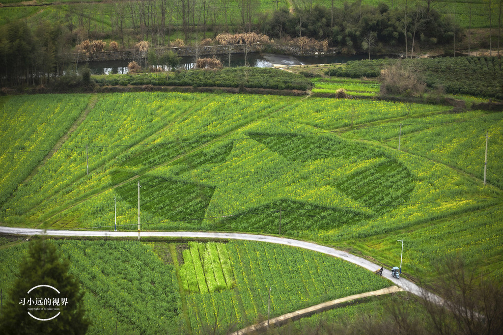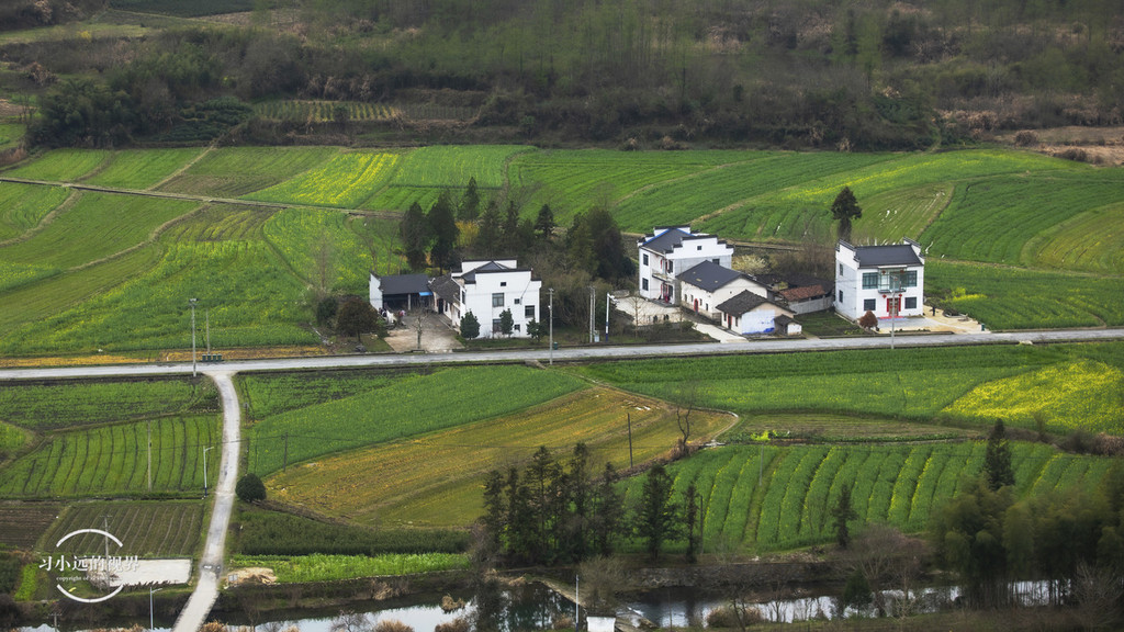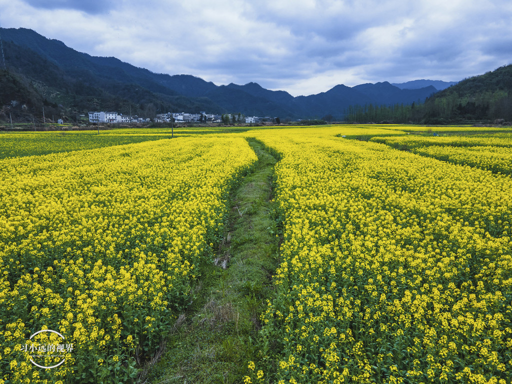 这是观景台上拍摄的场景,白色的徽派建筑在花田里,如果时间充裕,不妨拍拍造成的有云雾时候的照片。
