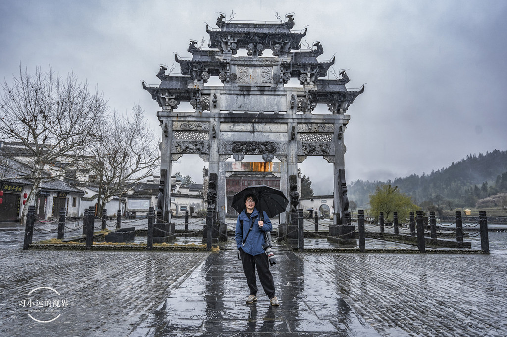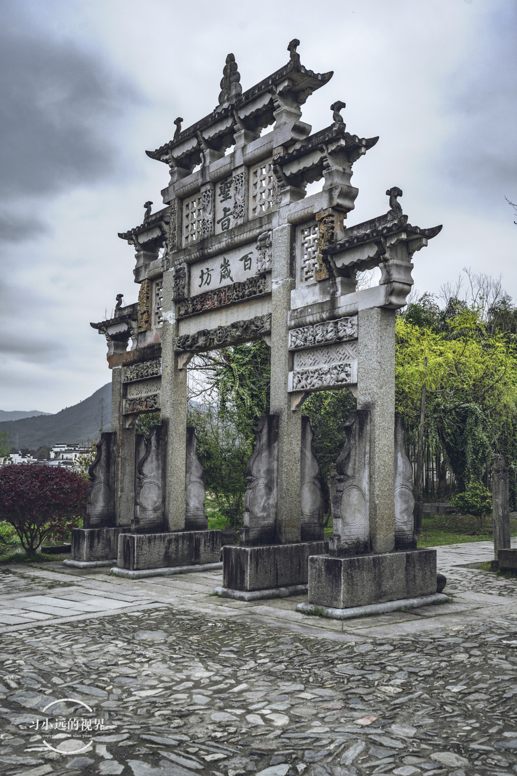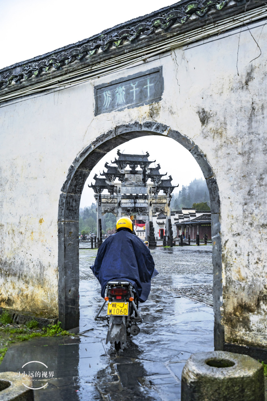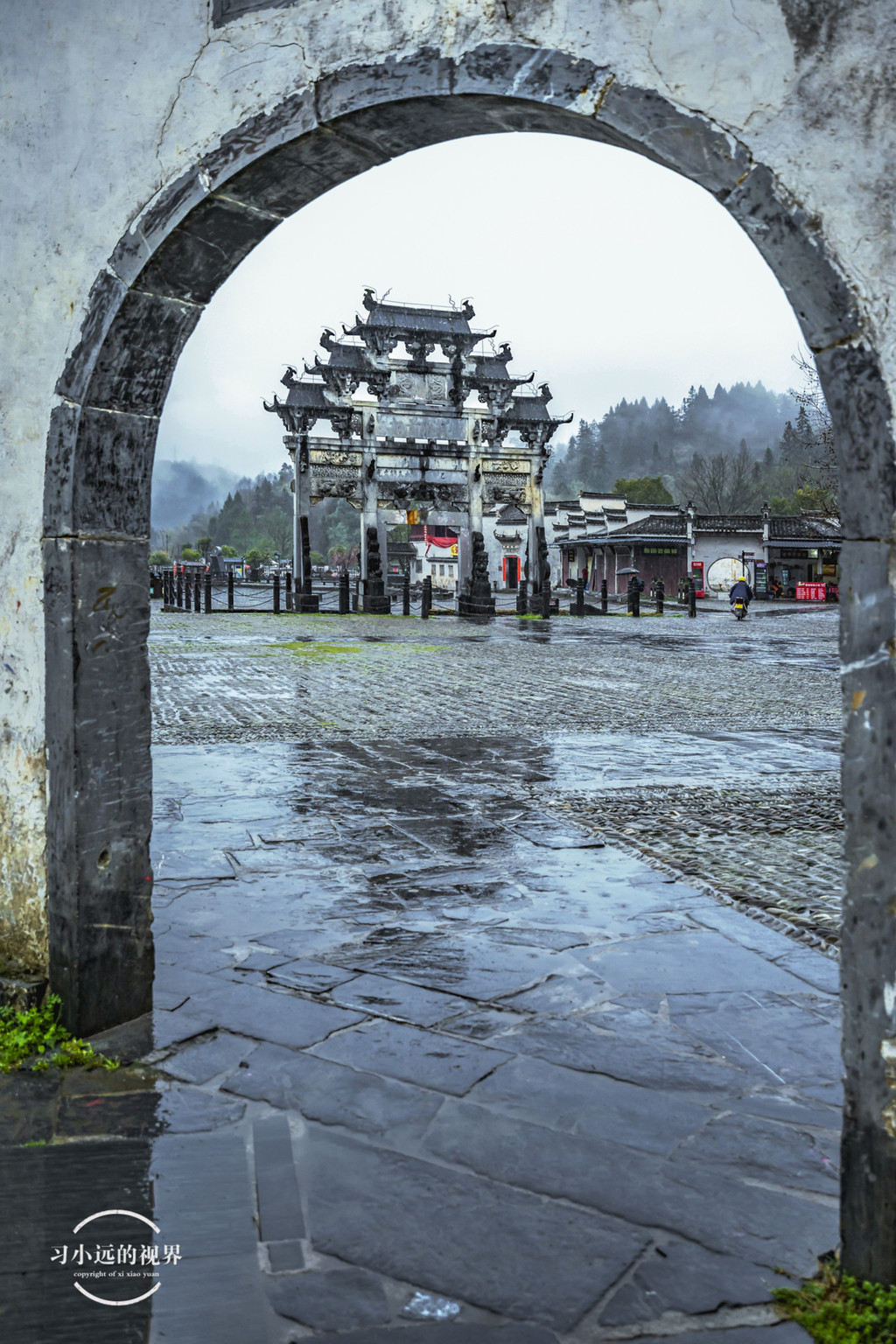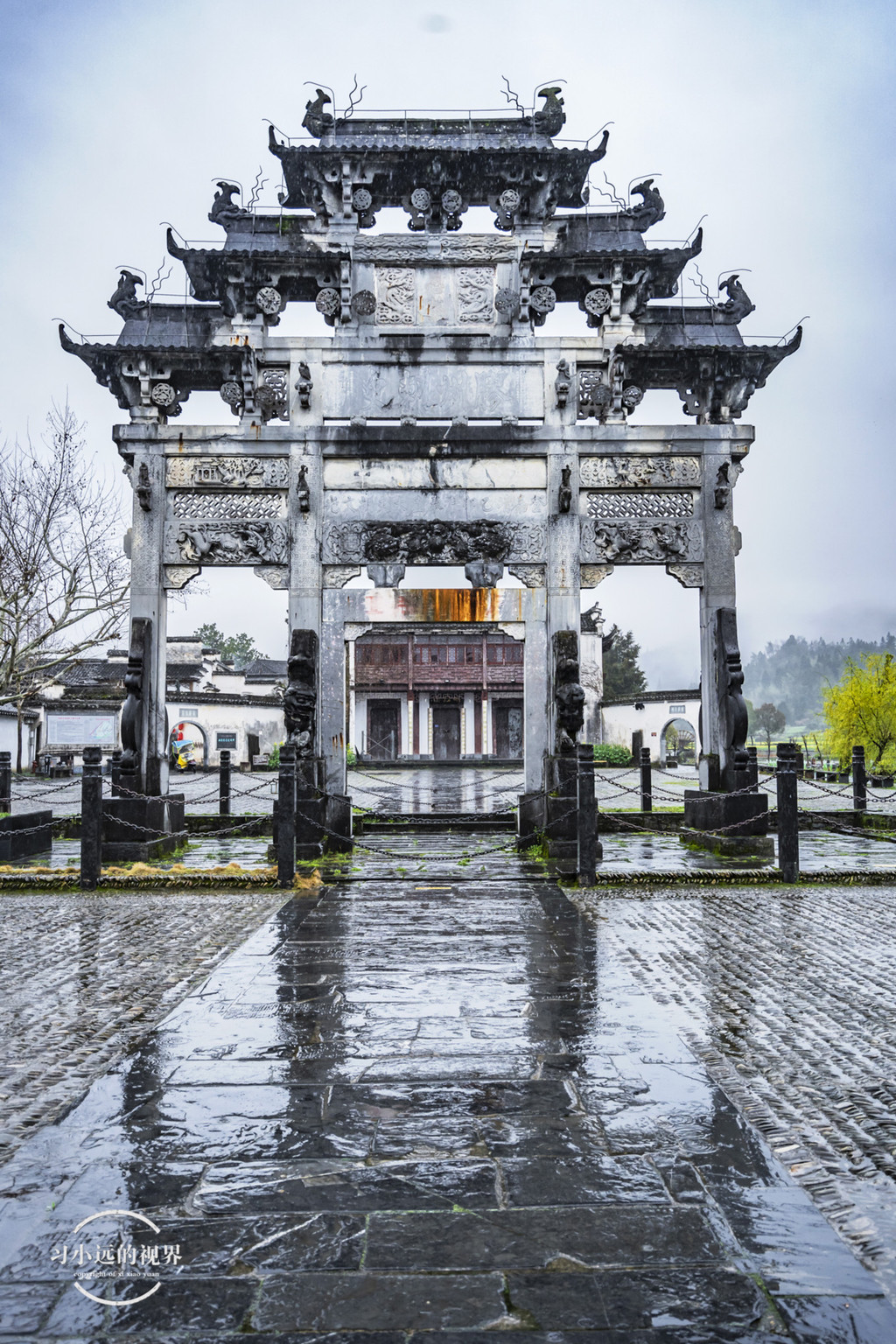下雨天的西递,会在狭窄的石板巷口迷路,这个时候除了一年四季不变的白墙黛瓦,还多了黄色和观景台的几点红。下雨的原因,这个石牌坊也有了几种色彩。