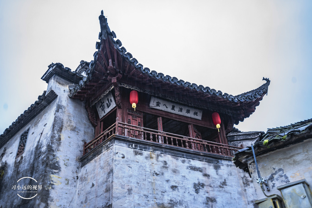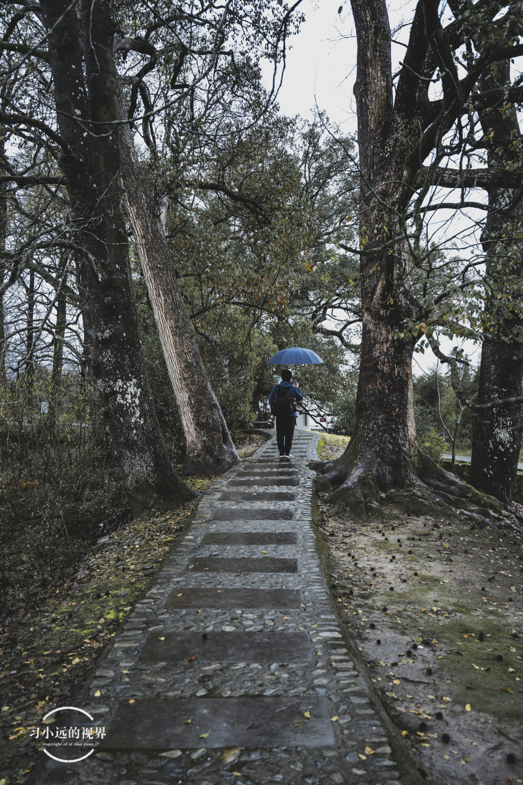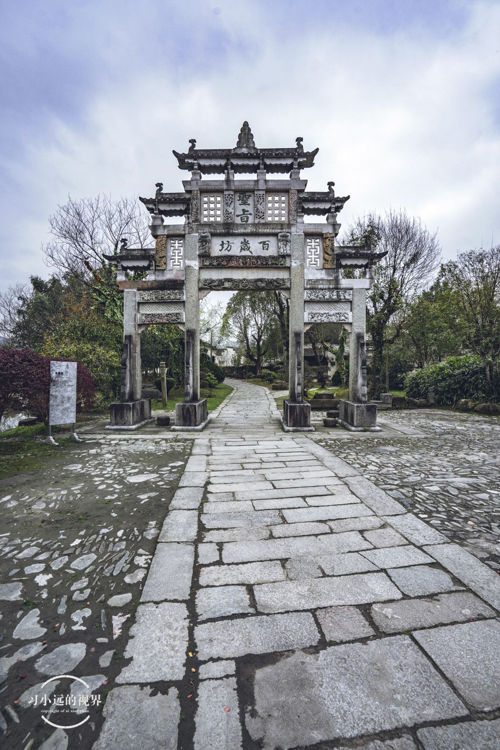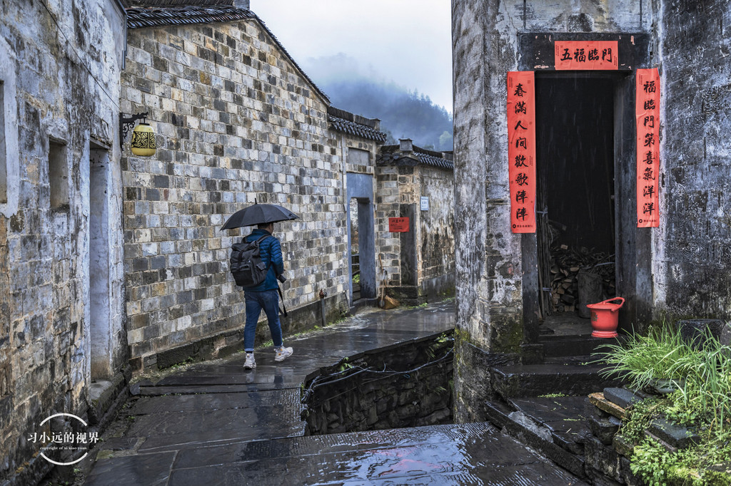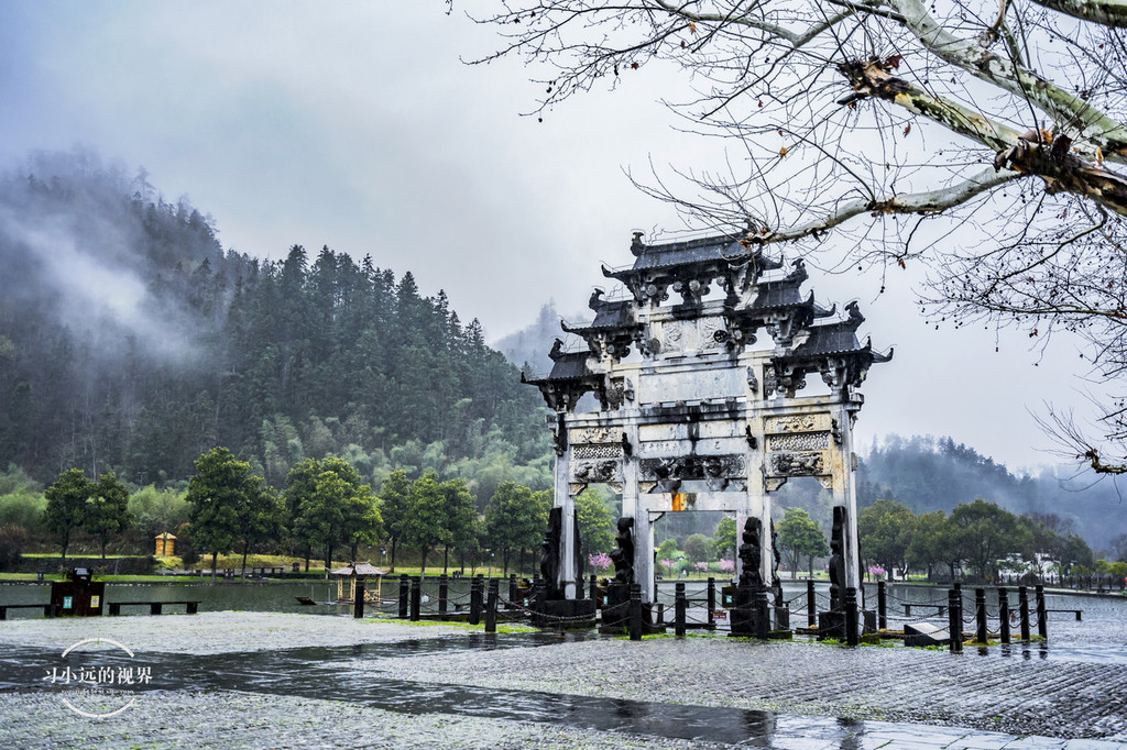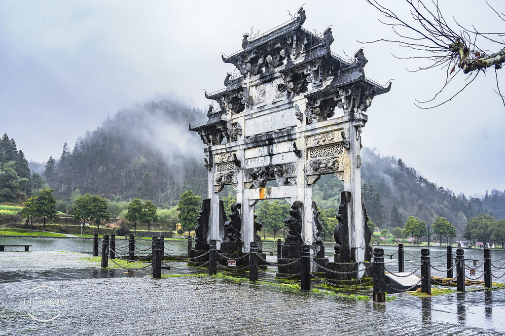 下雨天的西递,会在狭窄的石板巷口迷路,这个时候除了一年四季不变的白墙黛瓦,还多了黄色和观景台的几点红。下雨的原因,这个石牌坊也有了几种色彩。