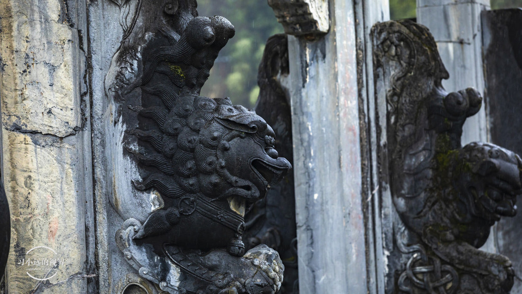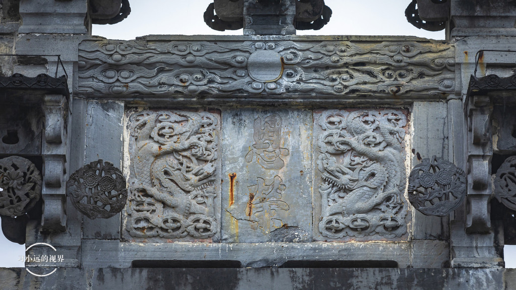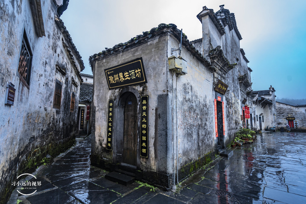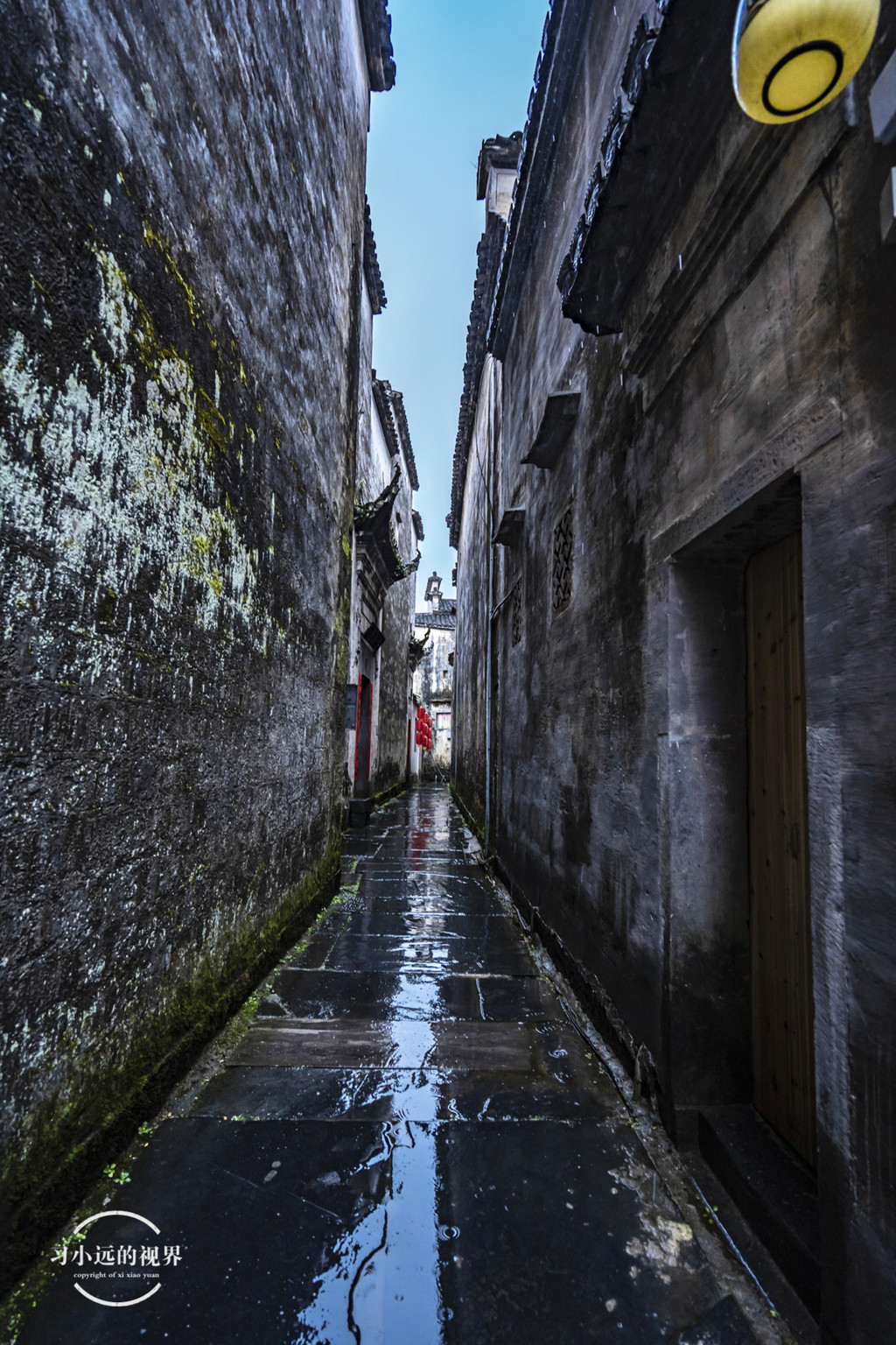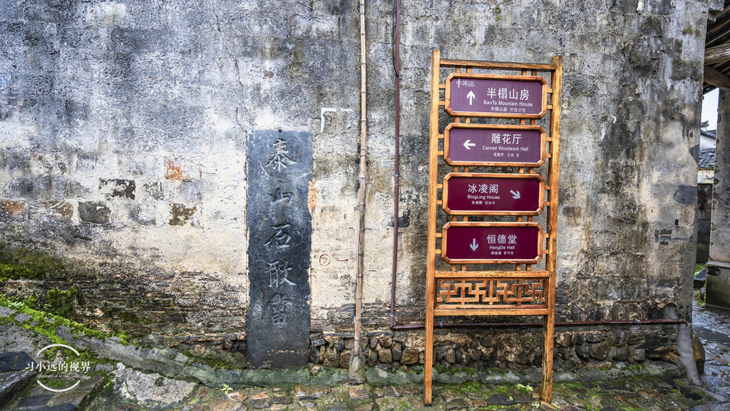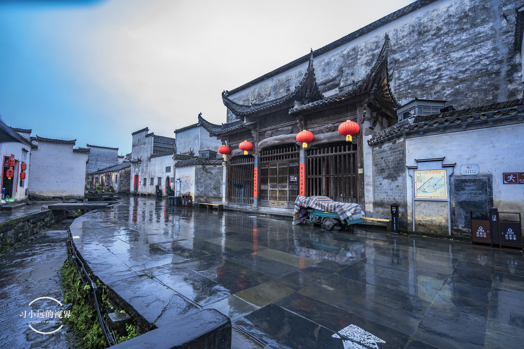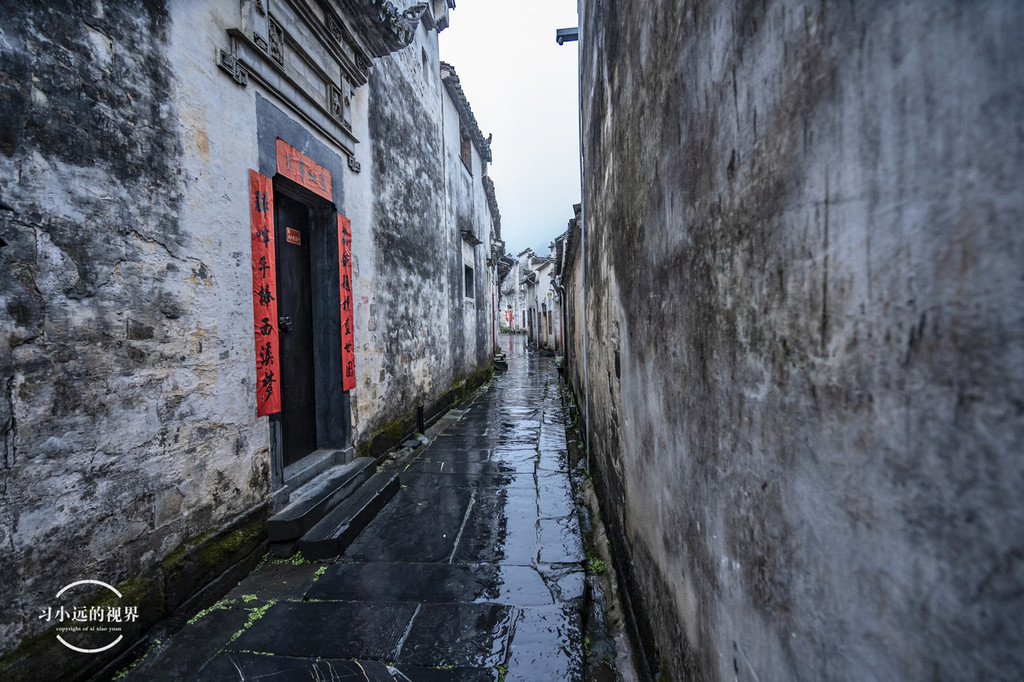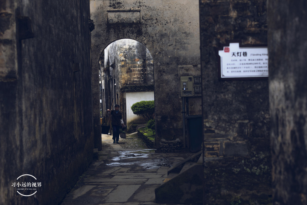 下雨天的西递,会在狭窄的石板巷口迷路,这个时候除了一年四季不变的白墙黛瓦,还多了黄色和观景台的几点红。下雨的原因,这个石牌坊也有了几种色彩。