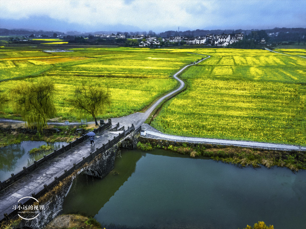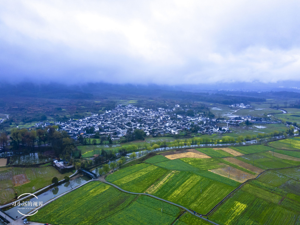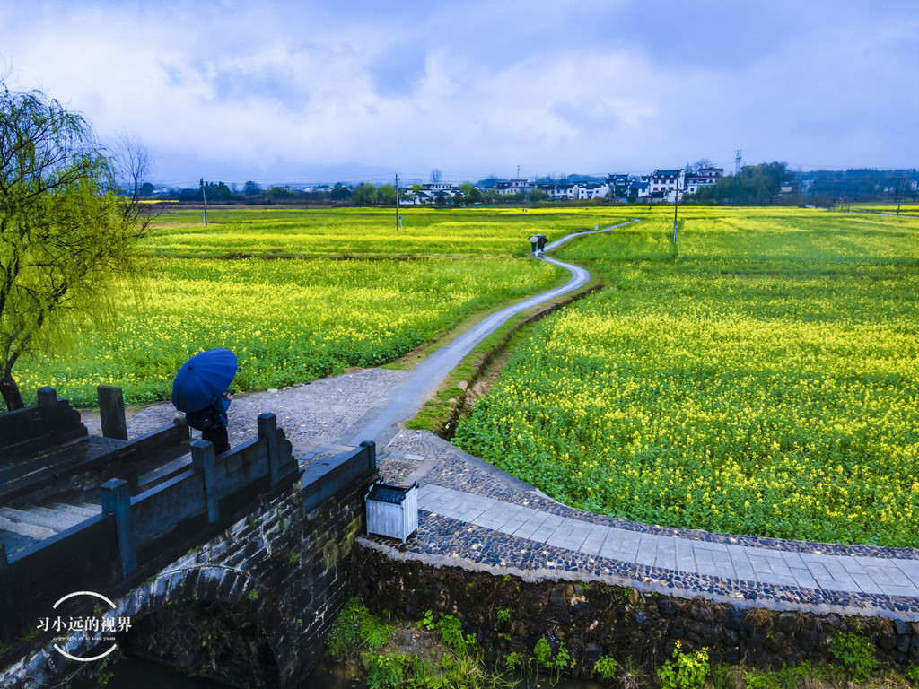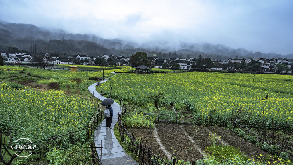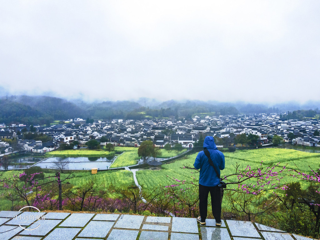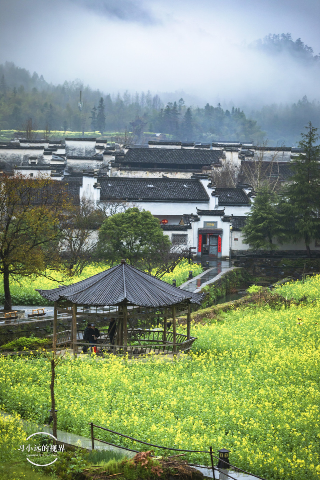 这次西递之行可以说是雨里度过了,晚上下,第二天早上还在下雨。不过也不妨碍我们早上去这里的观景台看西递的全景,去的路上还能经过一片片的油菜花,合着西递古村的建筑,特别像画里的景。
