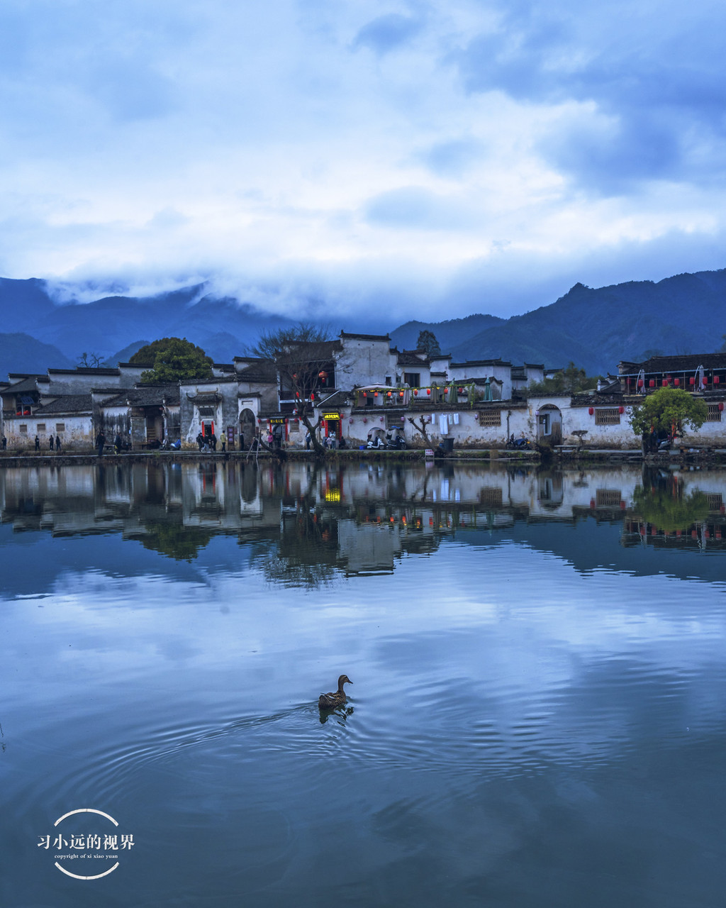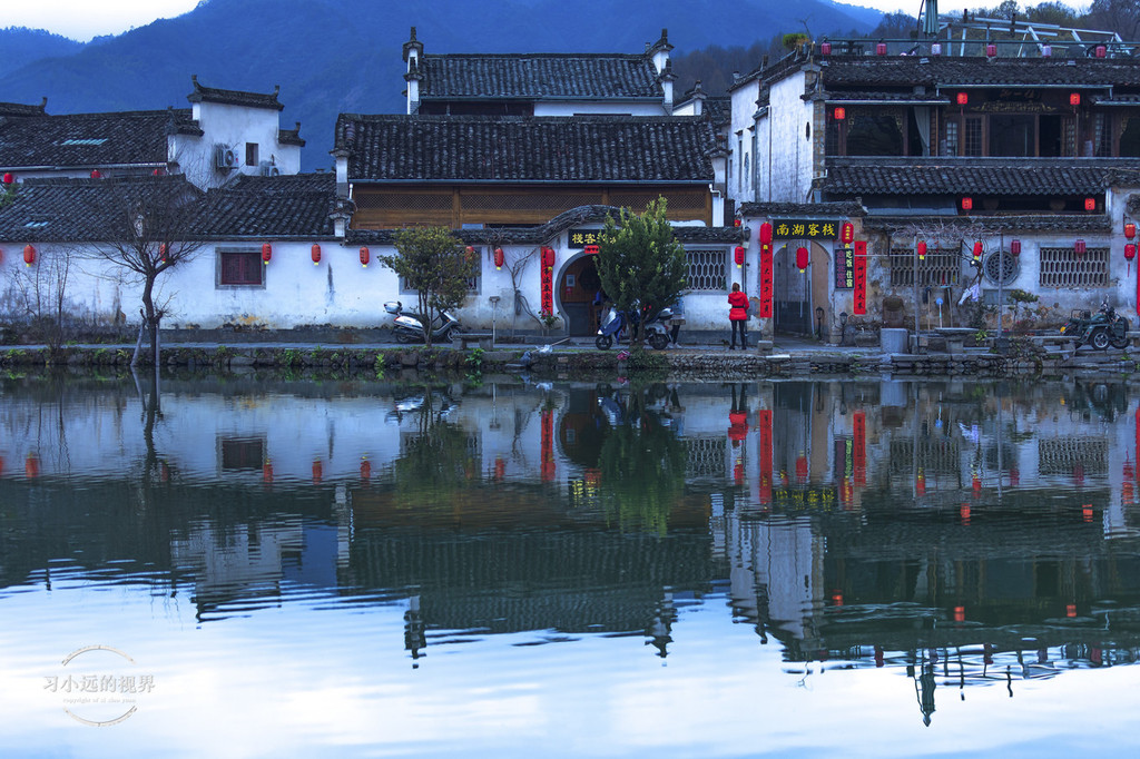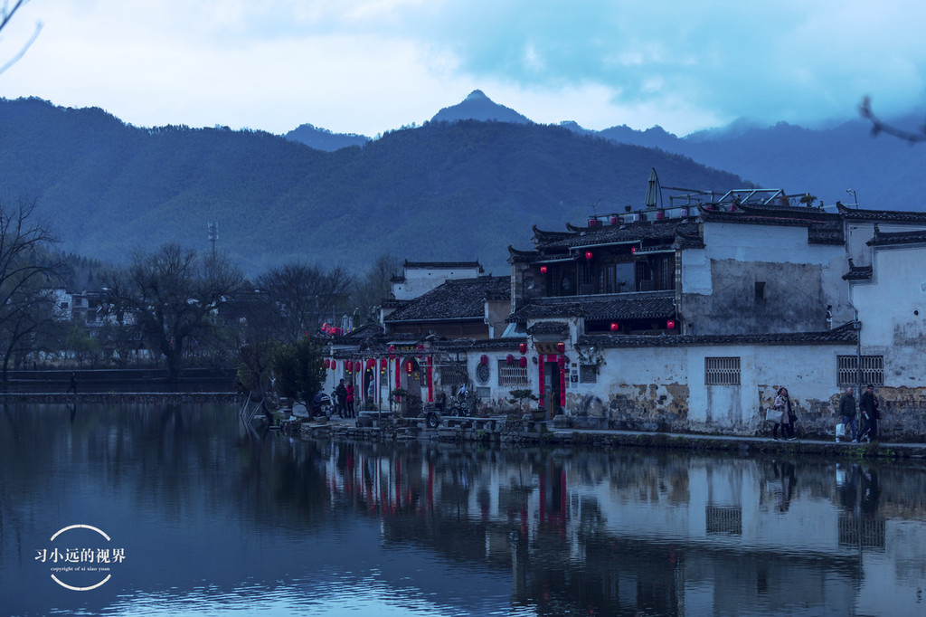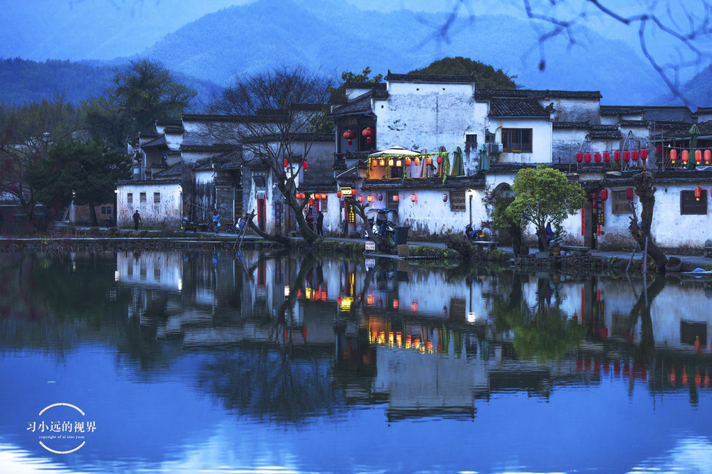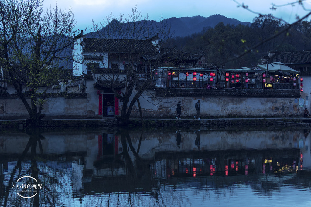 夜幕降临,红色的灯笼亮起,属于宏村的夜就开始了。此时村里的游客也基本都开始离开,只有选择住在景区里的人偶尔还会溜达溜达。我喜欢这个时候的安静,无风的时候,湖面平静,这样的蓝调子看着非常舒服。